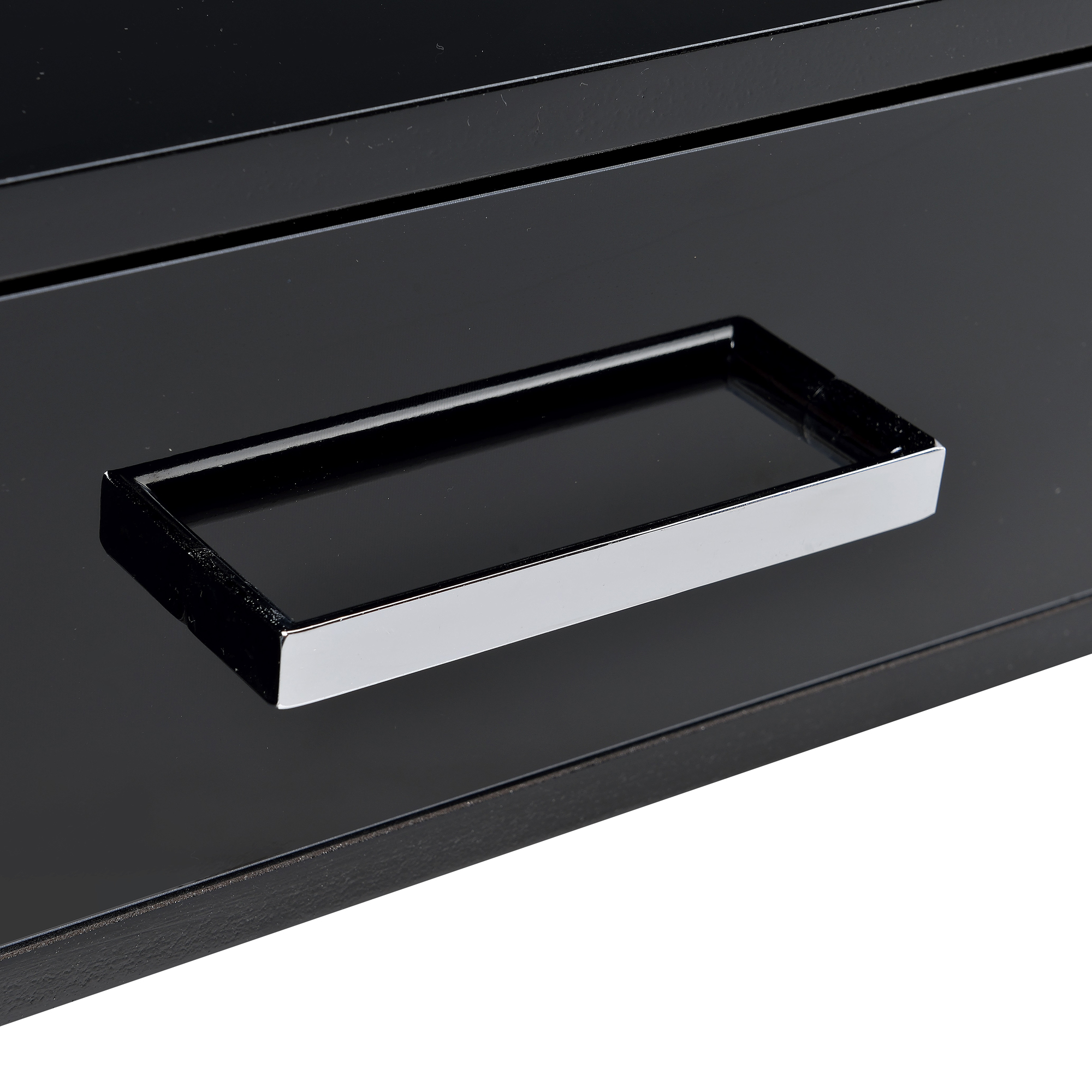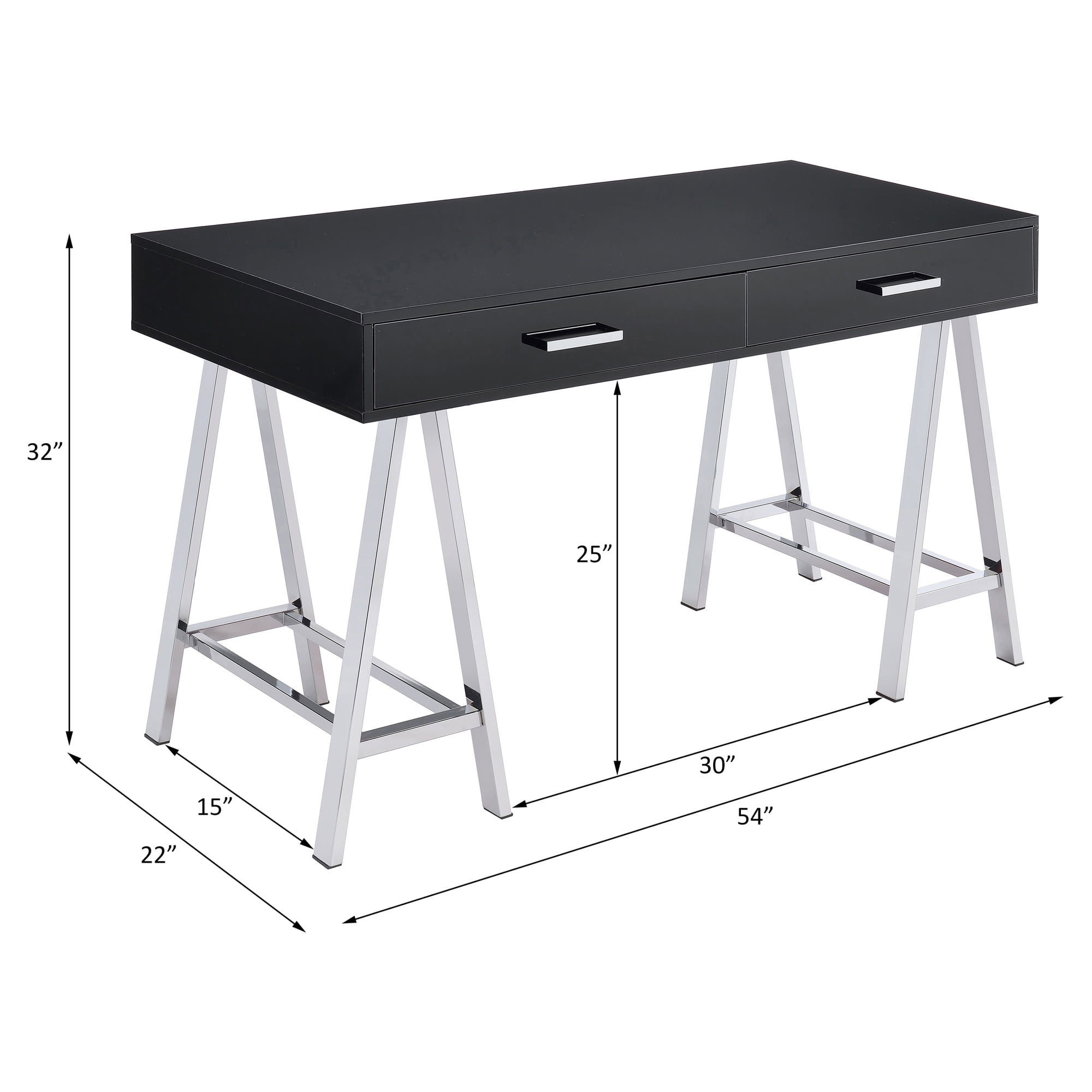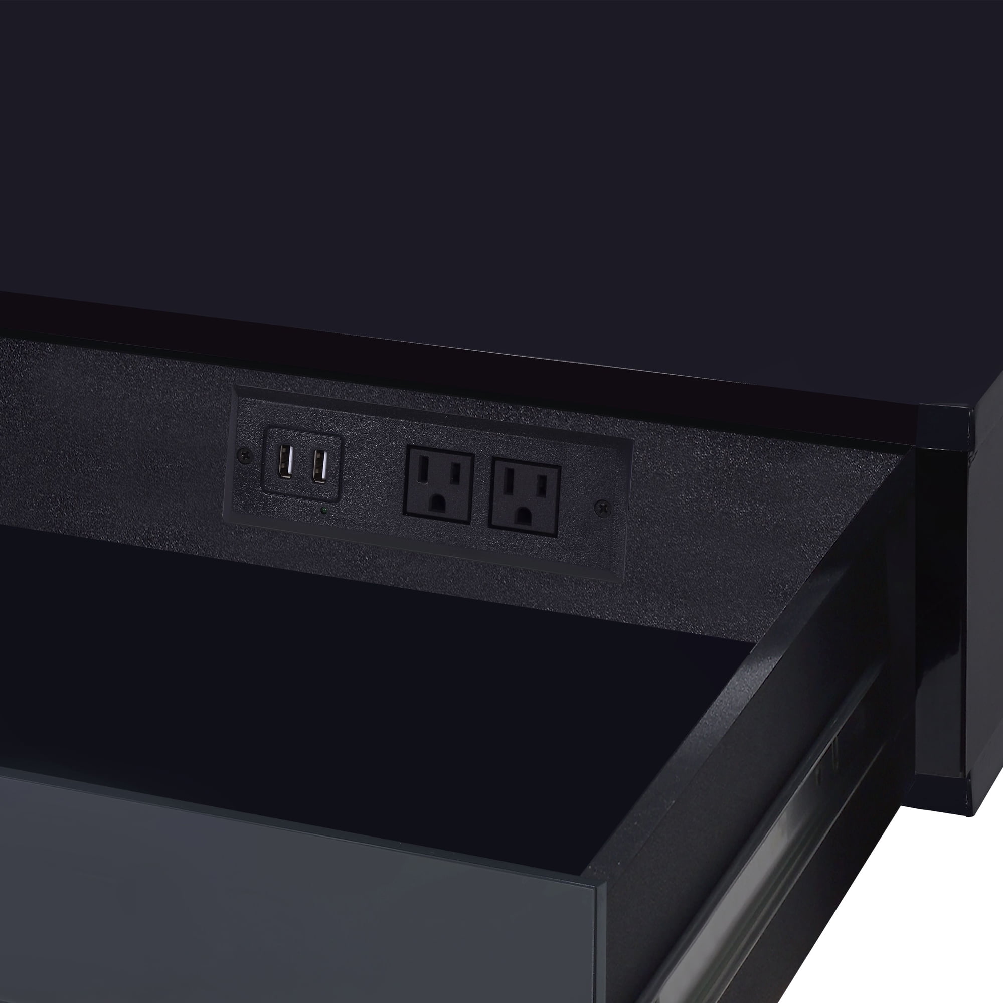 Rectangular table top Built-in USB port and plug Single bar handle drawer 3/4 Extension Drawer Glide Side metal drawer glide Floor clearance: 25″ Number of drawer: 2 Drawer dimension: 24″W x 15″D x 3″H Knee space dimension: 30″W x 15″D x 25″H Weight capacity: 220 lbs Assembly required