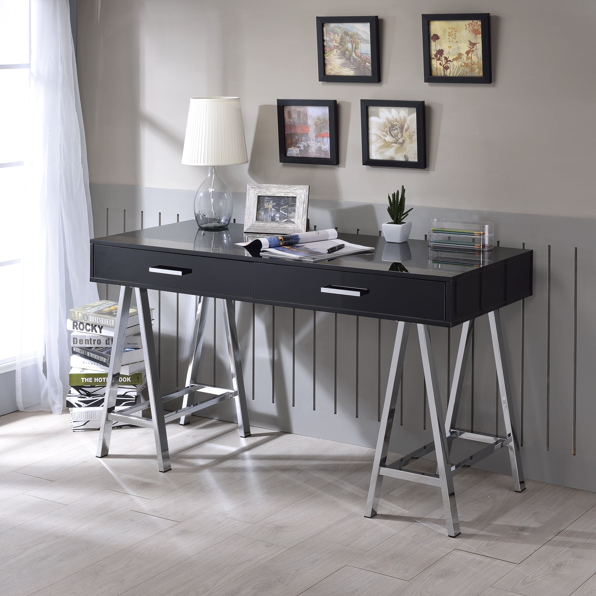ACME Coleen Writing Desk in Black High Gloss and Chrome