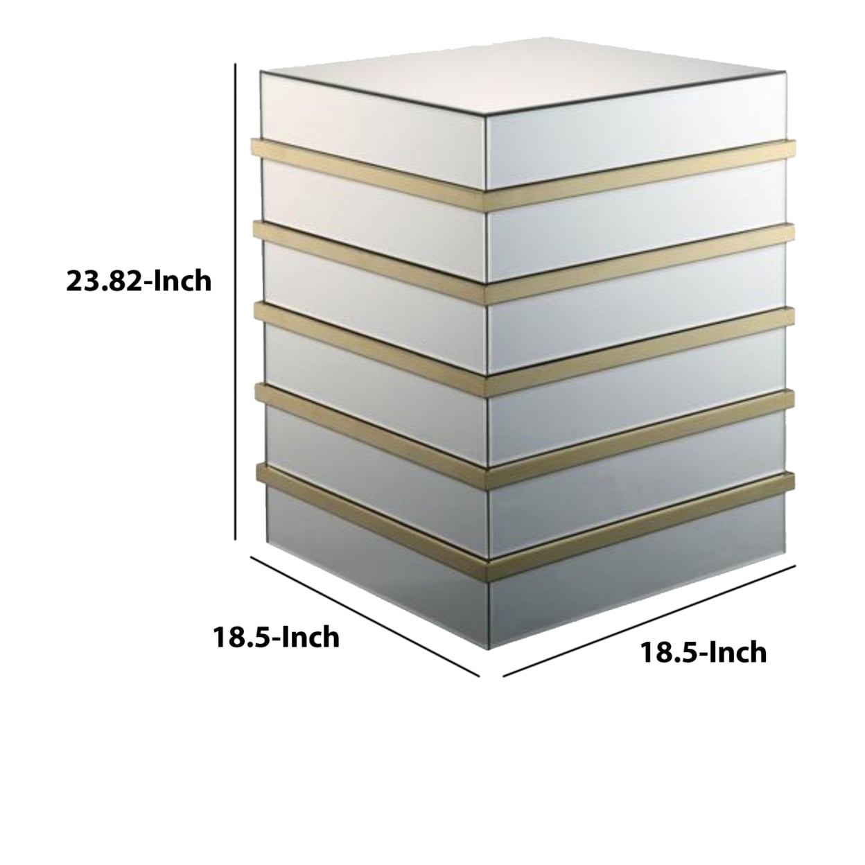 Contemporary Design: Sleek and modern aesthetic enhances any living space. Mirrored Top & Base: Fully reflective surfaces add depth and sophistication. Gold-Trimmed Detailing: Elegant accents provide a luxurious touch. Six-Layer Geometric Structure: Unique design makes it a striking conversational piece. Titanium Stainless Steel Base: Ensures durability while maintaining a stylish appeal. Versatile Functionality: Ideal for use as an end table, accent table, or decorative piece. Collection: Part of the Dominic collection, designed for indoor use.
