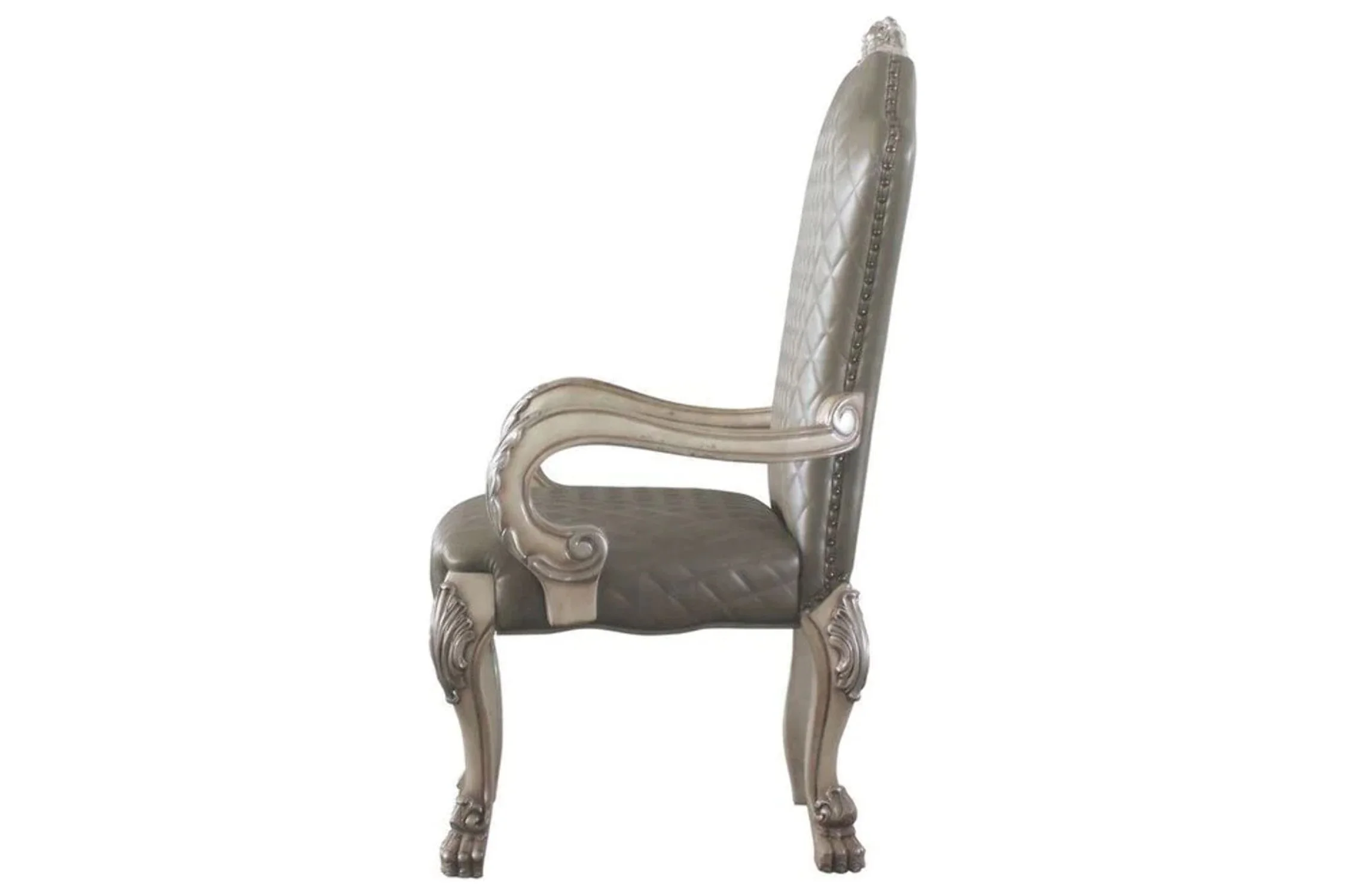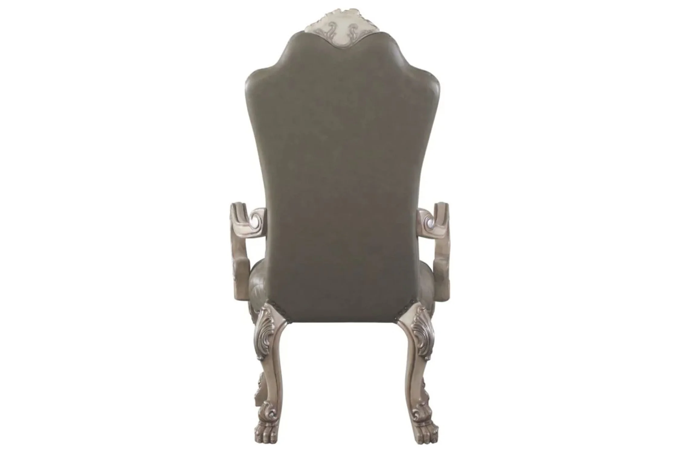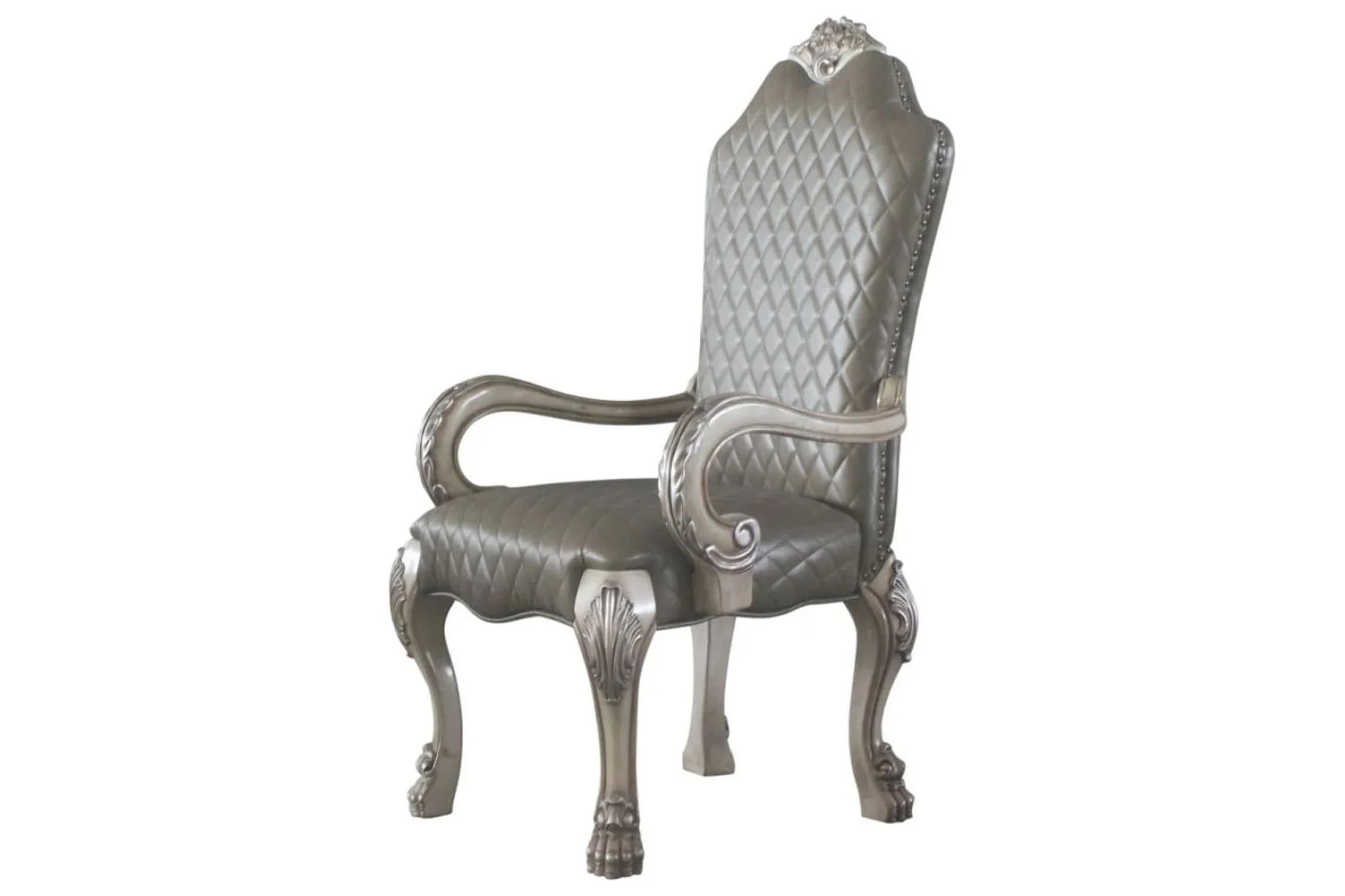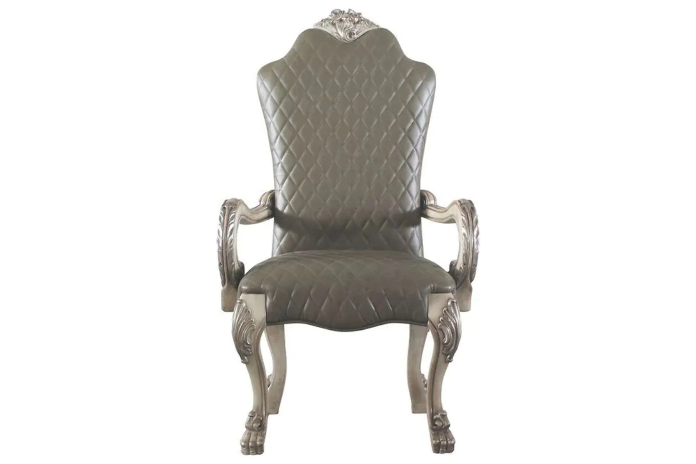 A modern upgrade to a traditional French design – complete the look of any room, whether it is your office, study or dining room, with the commanding presence of the Dresden Arm Chair. Impart an air of regality, sophistication, style and poise with its intricate detailing, from the bone white carvings, stud trim, and oversized claw legs to the rich upholstering of the warm grey quilted leather. Features: Padded Seat and Back Nail-head Trim Arched Backrest Arm Chair Stationary Seat Floral Crown Specifications: Product Dimensions: 26″L x 27″D x 46″H Product Weight: 66 lbs