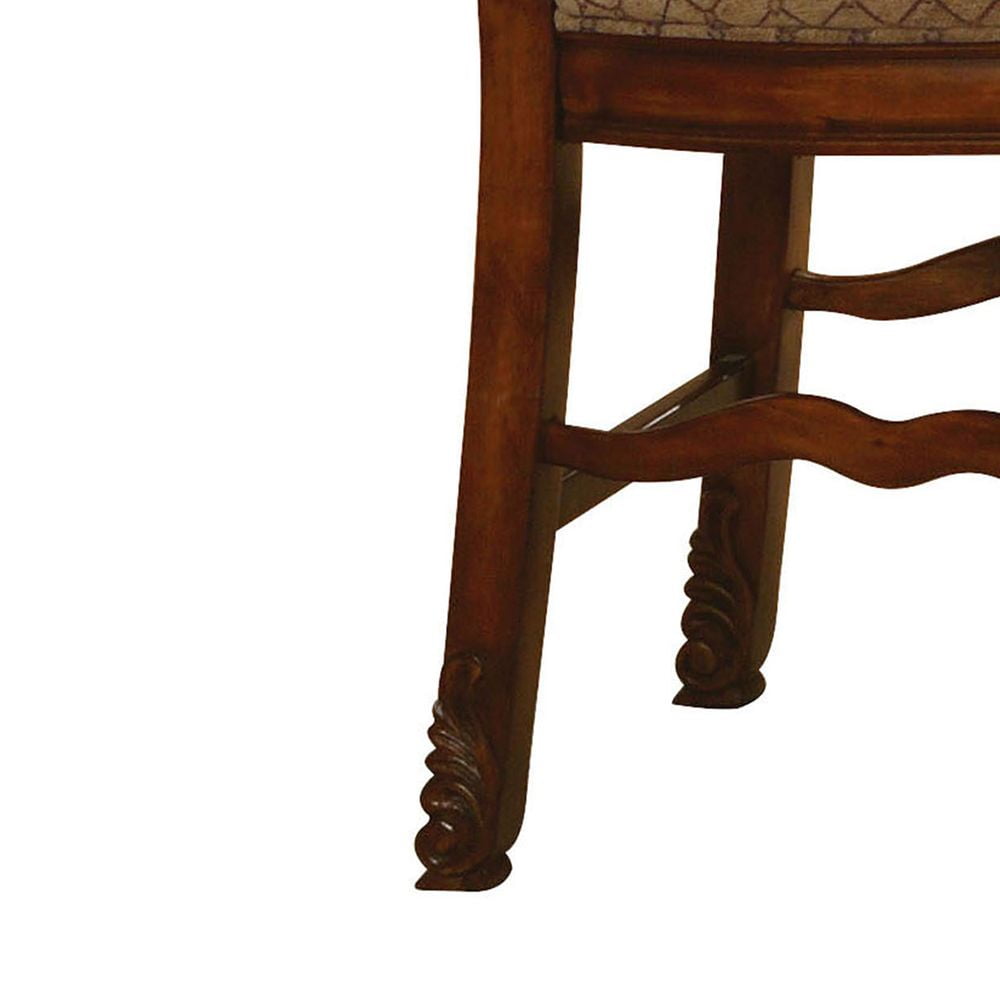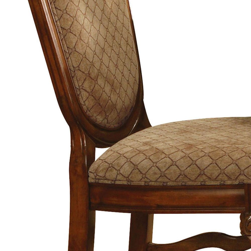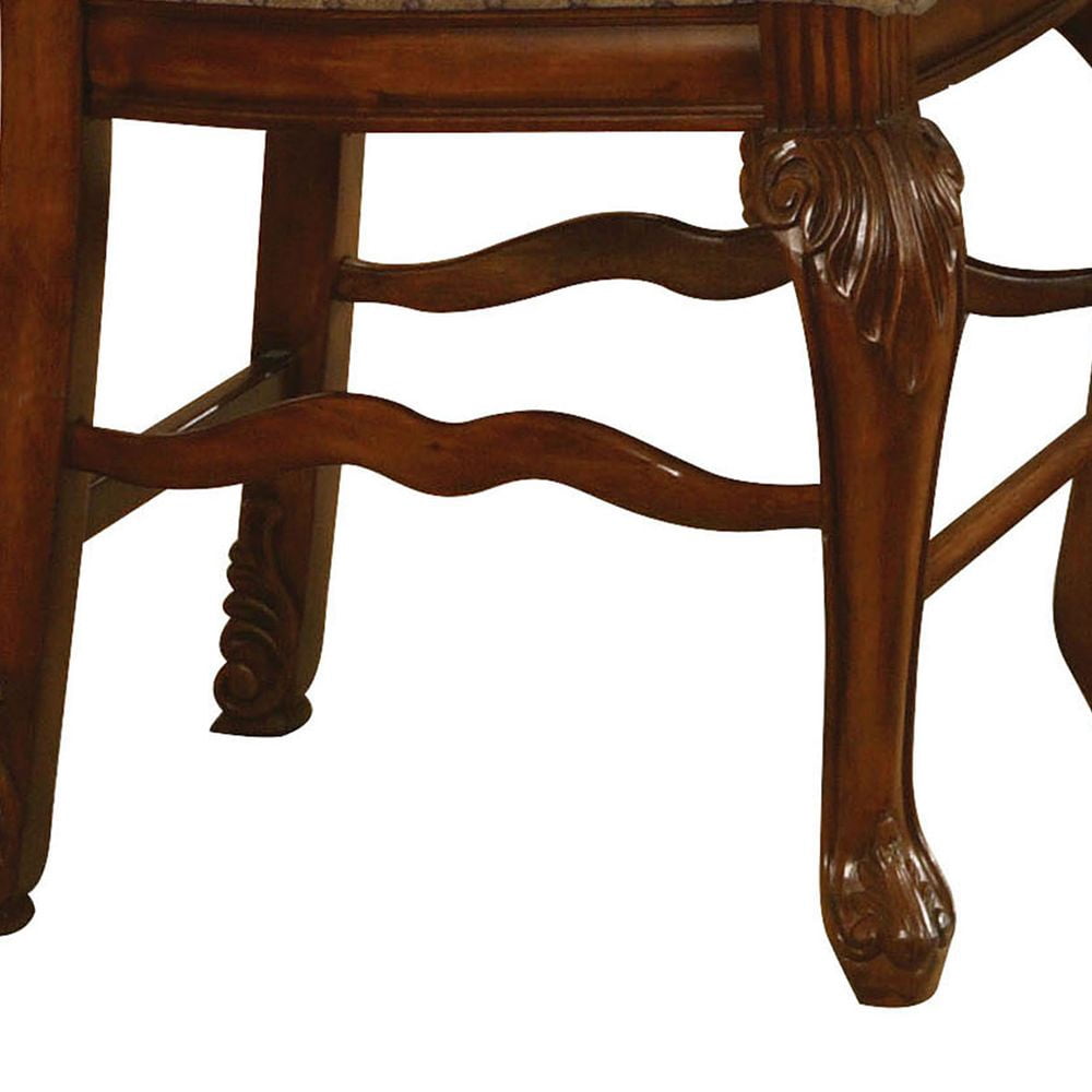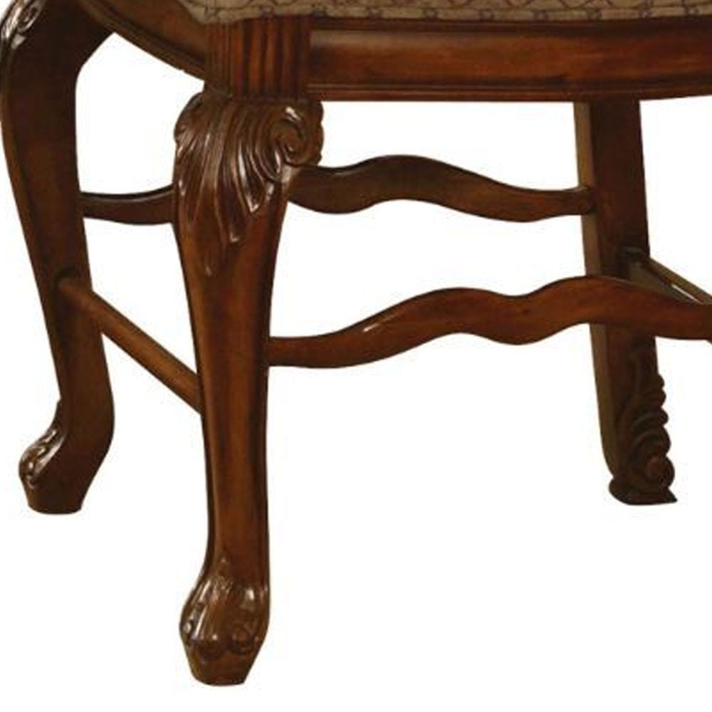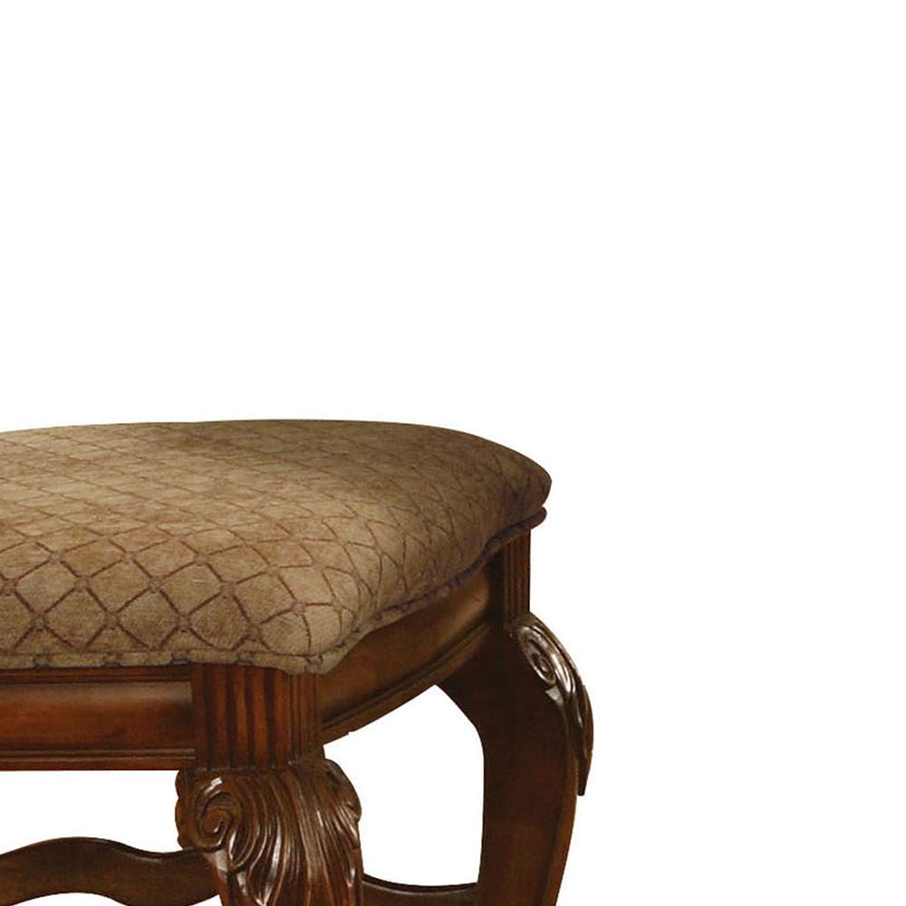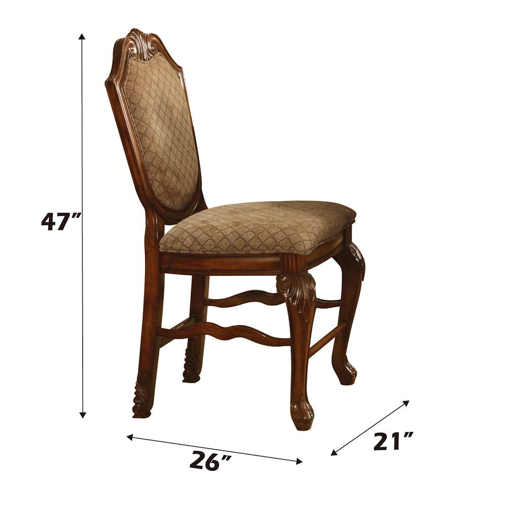 ACME Chateau De Ville Counter Height Chair (Set-2), Fabric & Cherry The Chateau De Ville counter height chairs are great for kitchen counters or living room bar tables. This pair of chairs come supported by a fine hardwood frame with two queen anne front legs and two straight back legs. The backrest arches to a peak with a floral-style medallion at the top. Cherry brown finishes the wood, highlighting the beautiful carved details. Thick foam padding makes the backs and seats comfortable, upholstered in a fine fabric blend (beige, with a thin grid pattern). KD, Armless Chair (High Backrest) Stationary Seat: Counter Height Padded SEAT & BACK: Fabric Cushion with Welt-Trim (Grid Pattern) Arched Backrest: Fabric, Wood Trim with Raised Motifs Wooden Apron Seat: Molding Trim Wooden Queen Anne Leg with Raised Floral Motifs – Color: Fabric & Cherry – Style: Traditional – Seat Height: 24 – Color Family: Red – Collection Name: Chateau De Ville – Item Height: 47 – Catalog Finish: Fabric & Cherry – Product SIZE (Depth): 26 – Product SIZE (Length): 21.25 – Materials (Type of Wood): Fabric, Wood (Bentwood), Foam – Size Notes: OveraL →Storage →: Armless – Color Code Vendor: Fabric (Seat & Back Cushion) • Cherry