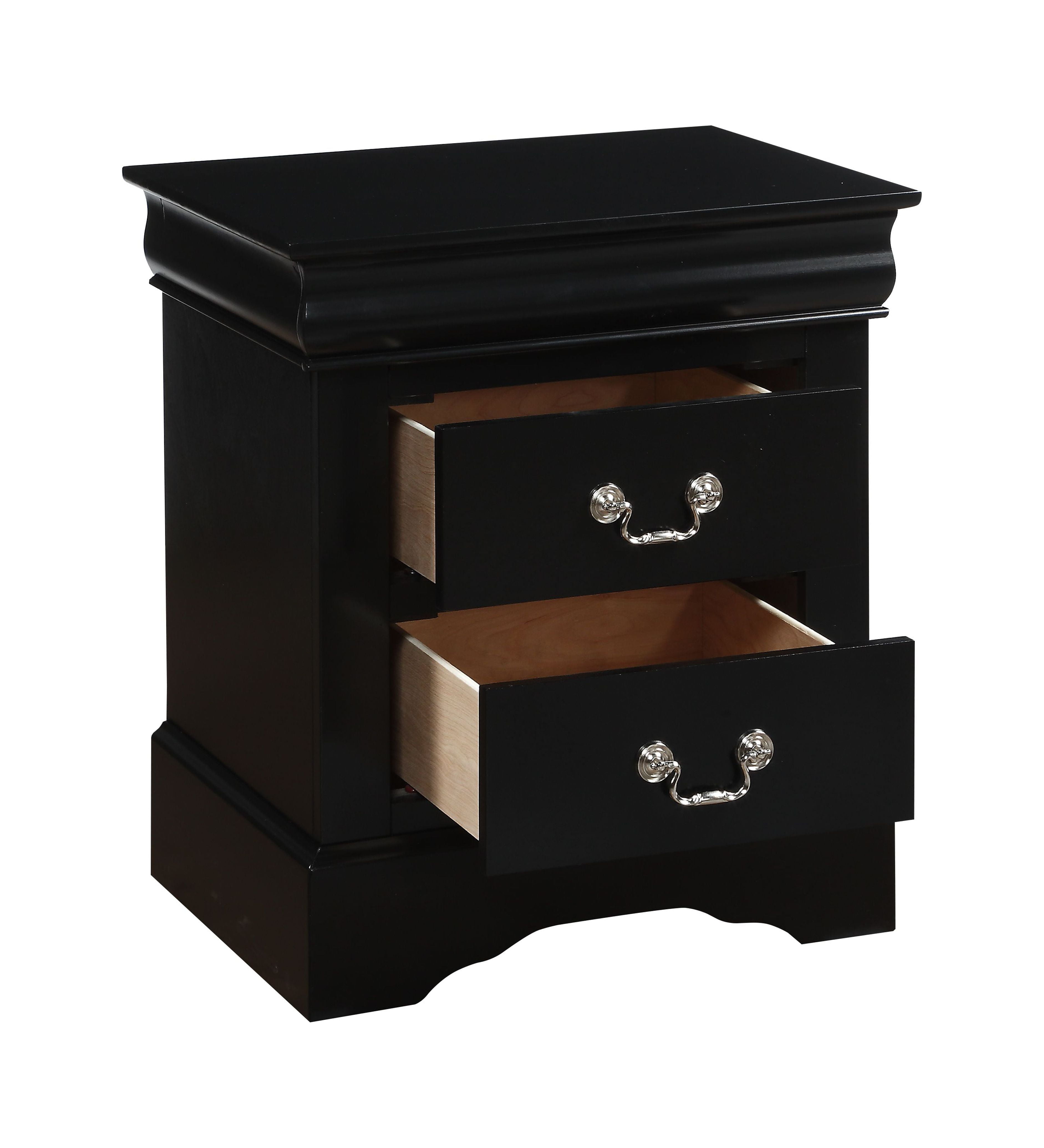 Louis Philippe III Nightstand, Black: Part of the Louis Philippe III Bedroom Collection Black Finish Pine Wood with Veneer Dimensions: 22″L x 16″W x 24″H Two Drawers Drawer Size: 14″L x 13″W x 5″H No Hidden Drawer Center Metal Glide 2/3 Extension French Dovetail on the Back Construction Brushed Nickel Metal Handle Model# 19503 Also Available in Cherry #19523, Antique Gray #22503, and White #24503 Frequently Buy Together: California King Bed #19494CK, Eastern King Bed #19497EK, Queen Bed #19500Q, Full Bed #19508F, and Twin Bed #19510T