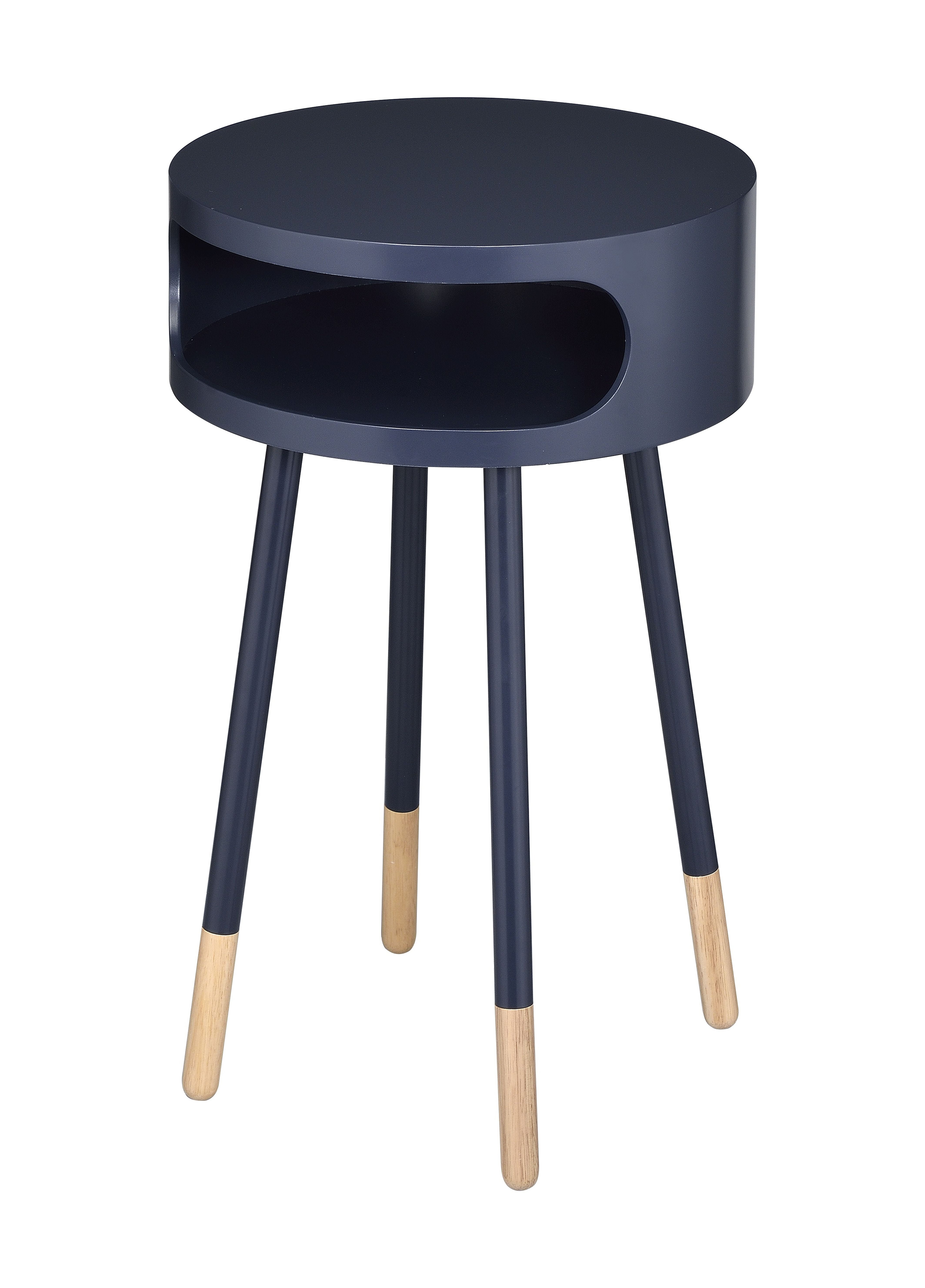Sonria End Table, Black & Natural This Sonria round end table offers a contemporary take on a stylish retro design, ideal for your living room, family room, or bedroom! With its one shelf, you can conveniently store remote controls or other small items in the open compartment. The natural wood featured at the base of the legs provides that extra flare to bring any room together. Some assembly required. End Table