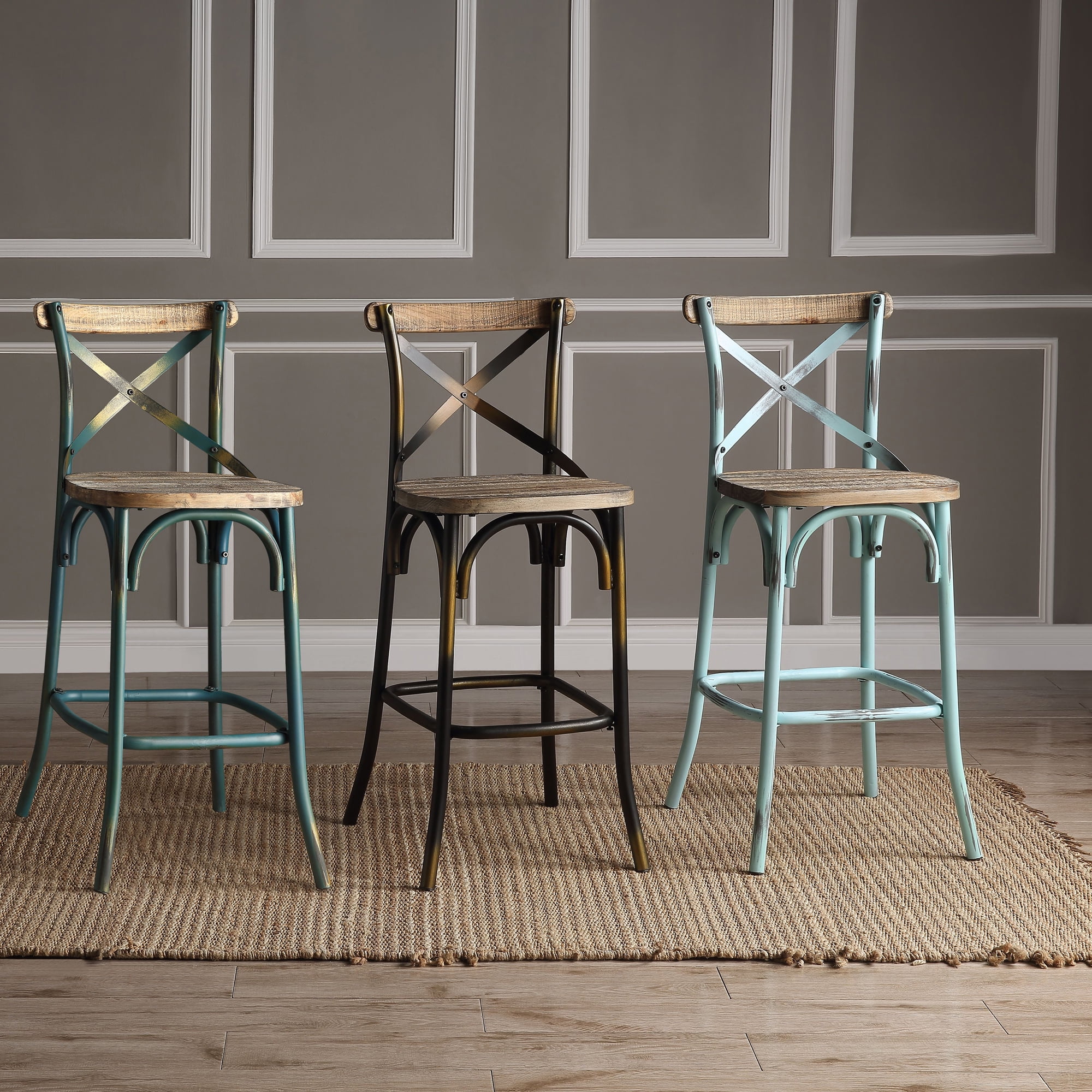 Vintage-inspired bar chairs designed to evoke nostalgia and warmth Crafted with a captivating blend of reclaimed wood and metal aesthetics, exuding an authentic industrial appeal The timeless “X” style backrest adds a touch of elegance and simplicity, reminiscent of classic design elements Each chair boasts a solid wooden seat, ensuring both durability and rustic charm for years to come The slightly flared four-legged base provides stability and sturdiness, enhanced by strategically placed footrest supports for added comfort during long hours of seating Available in a captivating array of finishes, including Antique Red, Antique Turquoise, Antique Sky, and Antique Copper, allowing you to choose the perfect hue to complement your existing decor or make a bold statement in any space.