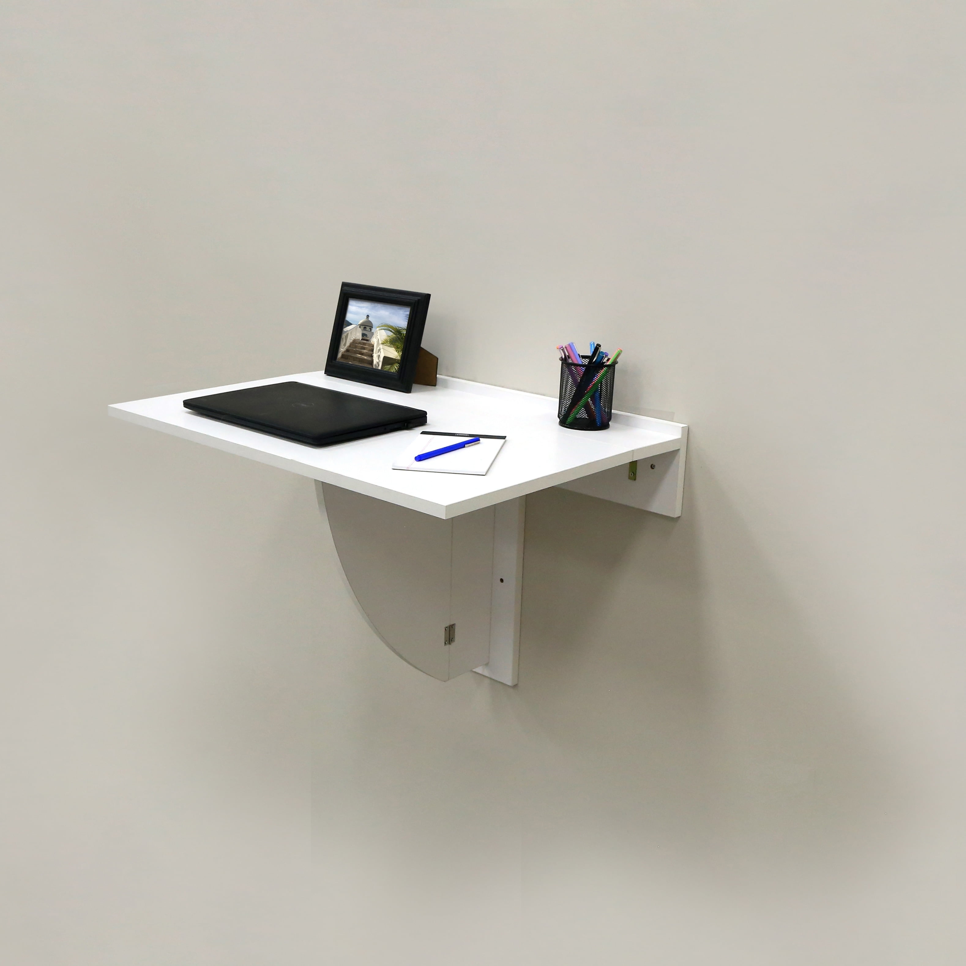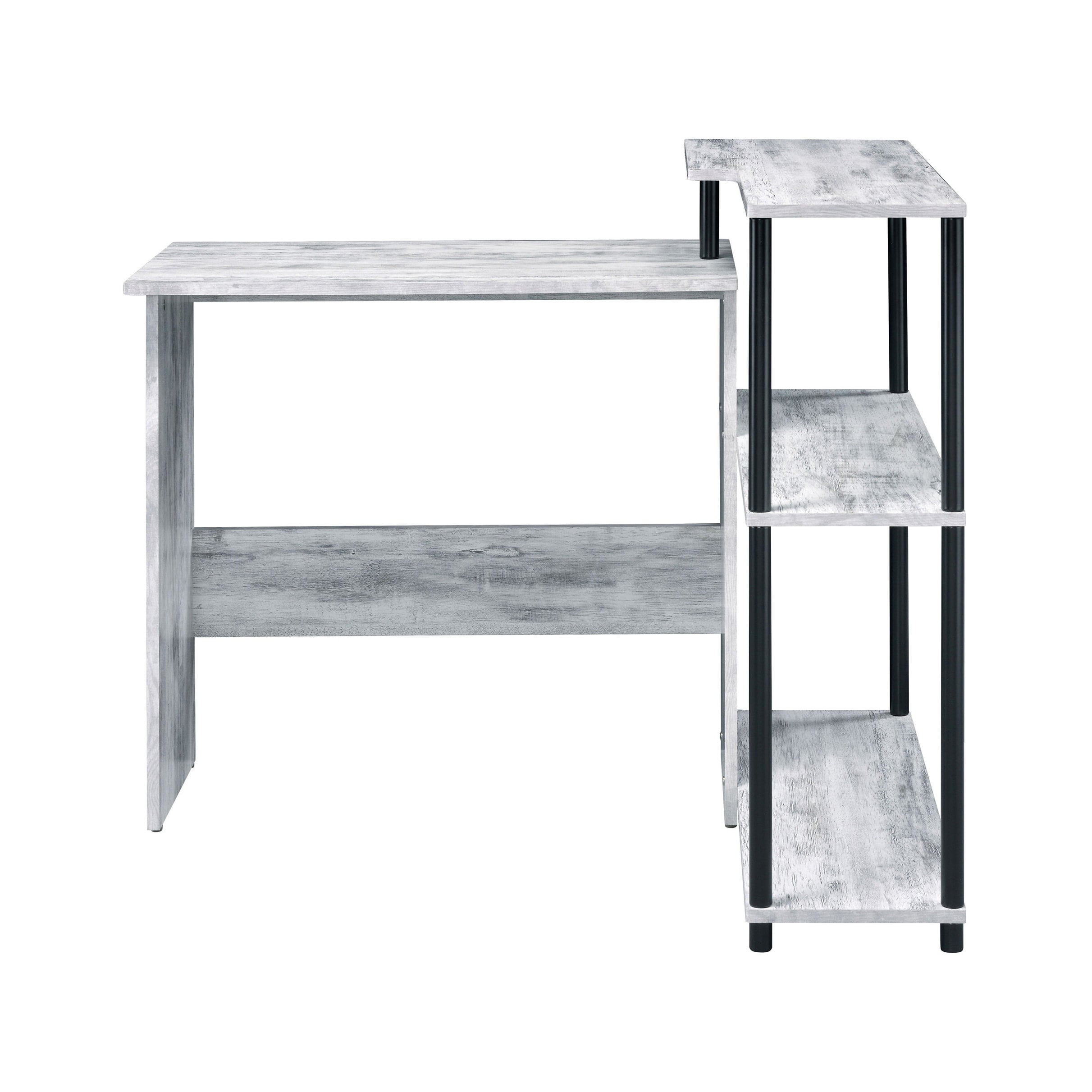 L-shaped writing desk Desk with side shelf attached Number of shelf: 3 Leg space dimension: 28″W x 11″D x 28″H Weight capacity: 44 lbs Materials: Paper Veneer, Particle Board, Metal