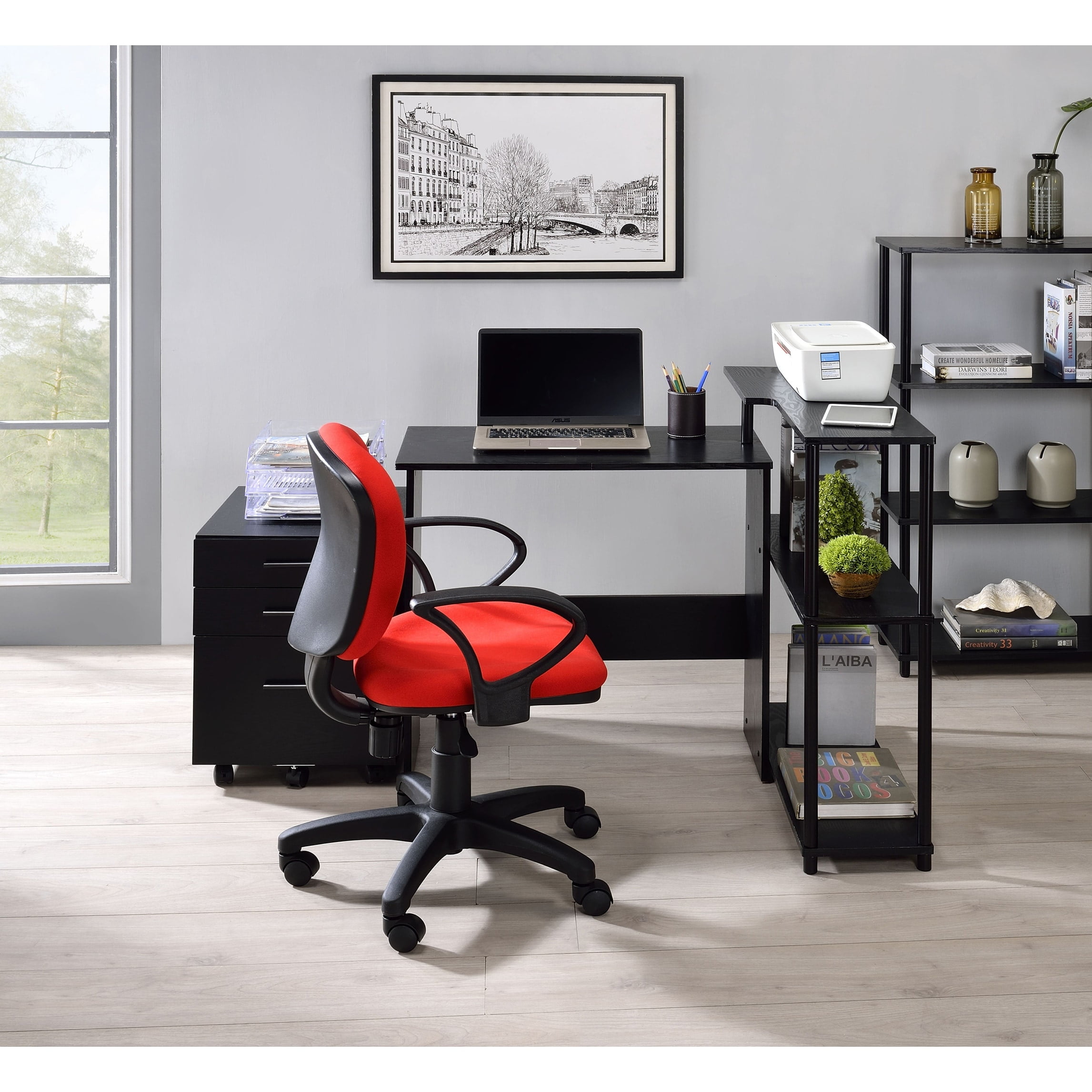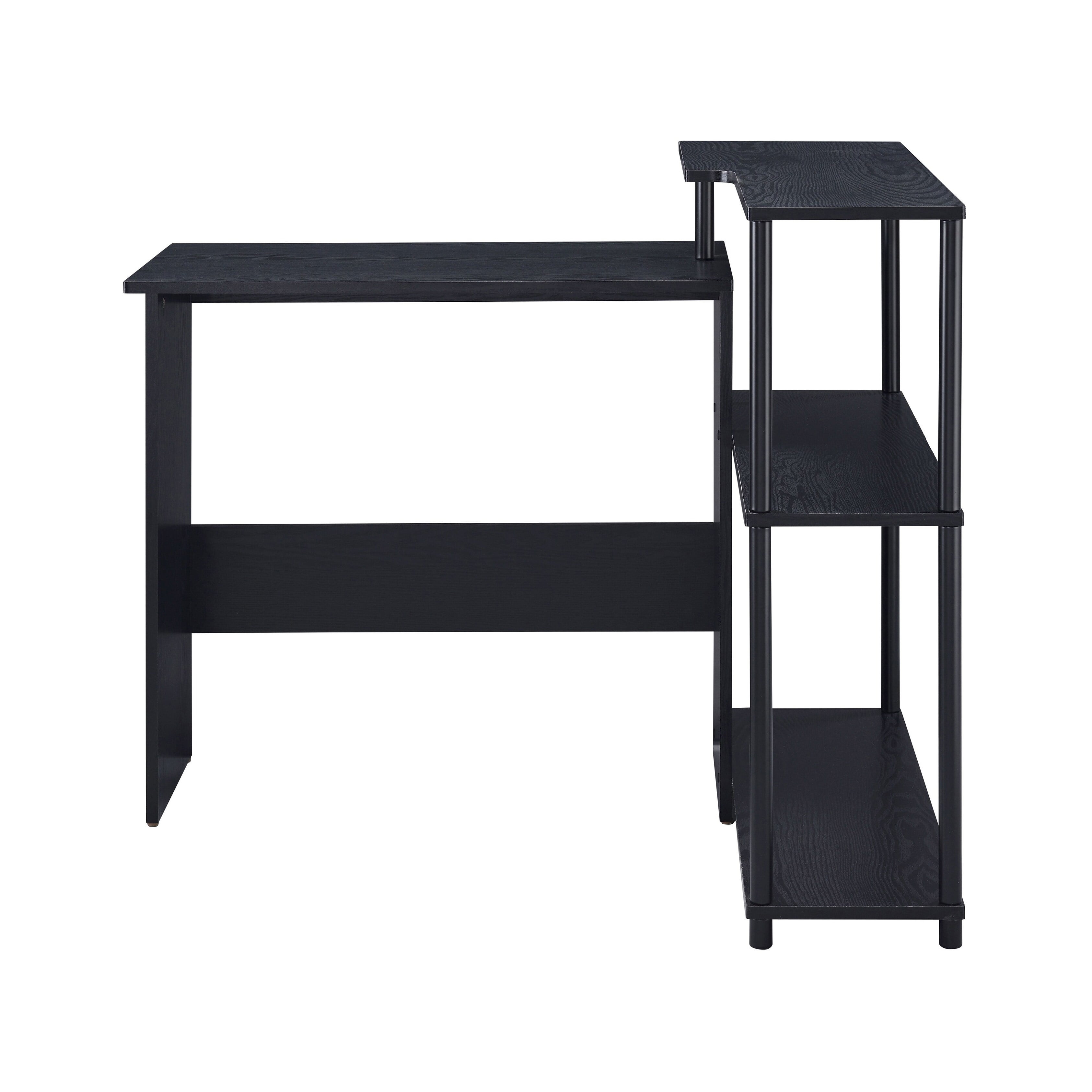 Warm, cozy while remaining functional, the Ievi Desk helps you find a good balance between work and life. It features a low bookshelf built into the right side, providing two open storage compartments for book or file organization. An elegant all wood design is used on desk and shelves, while metal frame secures the bookshelf to the desk. Complete your project or enjoy a leisure reading with the Ievi Desk. Features: L-shaped writing desk Desk with side shelf attached Number of shelf: 3 Leg space dimension: 28″W x 11″D x 28″H Weight capacity: 44 lbs Materials: Paper Veneer, Particle Board, Metal Specifications: Desk Dimensions: 39″W x 32″D x 34″H Product Weight: 40 lbs Color/Finish: Black Shelf Weight Capacity: 11 lbs Weight Capacity: 44 lbs Assembly Required: Yes