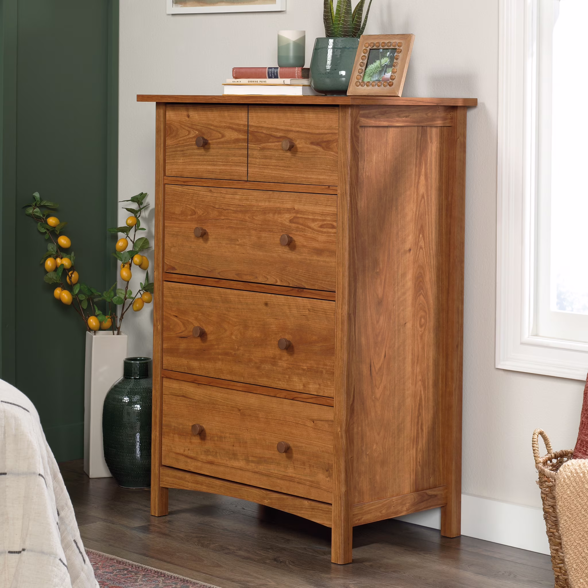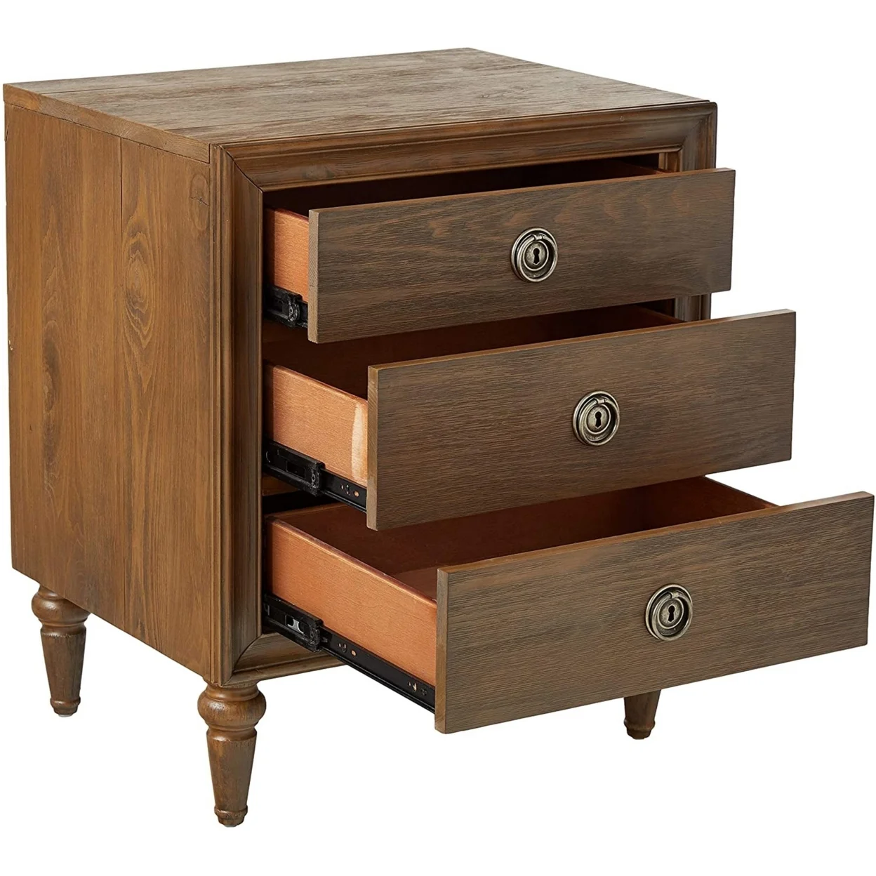Natural ambiance follows a versatile finish and woodgrain effects of this quaint three-drawer nightstand, an optimal selection for an antique-inspired bedroom setting. Reclaimed oak finish wood adds distinction to this nightstand with three drawers, including a felt-lined top drawer. Drawer operation is smooth and easy with metal side glides and full extension ball bearings. English dovetail front and back construction joins wooden turned tapered legs, embellished with classic metal hardware. Features: Materials: Cypress wood, MDF, Particle Board Glide side metal (full extension ball bearing) Dovetail English front and back Felt lined top drawer Wooden turned/tapered leg: 7″h (166mm) Top drawer inner dimension: 18″l x 13″w x 3″h Middle and bottom drawer inner dimension: 18″l x 13″w x 4″h Specifications: Nightstand Dimensions: 24″W x 19″D x 28″H Product Weight: 55 lbs Color/Finish: Reclaimed Oak Assembly Required: Yes