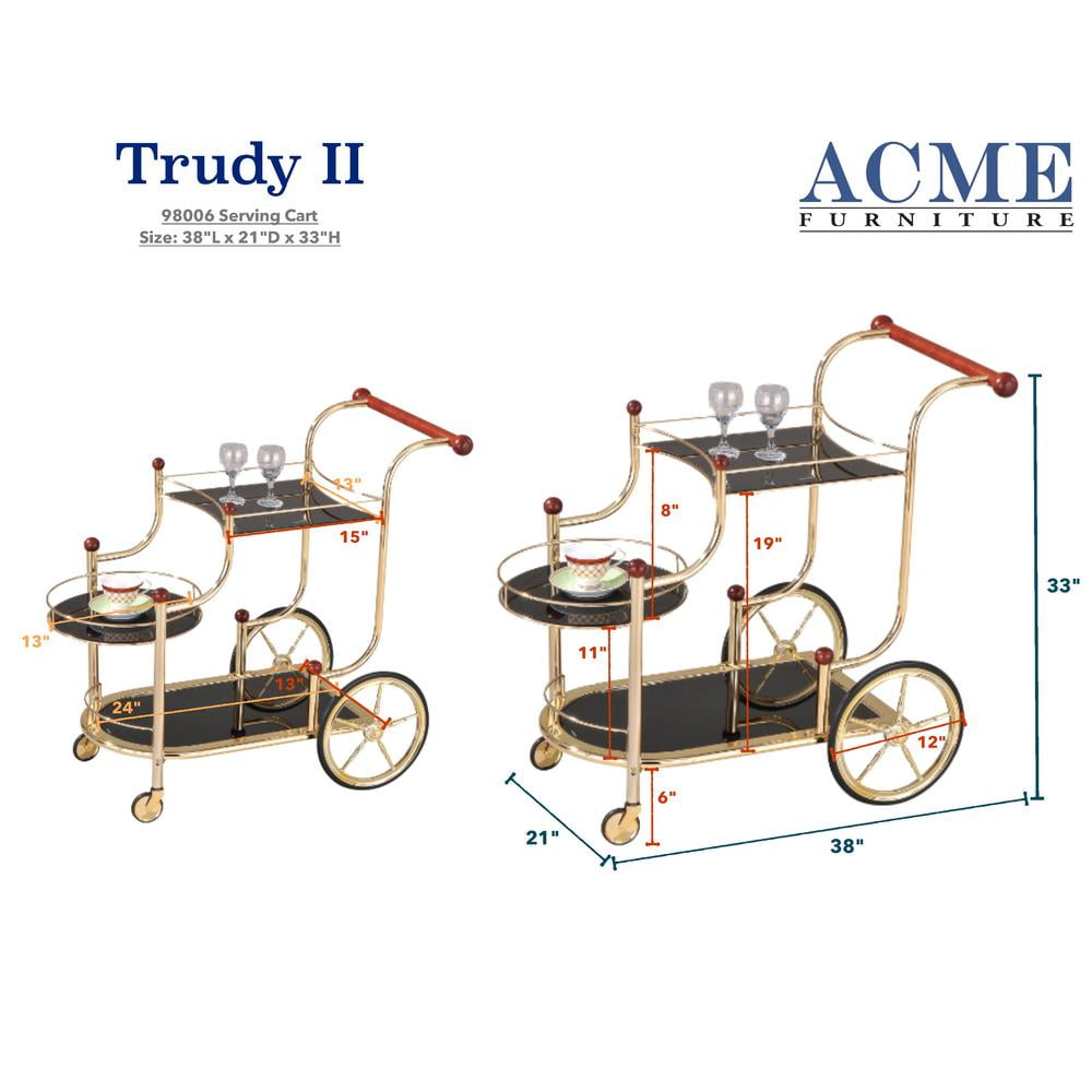 Serve meals fashionably with this lovely Lacy serving cart. Designed in gold plated metal pairs perfectly with dark black tempered glass for a look of refined sophistication. Three tiers easily accommodate trays and entrees, while wheels and wood handle make it simple to move this dainty design from one place to the next. Features: Finish: Golden Plated, Black Materials: Metal, Glass, Rubber Wood, Casters Contemporary Gold Plated Metal Black Tempered Glass 3 Tiers Specifications: Product Dimensions: 33″ H x 38″ W x 21″ D Product Weight: 25 lbs