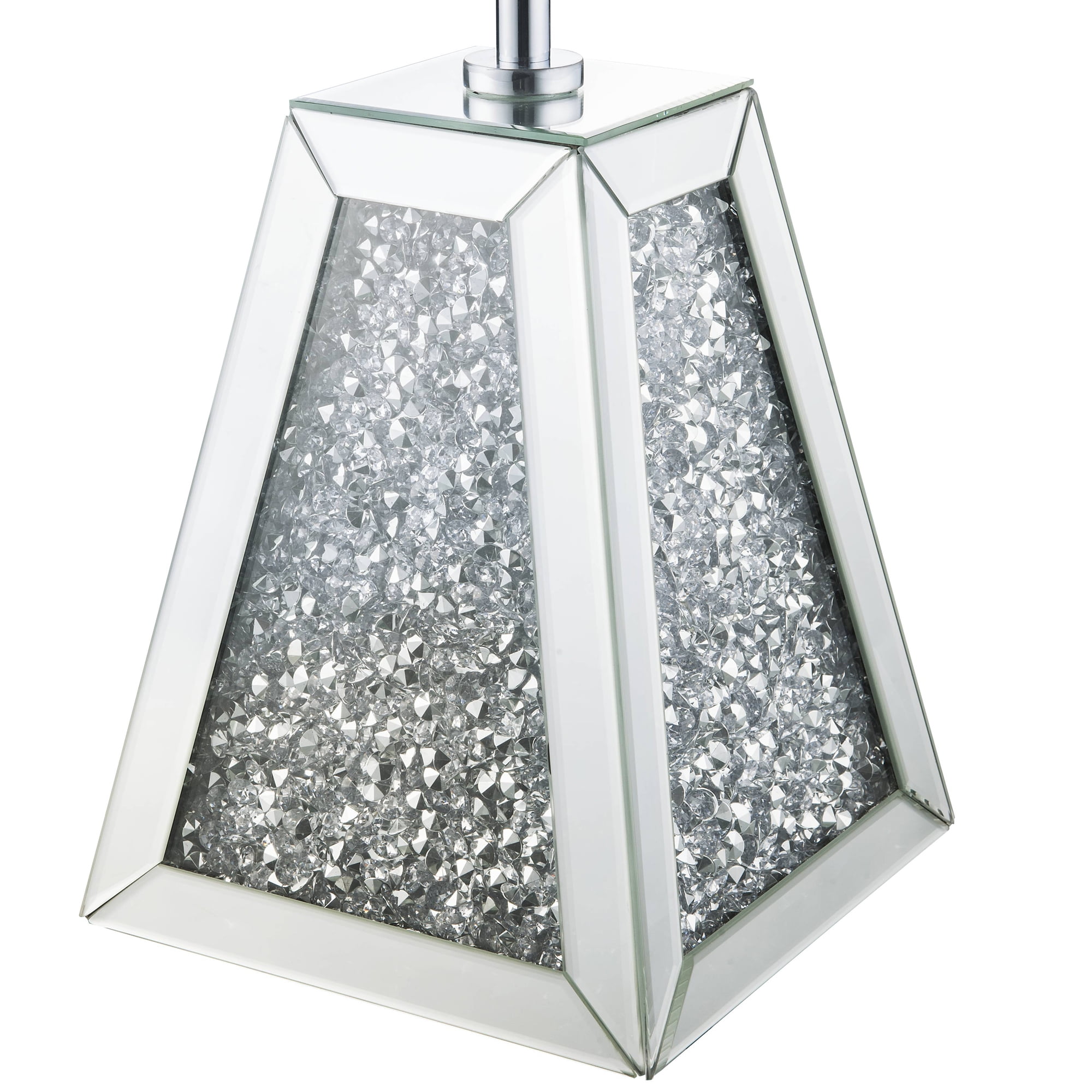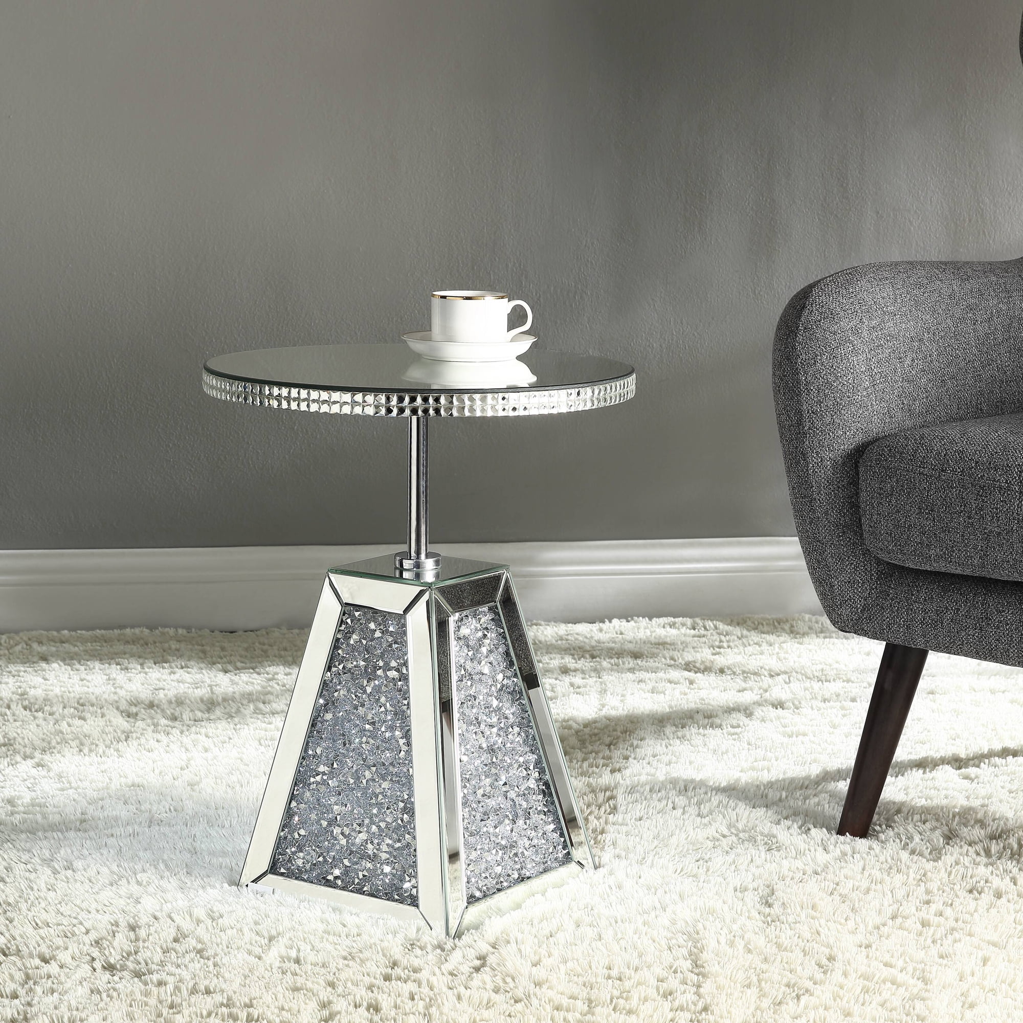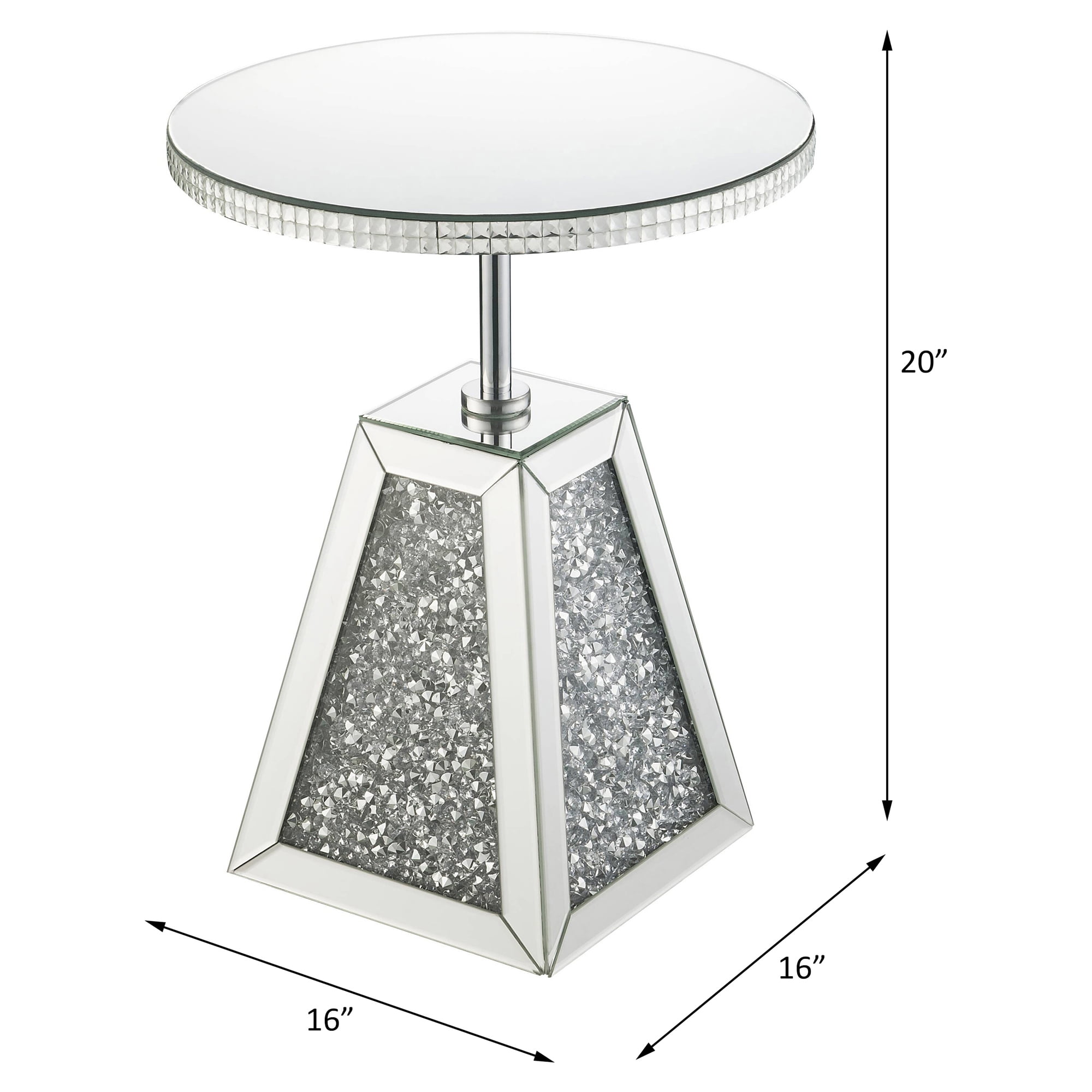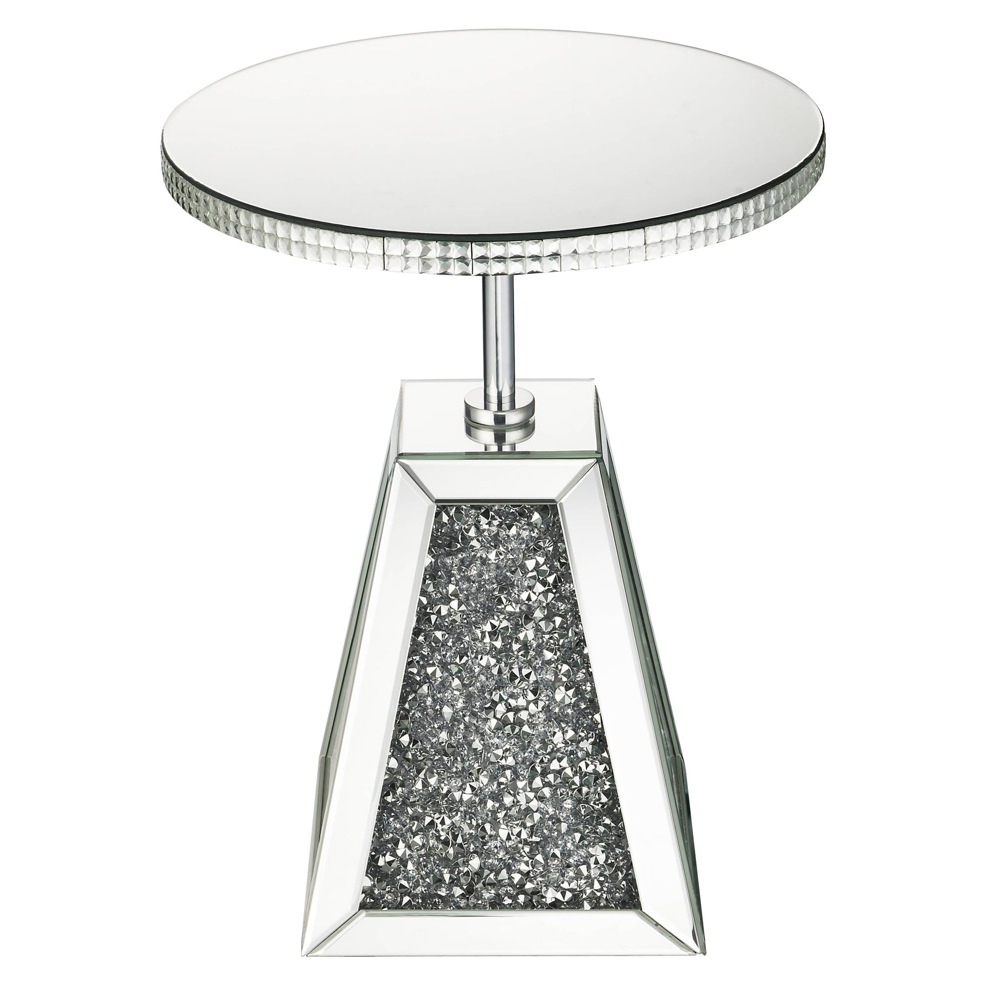 The Noralie occasional table is perfect for your modern grace home. This mirrored faux diamond pedestal features an elegant twist base. Place a lamp or plant on the rounded surface. Use in any room to enhance your décor.