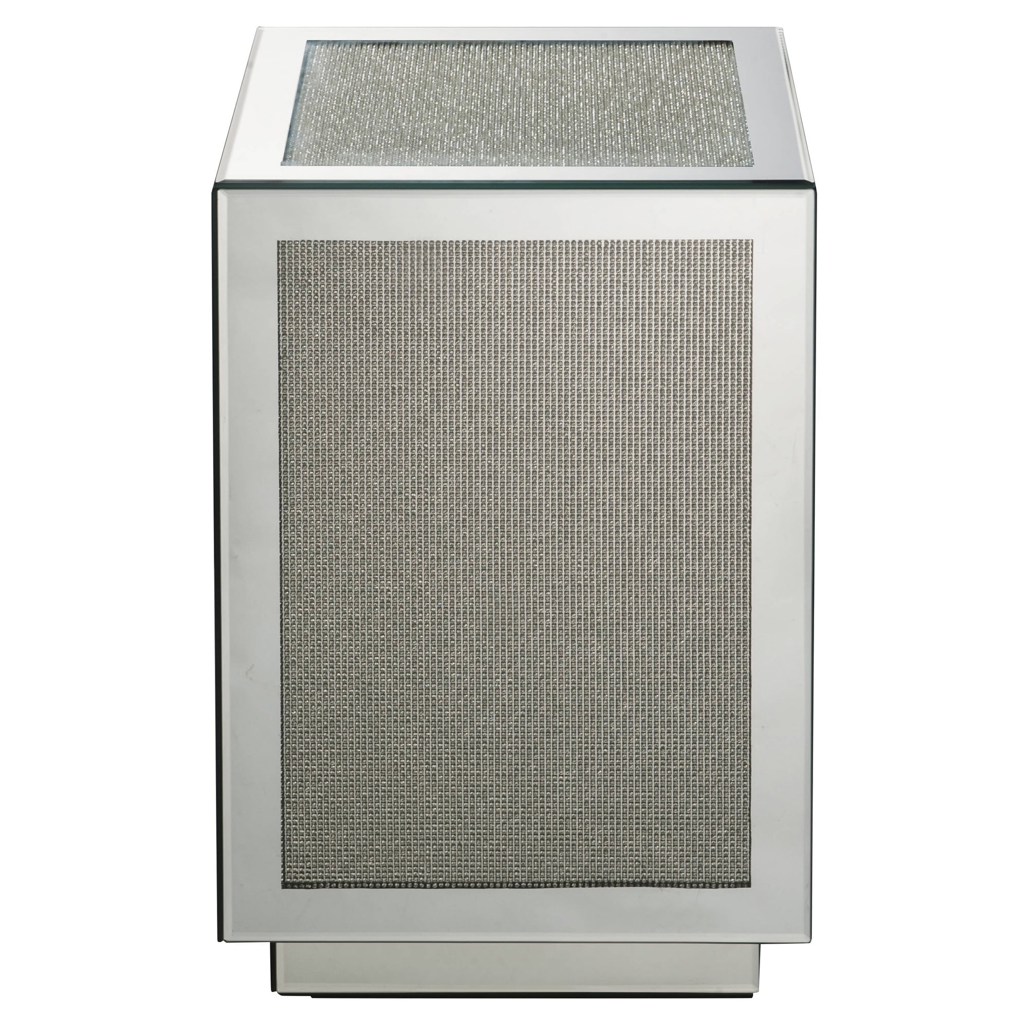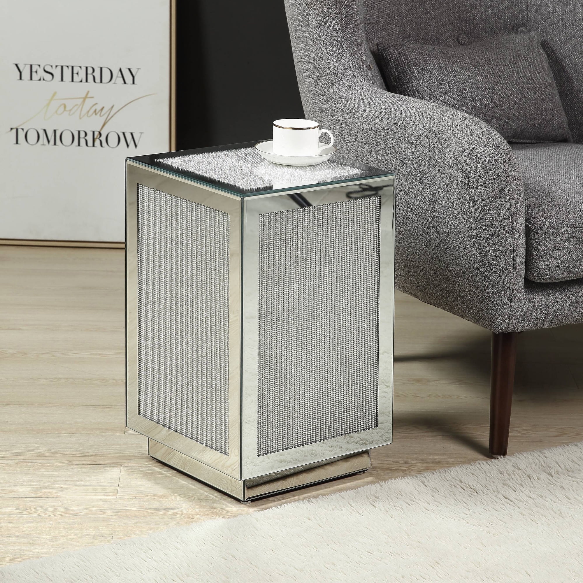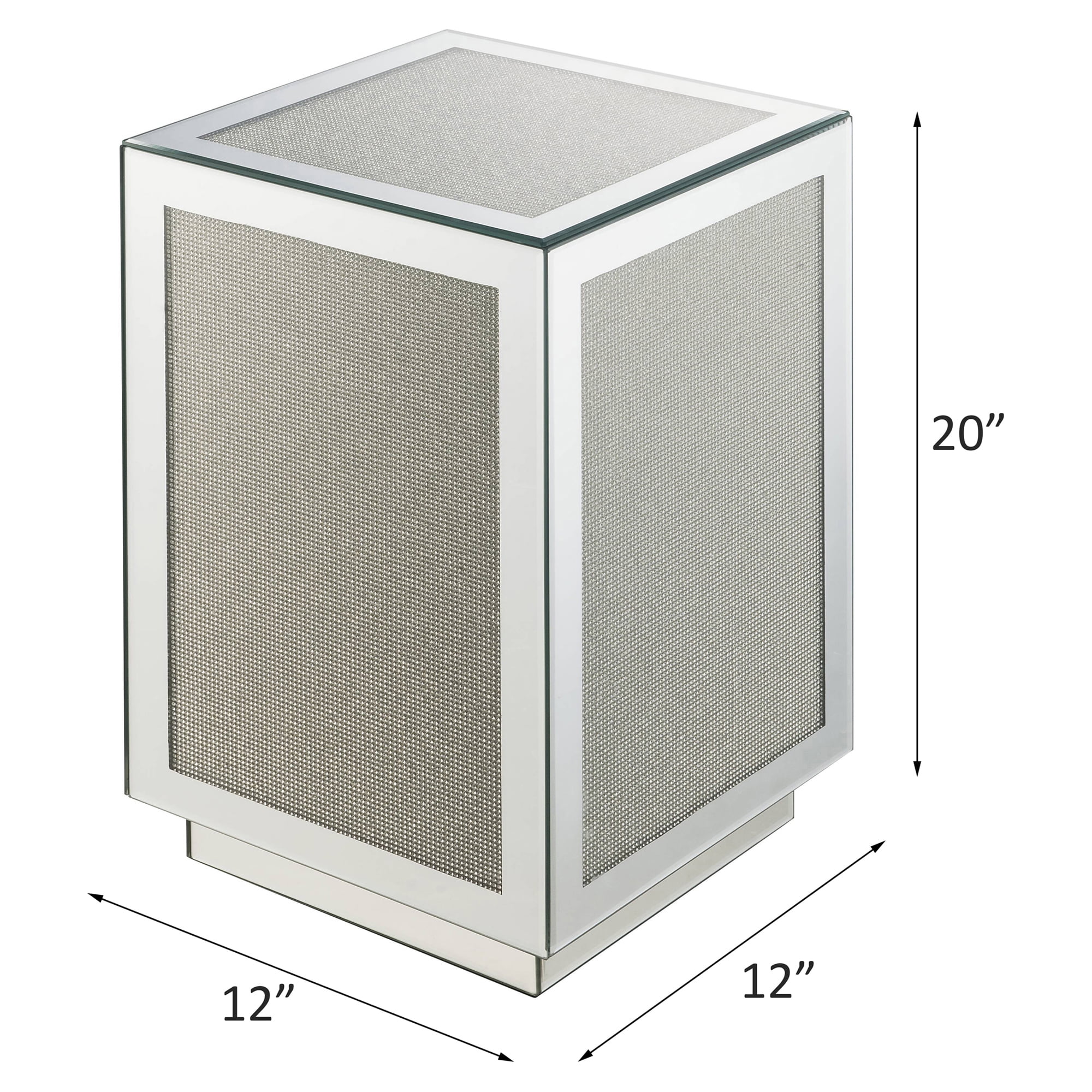 Square top Mirrored inlay top and frame Case-frame with faux diamond inlay and clear glass Assembly not required Weight capacity: 50lbs