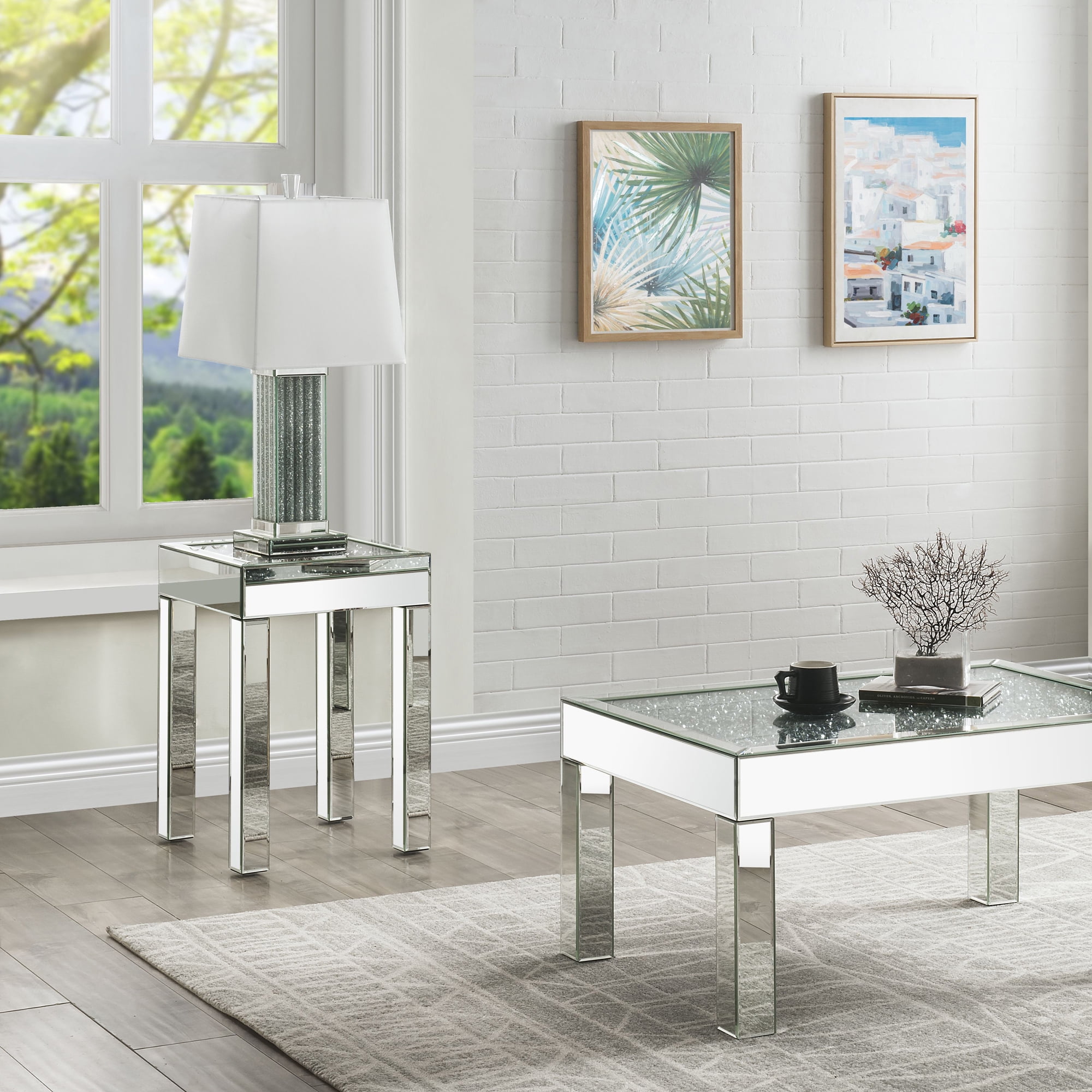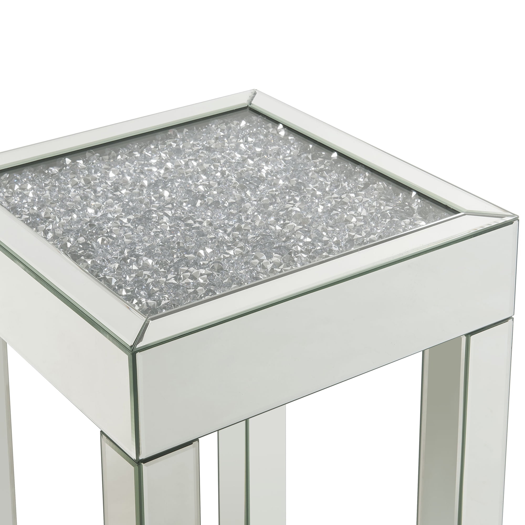 Square tempered glass table top Table top with faux diamonds inlay Mirrored square legs Floor clearance: 19″ Weight capacity: 88 lbs Assembly required