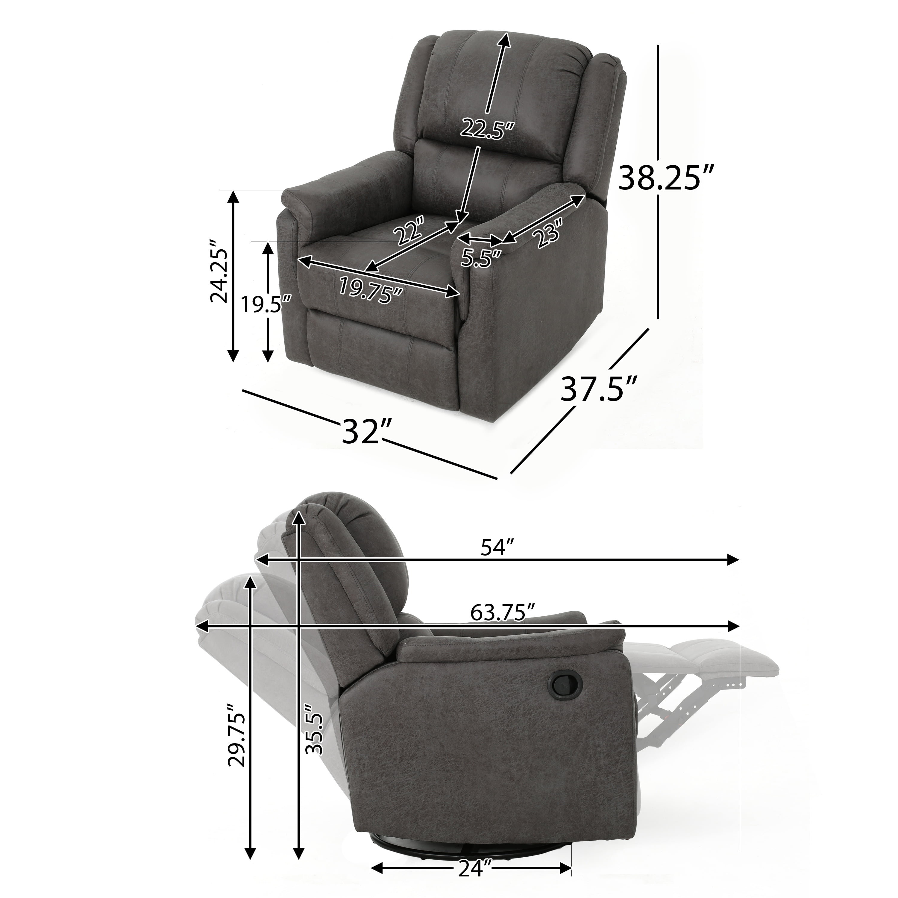 Noble House Standard Microfiber Tufted Swivel Glider Recliner, Slate Includes: One (1) Recliner Material: Microfiber Composition: 100% Polyester Leg Material: Plastic Color: Slate Leg Finish: Black Some Assembly Required Hand Crafted Details Dimensions: 37.50 inches deep x 31.25 inches wide x 38.25 inches high Reclined Dimensions: 63.75 inches deep x 31.25 inches wide x 29.75 inches high Seat Width: 19.75 inches Seat Depth: 22.00 inches Seat Height: 19.50 inches Arm Height: 24.25 inches