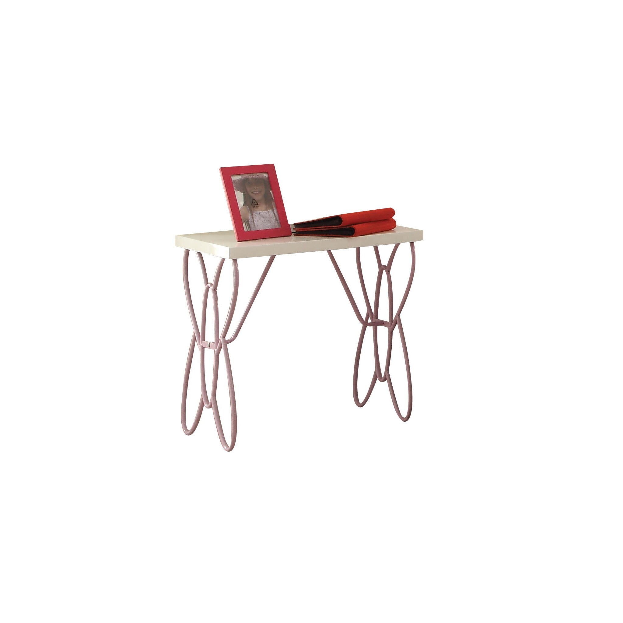 Finish: White & Light Purple Material: MDF, High Gloss Finish, Metal Tube Top: MDF with White High Gloss Finish Base: 2 Metal Panels w/Butterfly Design Metal Tube: Purple Powder Coating No Drawer