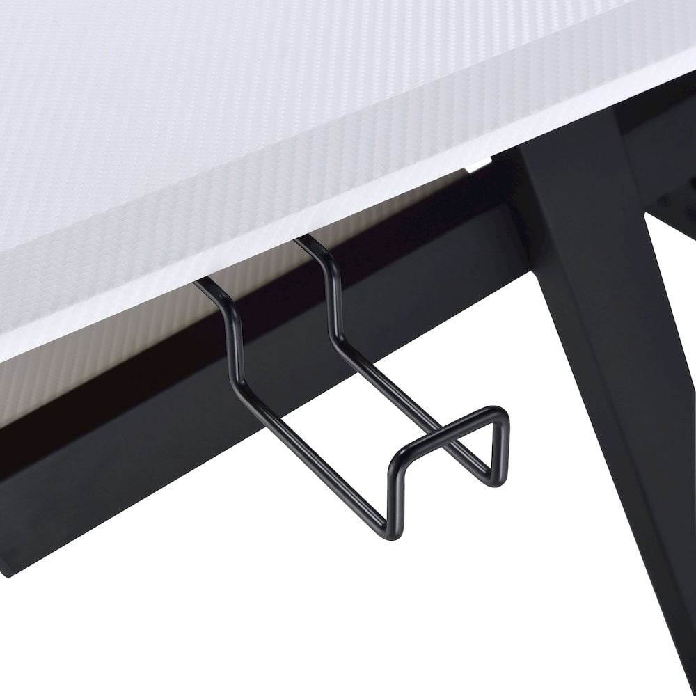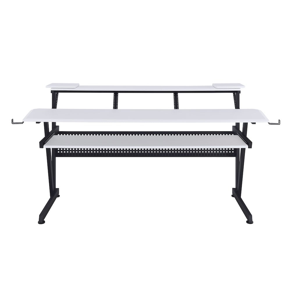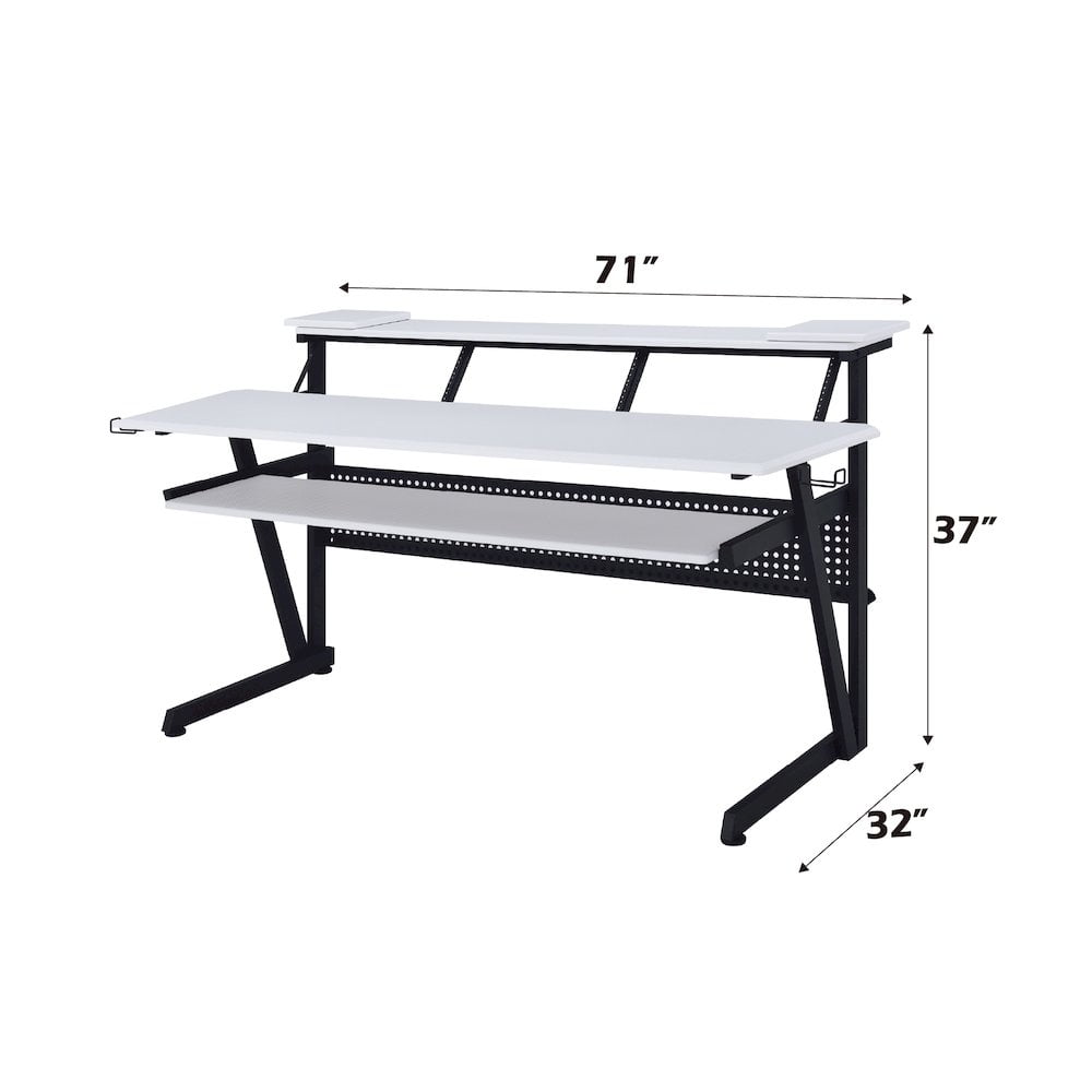 Create a sophisticated, highly functional space for making and enjoying music with this modern music desk. Built for productivity, it features a spacious desktop with an upper shelf that includes speaker risers for a structured, defined silhouette. A keyboard tray adds versatility and functionality to the desk, which includes headphone holders on each side. The desk boasts a white finish over its work surfaces, while a black finish metal base adds contrast and depth. A perforated metal panel completes the look with texture, perfect for modern bedrooms and living areas. Features: Materials: MDF, Metal, Paper Veneer Rectangular Music Desk: Features a spacious, rectangular design for easy equipment setup and organization. Keyboard Tray Included: A convenient tray for storing your keyboard, improving workspace ergonomics and function. Two Speaker Shelves: Dual shelves provide ample space for speakers, ensuring optimal sound placement and access. Two Headphone Holders: Includes two sturdy holders to neatly store your headphones when not in use. Carbon Grain Finish: Stylish carbon grain finish adds a modern, sleek look to your workspace. Metal Frame: Durable metal frame construction ensures stability and longevity for everyday use. Specifications: Desk Dimensions: 71″W x 32″D x 37″H Product Weight: 77.14 lbs Top Dimensions: 71″W x 19″D Shelf Dimensions: (Top) 59″W x 9″ Shelf Dimensions: (Speaker) 12″W x 12″D Product Dimensions: (Keyboard Tray) 46″W x 13″D x 6″H Top Dimensions: (Thickness) 0.71″ Color/Finish: White and Black Weight Capacity: 160 lbs Assembly Required: Yes Warranty Description: 60 Days Limited Manufacturer