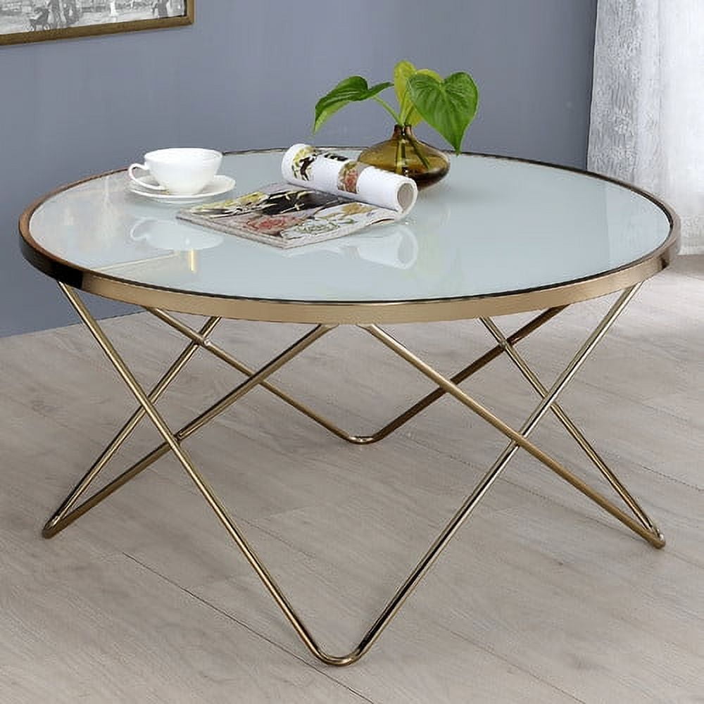 Update your living room with a functional art piece. The Valora coffee table uses a mid-century inspired base finished in champagne and supports a framed black glass top. The finish and black glass make for a sophisticated look. Features: Round Table Top: White Frosted Glass Top with Metal Trim 5mm Tempered Glass Metal Tube Base No Storage Specifications: Product Dimensions: 18″ H x 34″ W x 34″ D Product Weight: 21 lbs