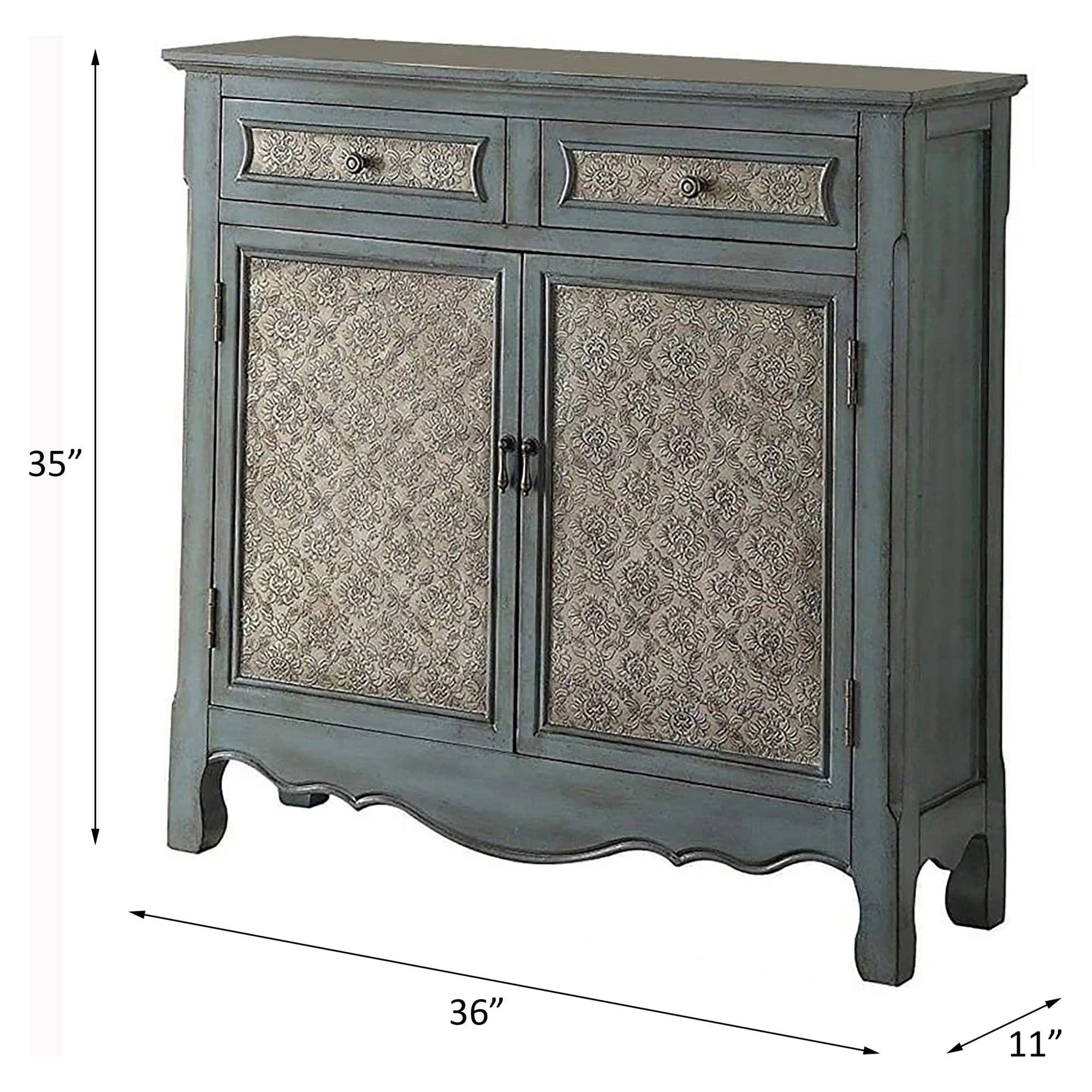 Rectangular wooden console table top 1 shelf inside the door Side metal glide drawer Contrast pattern door and front drawer Arched decorative base 3/4 extension drawer glide Number of drawer: 2 Drawer dimension: 14″W x 9.5″D x 3.5″H Number of door: 2 Assembly not required
