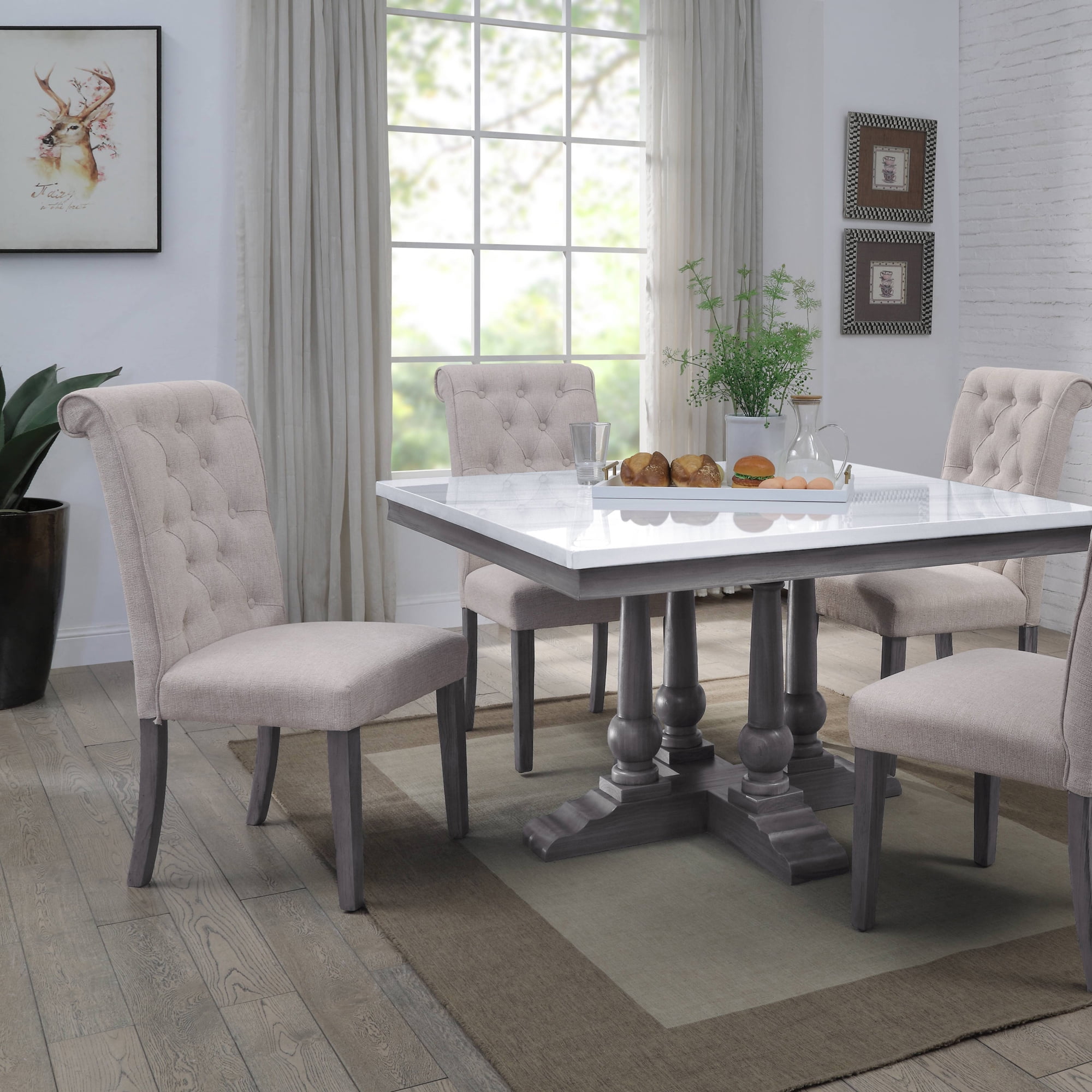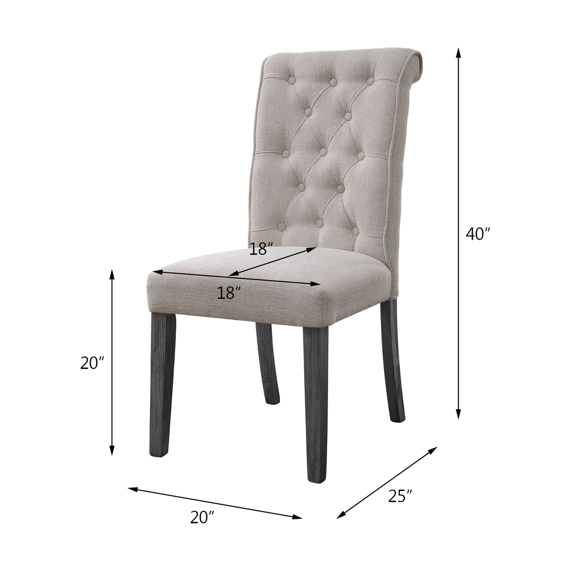Beige linen upholstery fully covers its wooden frame for a light and airy feel. The side chair boasts a rolled back design with tufted button details, which embodies a timeless look with a classic flair. Wooden legs in a muted gray finish lend a bit of natural charm. A perfect addition to any dining table, Yabeina Side Chair gives you and your guests a sink-in comfort.