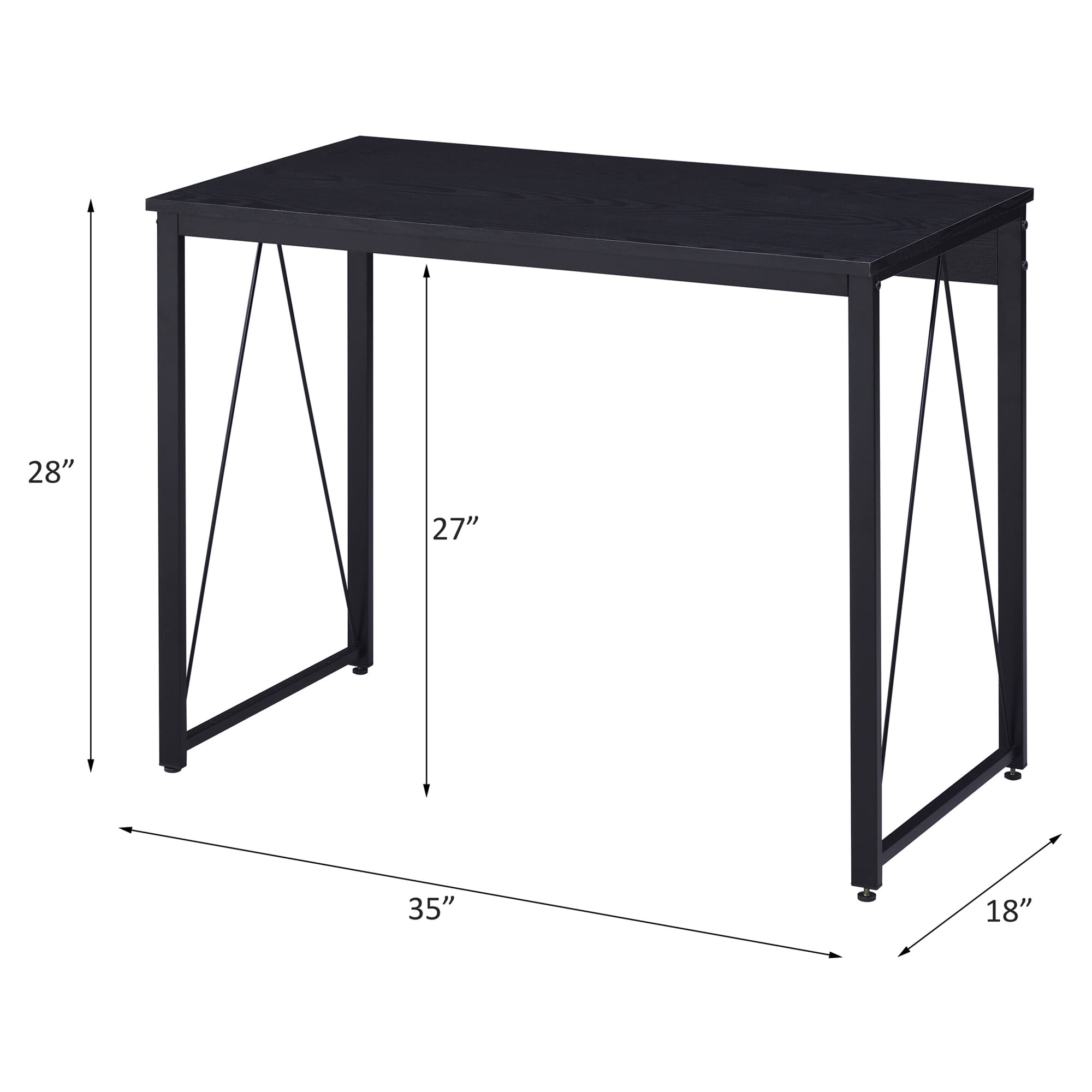 Rectangular table top Reverse V-shaped support Metal sled base: Black finish Leg space dimension: 33″W x 18″D x 27″H Weight capacity: 44 lbs Assembly required