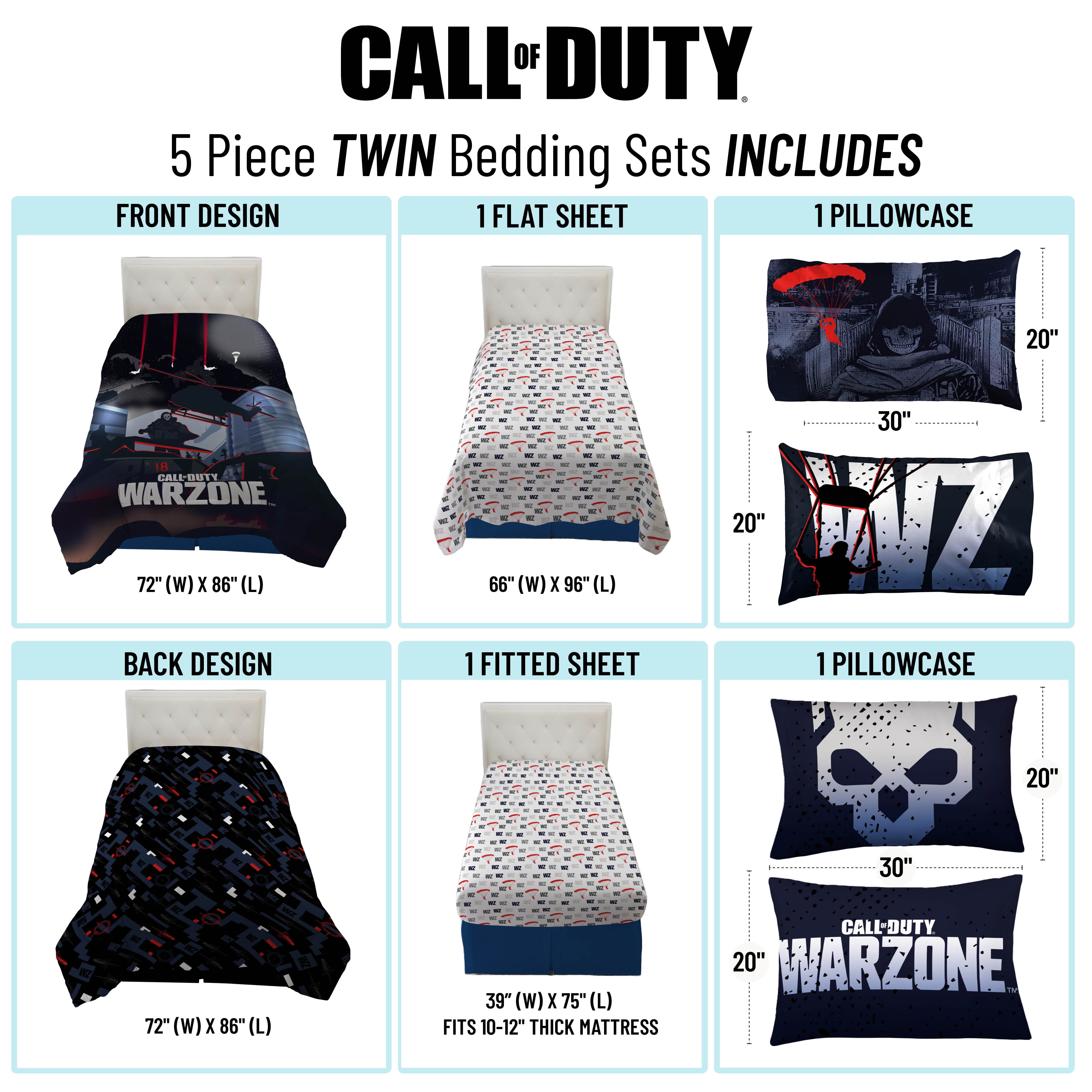 Activision Call of Duty Black 5-Piece Kids Reversible Twin Bedding Set, 100% Microfiber Set includes one reversible twin comforter, one standard pillow sham, one fitted sheet, one flat sheet, and one standard pillowcase Comforter: 64″ x 86″ Sham: 20″ x 26″ Sheets: (Fitted: 39″ x 75″; Flat: 66″ x 96″) Pillowcase: 20″ x 30″ Made from 100% very high-quality Microfiber Machine wash cold, tumble dry low