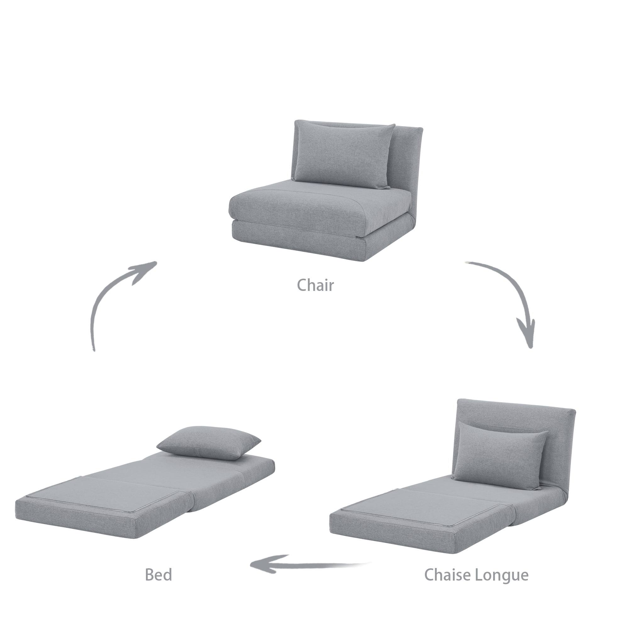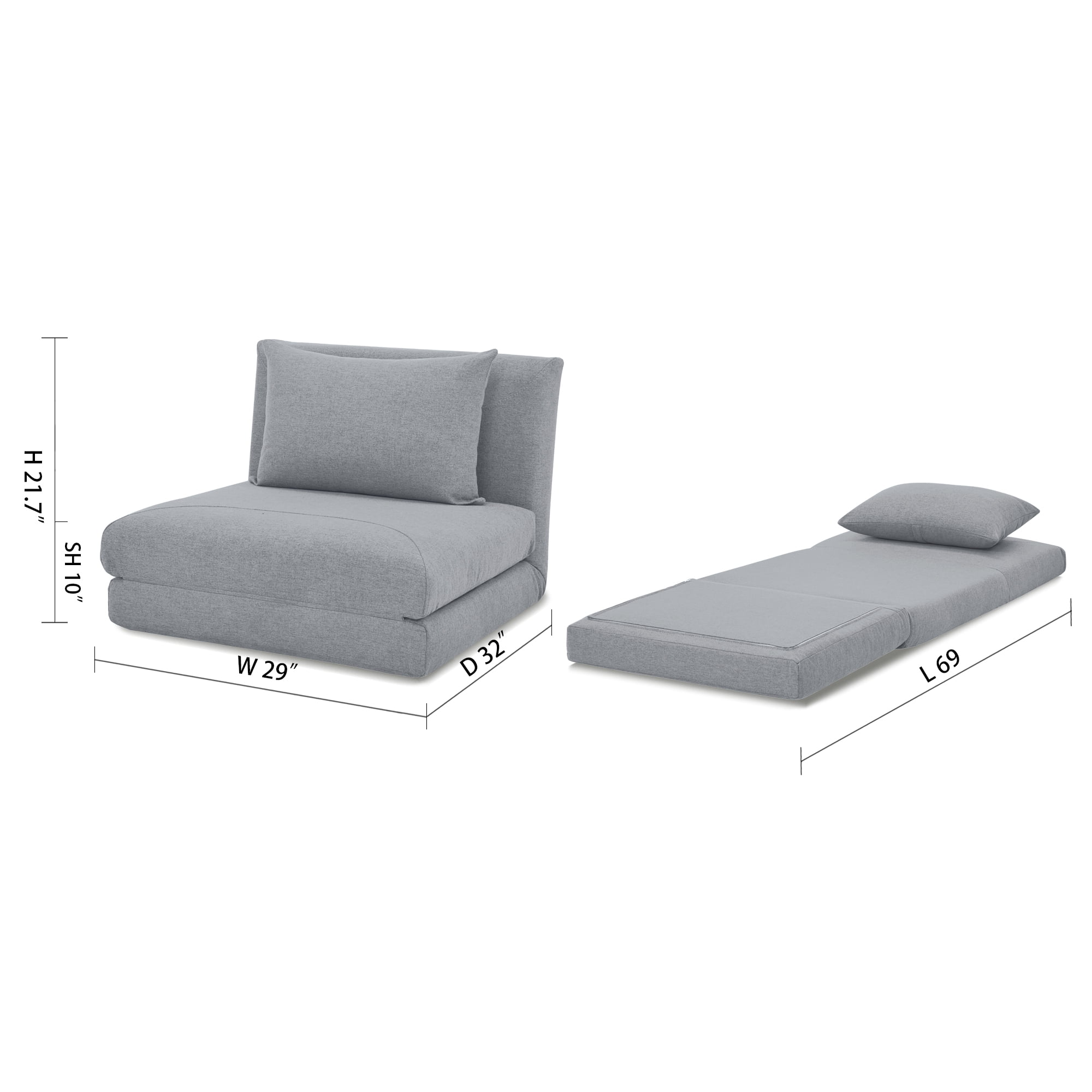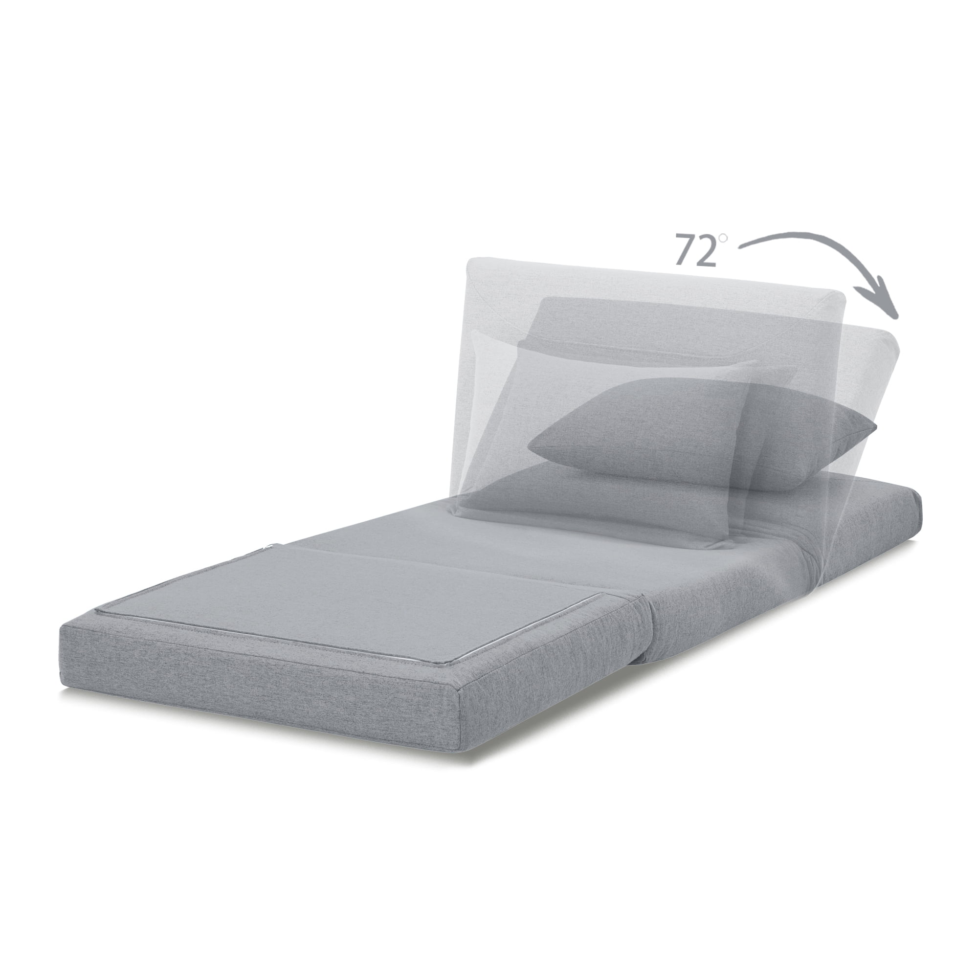 Easily converts from a chair to a chaise lounge or a twin bed 5 convertible positions to meet your comfort needs No assembly required Upholstered in a 100% polyester fabric Cushioned with comfortable and supportive foam Includes 1 matching pillow, convertible chair Product size: W 29.13″ x D 32.28″ x H 21.65″ Seat Dimensions: Seat Width: 29.13”, Seat Height: 10.24”, Seat Depth: 17.72” Bed size: L 68.9” x W 29.13” Additional Measurements: Mattress thickness: 5.12”, Chaise: L 44.88”, Weight: 25.08lbs