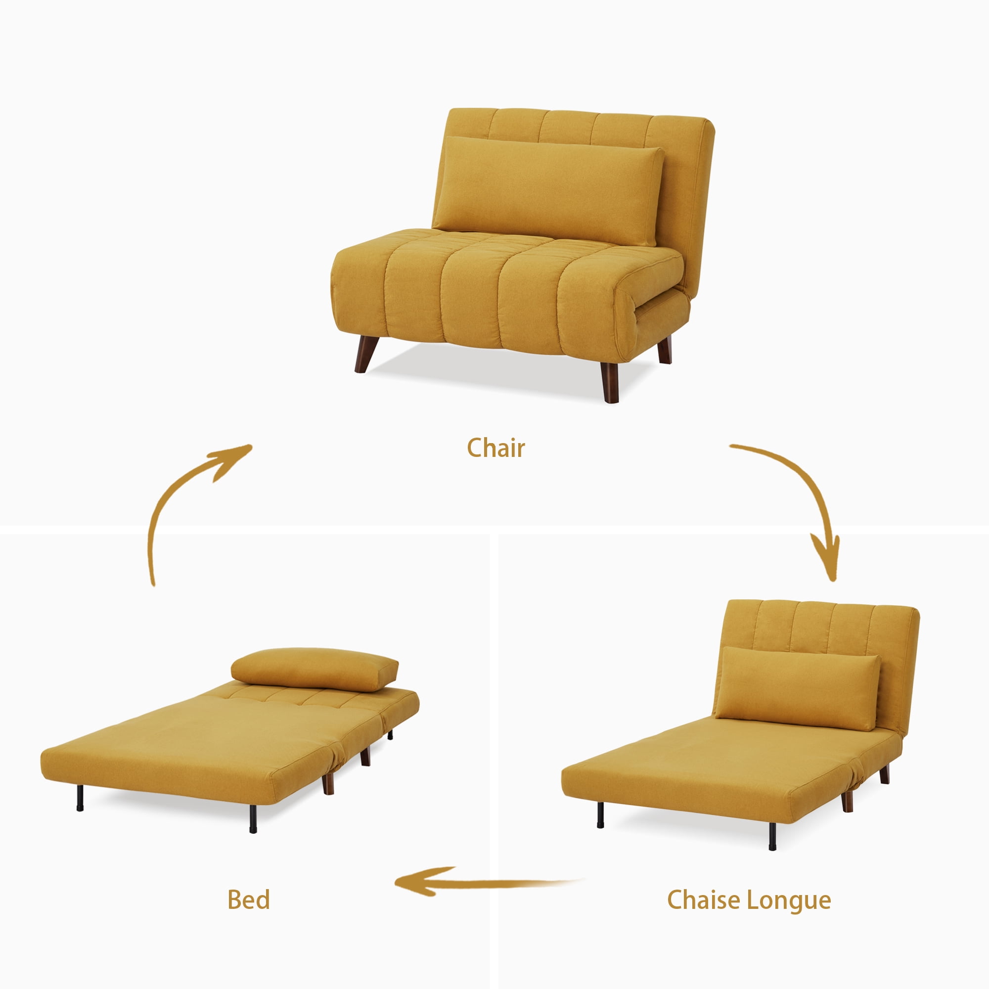 A&D Home Springfield Convertible Chair has a comfortable and modern design which is a great fit for your den, living room, or spare bedroom. This convertible chair has 2 additional functions that it offers, it easily converts to chaise lounge and a twin bed. It is also a perfect addition for those that have a limited space but also want to have an extra bed for your overnight guests. This convertible chair is upholstered in a Yellow color, 1 of 3 color options, which are made of a 100% polyester fabric, cushioned in foam and comes with a matching pillow for extra comfort. It is easy to assemble, taking less than 20 mins and you are on your way to enjoy your new Springfield Convertible Chair.