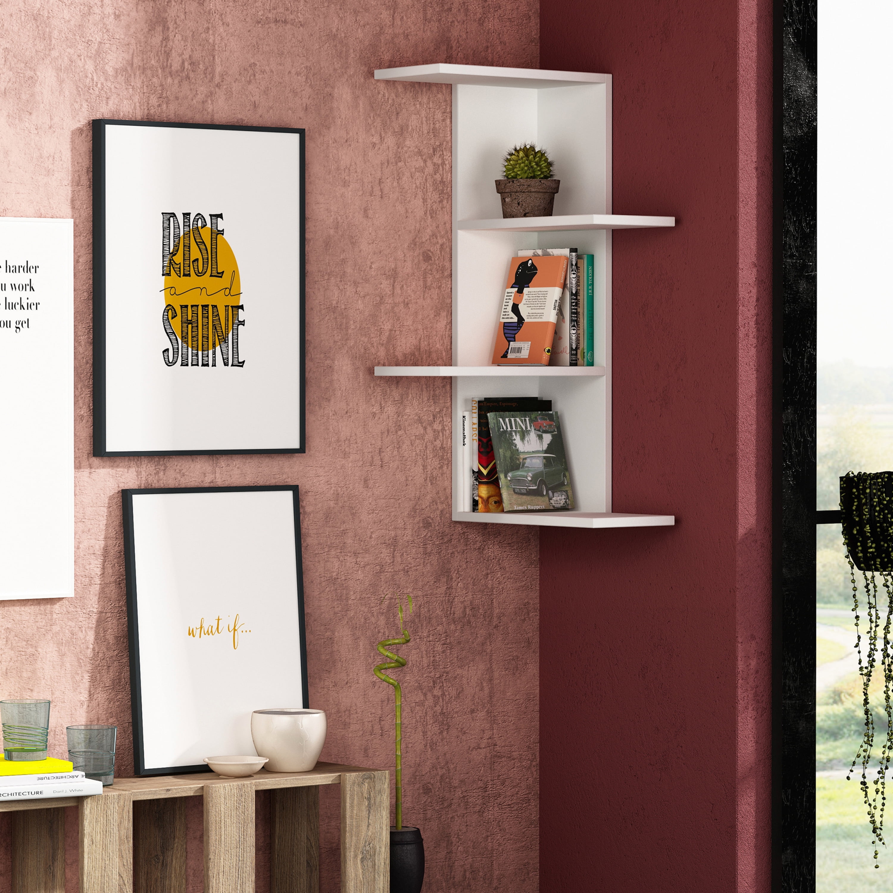 Need storage without covering up the existing decor on your walls? Bowcott provides a wonderfully hidden corner storage option to stow away all memorabilia without blocking prized pictures and memories already mounted on the walls of the home. This functional option is 33 inches in height, 17 inches in width, all while providing a spacious 10-inch depth in all 4 storage spaces. 33.46” H x 16.54” W x 7.87” D. Ada Home Decor Furniture 16.54″ 3 Tier White Bowcott Modern Wall Shelf is suitable for living room, bedroom, office, kitchen, bathroom and more.