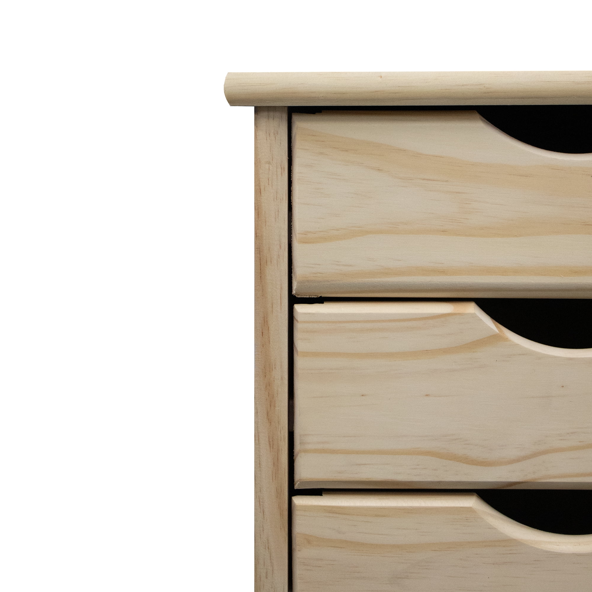 Solid Wood, no particle board, including drawer sides. Drawers are easily removed to be carried to a working area for crafting / sewing Drawer accepts a ream of 8 ½” x 11” paper, or kitchen wrap Can be refinished or painted. 5. On casters for mobility. Assembled Dimensions: 15.4” x 13.4” x 25.4” 7 Inside Drawer Dimensions: 9.65” x 12.32” x 2.67” Sustainable plantation grown pine. Non toxic finish. Available colors – Unfinished, Black, White and Medium Pine Roll Cart