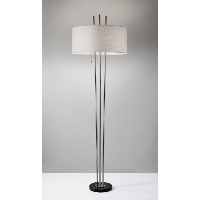 Three brushed steel poles extend through a beautifully textured white fabric shade creating the unique, yet elegant silhouette of the Anderson Floor Lamp. A double socket holds two 100 Watt bulbs that can be turned on and off with double pull chain switches. A black marble base adds a decorative accent to the simple style.