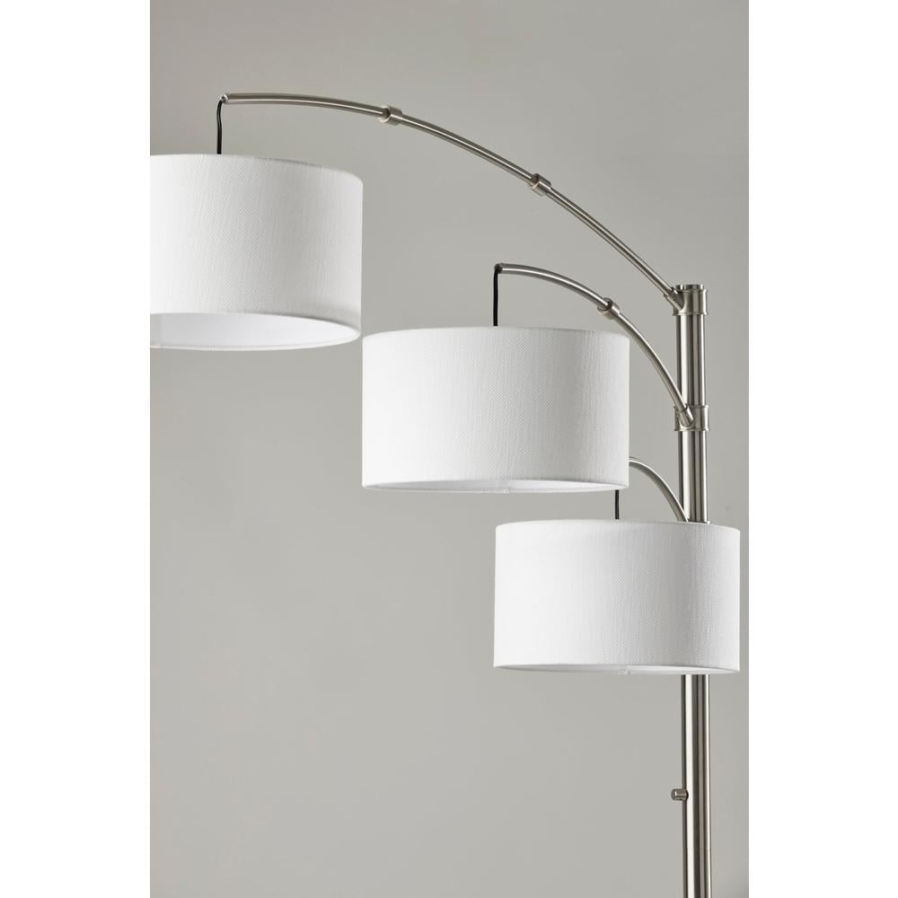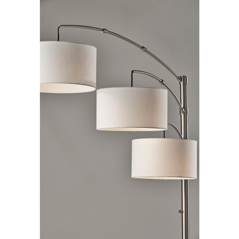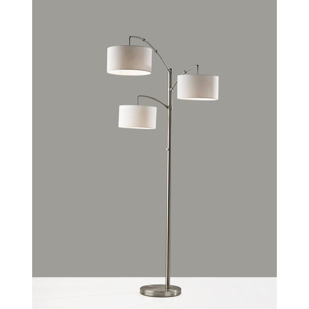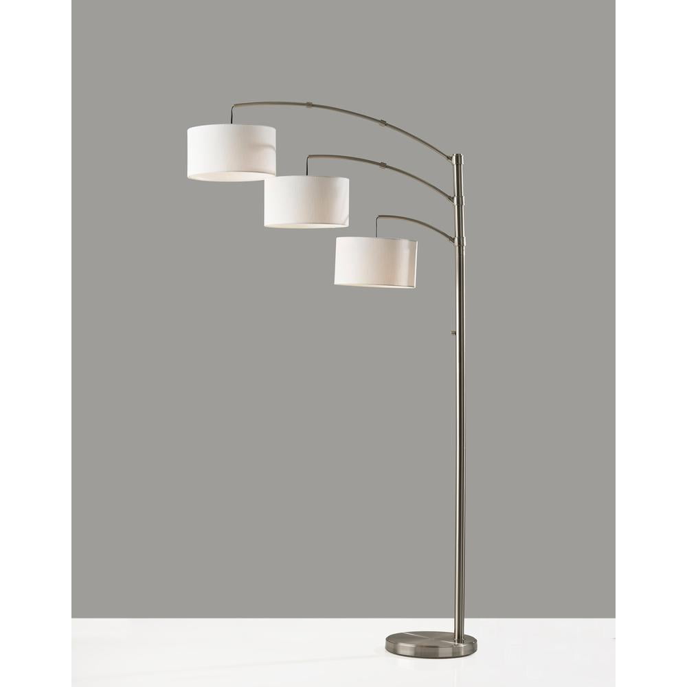 Add an upscale feel to your space with the Cabo Arc floor lamp that effortlessly complements urban, industrial, or mid-century modern décor. The clean lines and long arms of this 82″ tall lamp makes it the perfect light source for reading in a recliner or working at a desk, while its slender design makes it easy to position near love seats, couches, or side tables. The 13.75″ round brushed steel base provides stability, while the clean lines in brushed steel add a modern, minimalist touch. The brushed steel finish continues through the pole and trio of arms. For maximum versatility, the lamp features three arms, each topped with a 100W bulb (not included) and textured white fabric drum shade. The arms can all be swiveled and repositioned from the base, allowing you to direct the light wherever it’s needed. Operated by a rotary switch located on the stem, this lamp features multiple lighting settings so you always have the desired amount of light. A simple twist of the switch turns one lightbulb on, another twist turns two of the lightbulbs on, a third twist illuminates all three of the lights, and a fourth twist turns all lights off. The Cabo Arc floor lamp is also available with a dark bronze finish and coordinating light brown textured fabric shade.