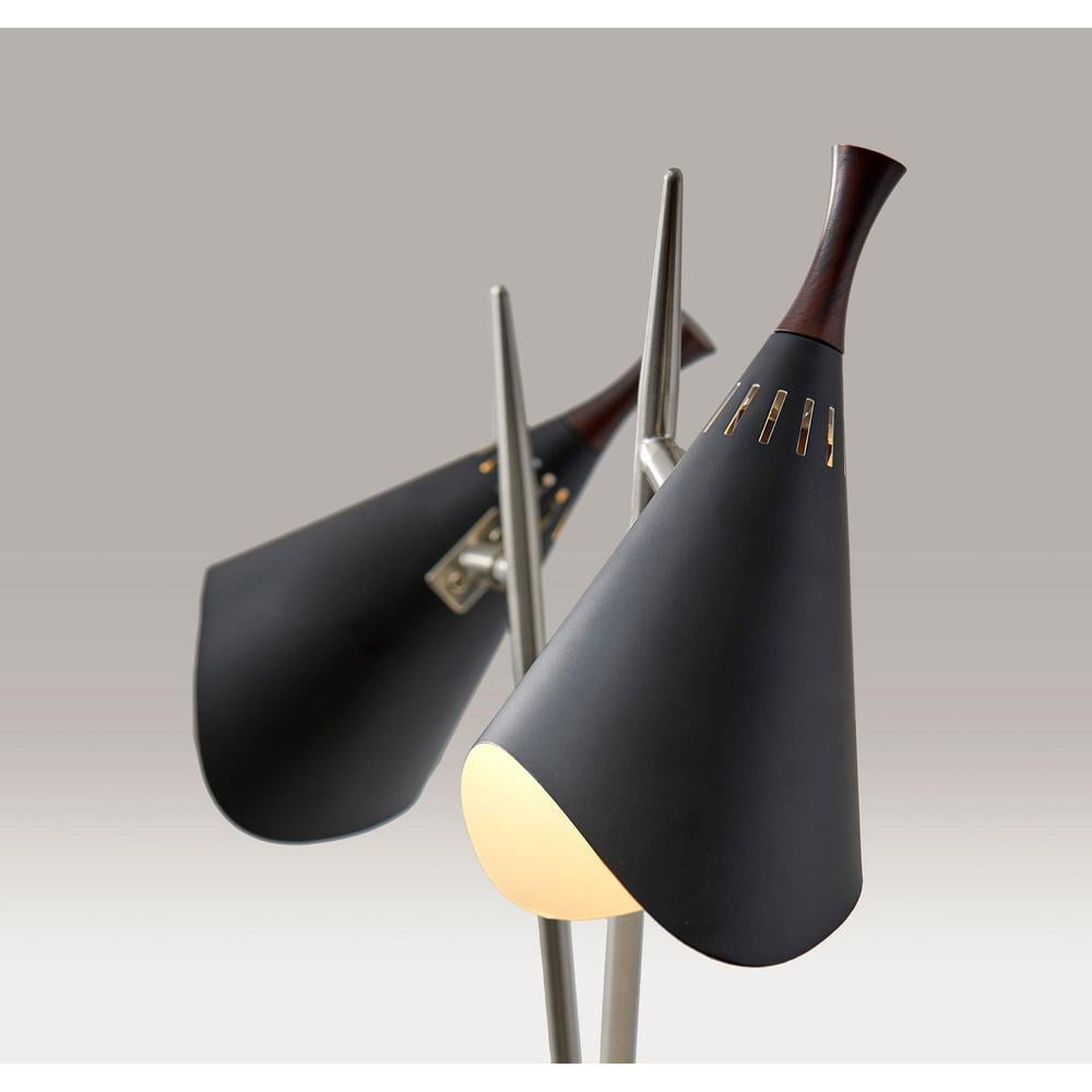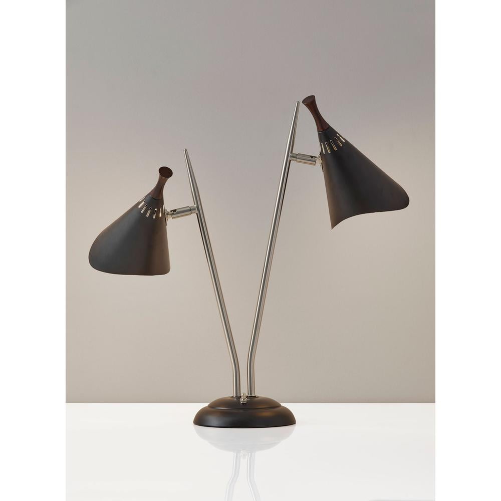 Draper Desk Lamp Achieve the mid-century vibe with the addition of the Draper two-light desk lamp. The gracefully vented metal cone shades are painted black with white interiors for maximum light reflection. The lamp’s two satin steel poles extend in a V-shape from the matte black base. Walnut wood accents on each shade softens the contemporary look to fit a variety of decor. A three-way steel rotary switch located on the base controls two 60W incandescent bulbs or equivalent CFL’s. The 3-way rotary socket switch will only work with a 3-way light bulb, otherwise this lamp will function with simple on/off switch at its highest setting. This lamp has a clear cord and is smart outlet compatible. Bulb is not included. Matte black finish w. faux wood shade accents Brushed steel poles Adjustable shades 22 total height – Finish: Brushed Steel/Black painted – Dimensions: 25”W x 7”D x 22”H – Collection: Draper – Item Depth: 7 – Item Height: 22 – Item Width: 25 – Item Weight: 1.87 – Item Color: Silver – Indoor/Outdoor: Indoor – Bulb: 2 * 60W incandescents/ 2 * 13W CFL – Design/Style: Mid-Century Modern – Item Material: Metal 85% / Electrical 15%