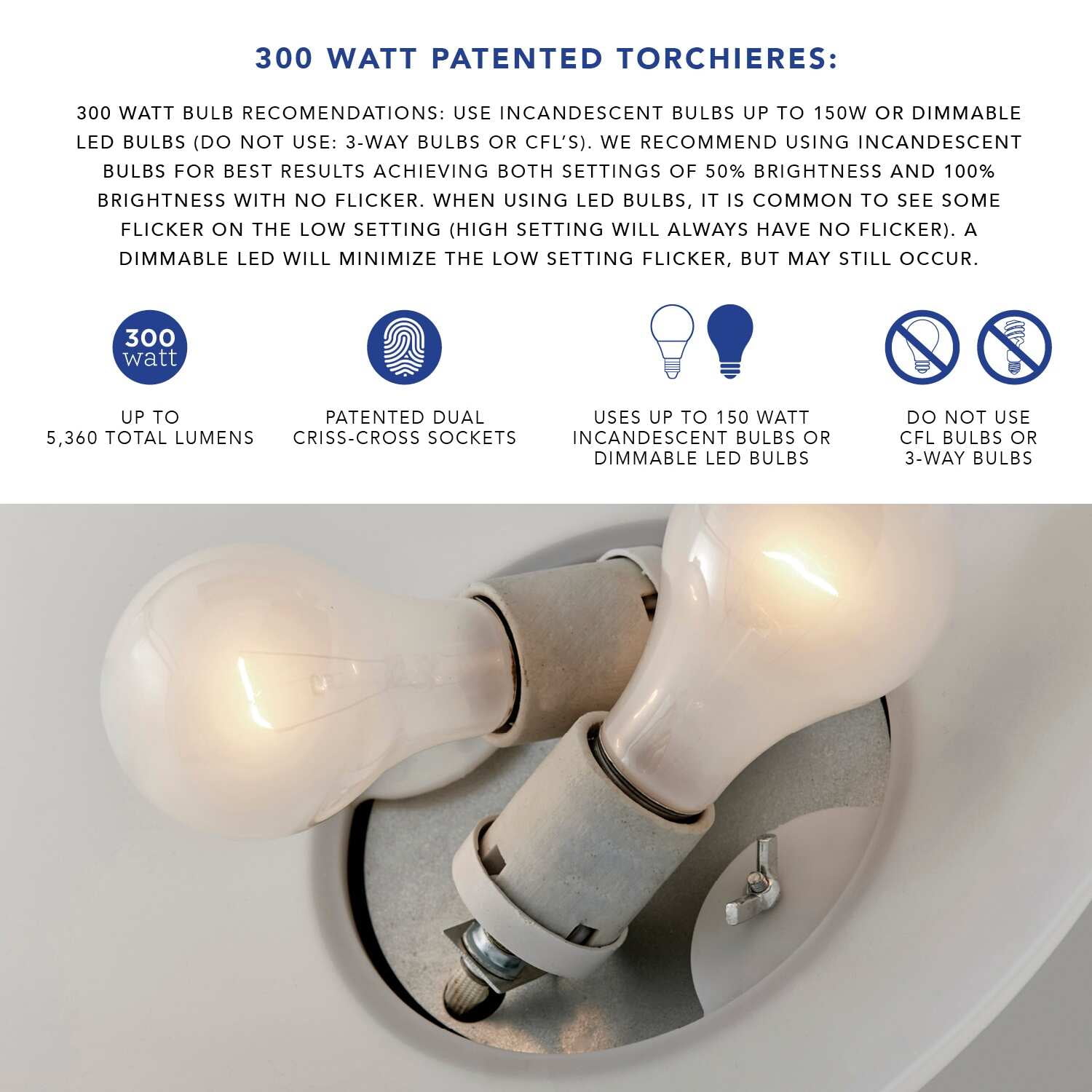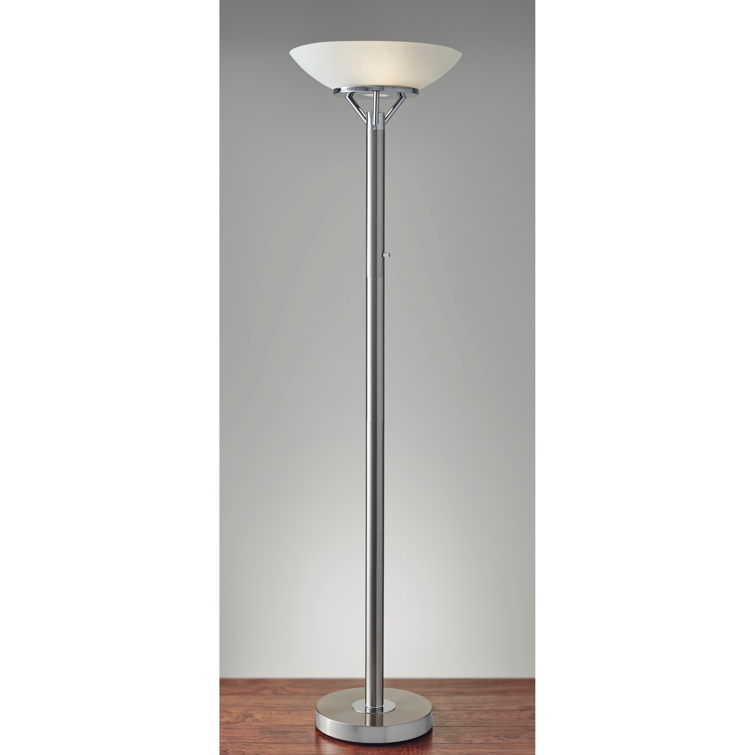 Expo 300W Torchiere The Expo torchiere can illuminate any room with even up lighting. A beautiful frosted glass shade diffuses bright ambient light. An Adesso patented 300 Watt Double Socket construction allows for two crisscrossed sockets, each holding on/off 150 Watt incandescent or LED bulbs which provides approximately 3 times more light than a typical torchiere. The brushed steel finish is complemented with chrome accents on a chunky pole that gives the lamp a bold presence in a room. A simple high/low rotary switch is located on the pole to adjust the brightness. This lamp has a black cord and is smart outlet compatible. Use incandescent bulbs up to 150W or dimmable led bulbs (DO NOT USE: 3-way bulbs or CFL’s). We recommend using incandescent bulbs for best results achieving both settings of 50% brightness and 100% brightness with no flicker. When using LED bulbs, it is common to see some flicker on the low setting (high setting will always have no flicker). A dimmable LED will minimize the low setting flicker, but may still occur. Bulbs are not included. Brushed steel finish Patented 300W socket construction Frosted glass shade High/low rotary switch on pole – Finish: Brushed steel w. chrome – Dimensions: 18”W x 18”D x 71.5”H – Collection: Expo – Item Depth: 18 – Item Height: 71.5 – Item Width: 18 – Item Weight: 24.25 – Item Color: Silver – Indoor/Outdoor: Indoor – Bulb: 2 * 150 W incandescent/ equiv. LED – Design/Style: Modern Chic – Item Material: Glass : 16.2 %,Elctric : 11.8 %,Metal : 72%