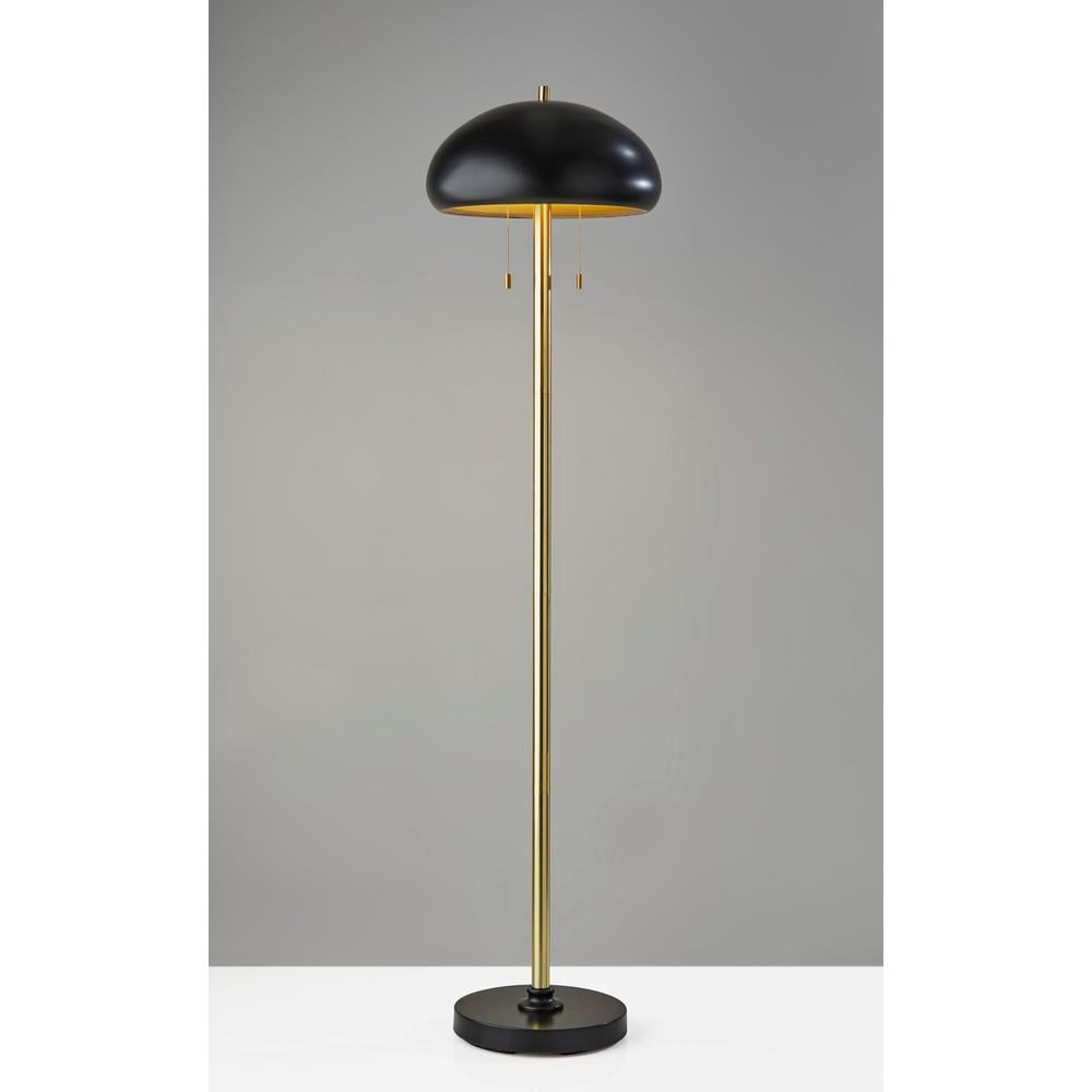 Cap Floor Lamp Add a mid-century accent to your bedroom, living room or office space with the Cap Floor Lamp. A black metal dome shade has a gold painted inside for optimal light reflection. Two sockets each hold a standard 40W bulb, each controlled by its own pull chain switch providing 2 brightness settings. Black and antique brass finishes are mixed to create a versatile, modern look. Black & Antique Brass Finish Double Sockets – Double the light! Double Pull Chain Switch offering2 light settings This lighting product is either UL or ETL listed, meaning that it has been tested and approved to meet the government-regulated safety standards for the USA. – Finish: Black & Antique Brass – Dimensions: 15.75”W x 15.75”D x 63.5”H – Collection: Cap – Item Depth: 15.75 – Item Height: 63.5 – Item Width: 15.75 – Item Weight: 18.26 – Item Color: Black – Indoor/Outdoor: Indoor – Bulb: 2 x 40W Type A (not included) – Design/Style: Mid-Century Modern – Item Material: Metal:80% Electrical part:20%