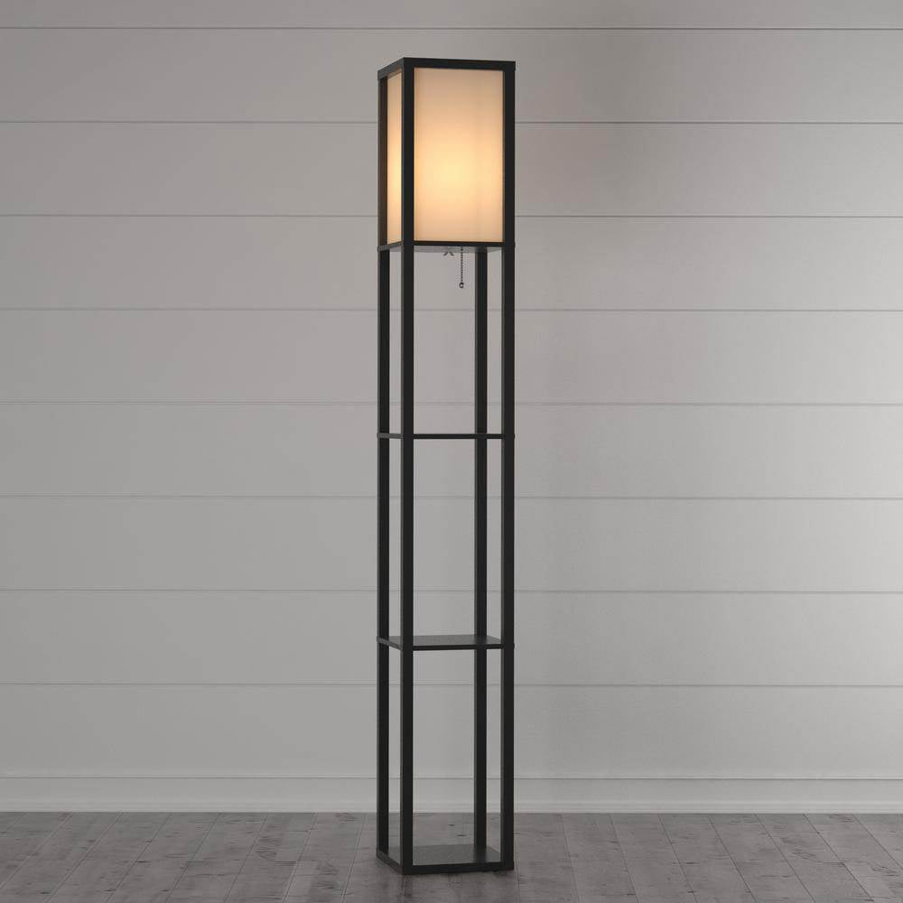 Off white poly and cotton fabric shad Collapsible square shade to make more room in your space Works great with most design styles 3 shelves can be used for storing or displaying personal items Ball accented pull chain switch Wattage: 150 W Dimensions: 11.5 x 11.5 x 72 inches Weight: 16 pounds Manufacturer warranty: 1-year warranty