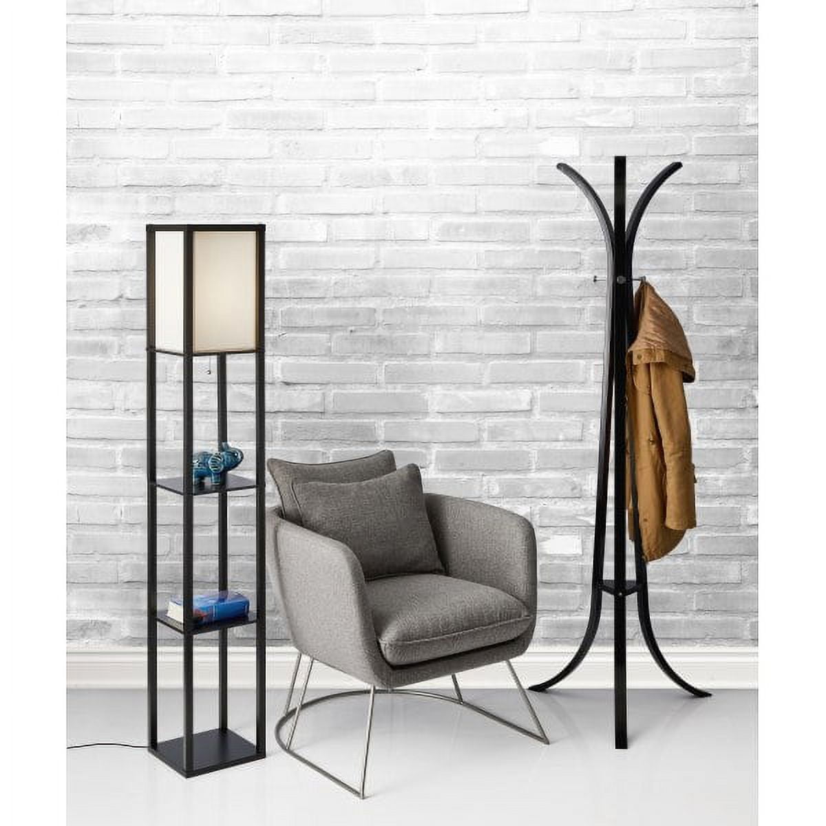 Wright Shelf Floor Lamp Have it all with high style and multi-function. The Wright shelf floor lamp feature a black walnut wood open box frame with two additional display/storage shelves, making it a handy addition to the living/media room, den, office, or bedroom. The collapsible poly/cotton shade diffuses light from a 150 Watt incandescent or equivalent bulb. The lamp has on/off functionality with a metal ball accented pull chain switch. This lamp has a clear cord and is smart outlet compatible. Bulb is not included. Black pine wood Off-white poly-cotton fabric shade 3 storage shelves 63 total height – Finish: Black Wood Veneer on MDF – Dimensions: 10.25”W x 10.25”D x 63”H – Collection: Wright – Item Depth: 10.25 – Item Height: 63 – Item Width: 10.25 – Item Weight: 11.02 – Item Color: Black – Indoor/Outdoor: Indoor – Bulb: 150W incandescent/ equiv. CFL – Design/Style: contemporary – Item Material: Wood 65% / Fabric 20% /Electrical 15%