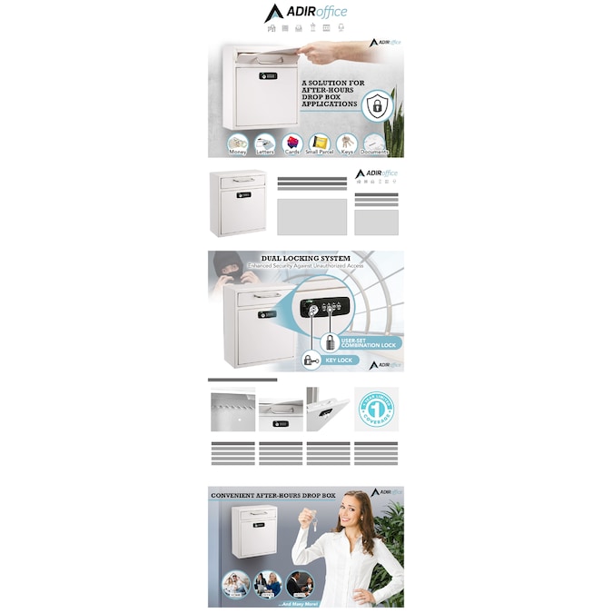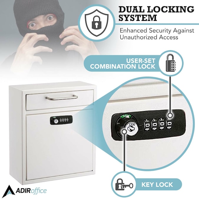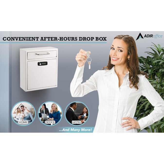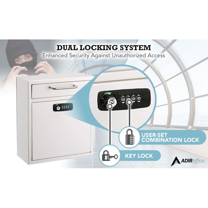The AdirOffice Locking Drop Box Wall Mounted Mailbox is designed to hold keys, cash, envelopes or other important materials that need to be dropped off after hours. Constructed of durable, heavy-duty 16-Gauge galvanized steel to provide long-lasting strength and furnished using a powder-coated, scratch-resistant finish. Wide enough to accommodate bigger items than your average drop box slot. This secure drop box features an anti-fishing bin door that accepts letters, checks, keys and other small bundles, To prevent theft, a anti-pry latch locking mechanism is used. The locking access door features a commercial grade 12-disc wafer lock and includes 3 laser cut keys to ensure the items inside are safe and secure. Select user-set combination lock or key lock for enhanced security against unauthorized access. To finish it off, this mailbox includes 4 mounting screws, 4 stainless steel washers, a driver bit and a drill bit for quick and easy installation of the box wherever you’d like to mount it.