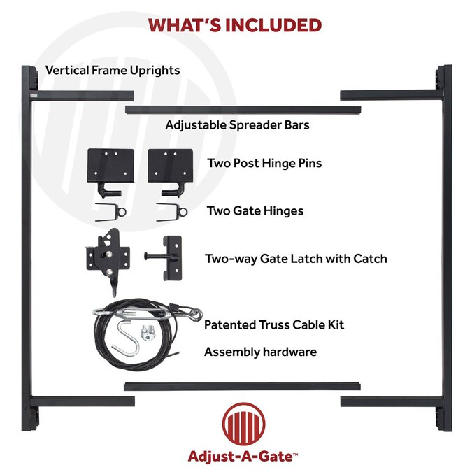- Package includes: Adjustable steel frame, lockable 2-way gate latch, post and gate hinges, and patented truss cable system
