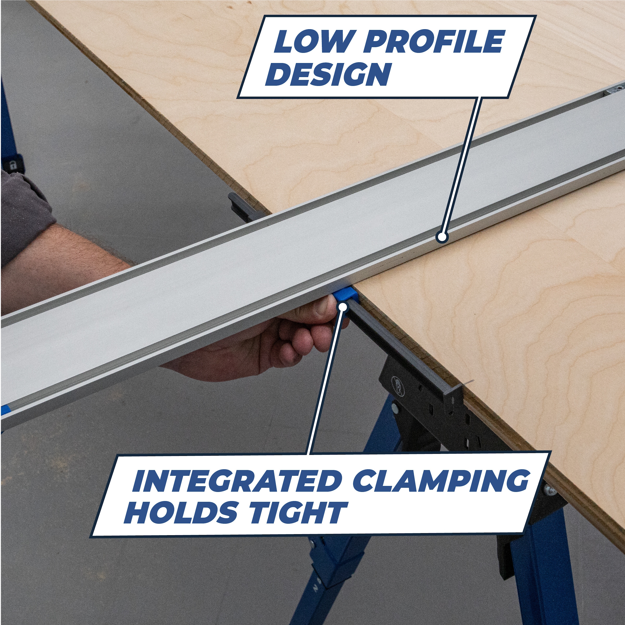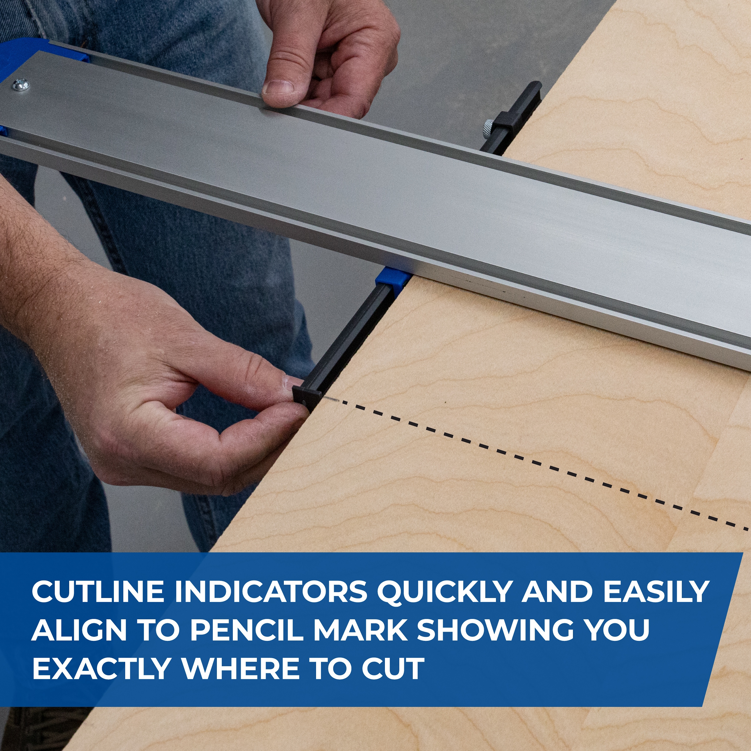 Make perfectly straight cuts in sheet goods with guided cutting! Cut full sheets of plywood down to size with precision and ease by using the Kreg® Straight Edge Guide XL. Work with material up to 8 feet and get the cuts you need – whether you’re using a circular saw, jigsaw, or trim router. (Works with most manufacturers.) Guided cutting makes it easier than ever to see exactly where you’ll cut so you can get the results you expect. First, align your cuts quickly and precisely with the cutline indicators. Then, secure the guide to your material using the low-profile GripMaxx™ clamps that are built right into the guide and now you’re ready to make a cut!