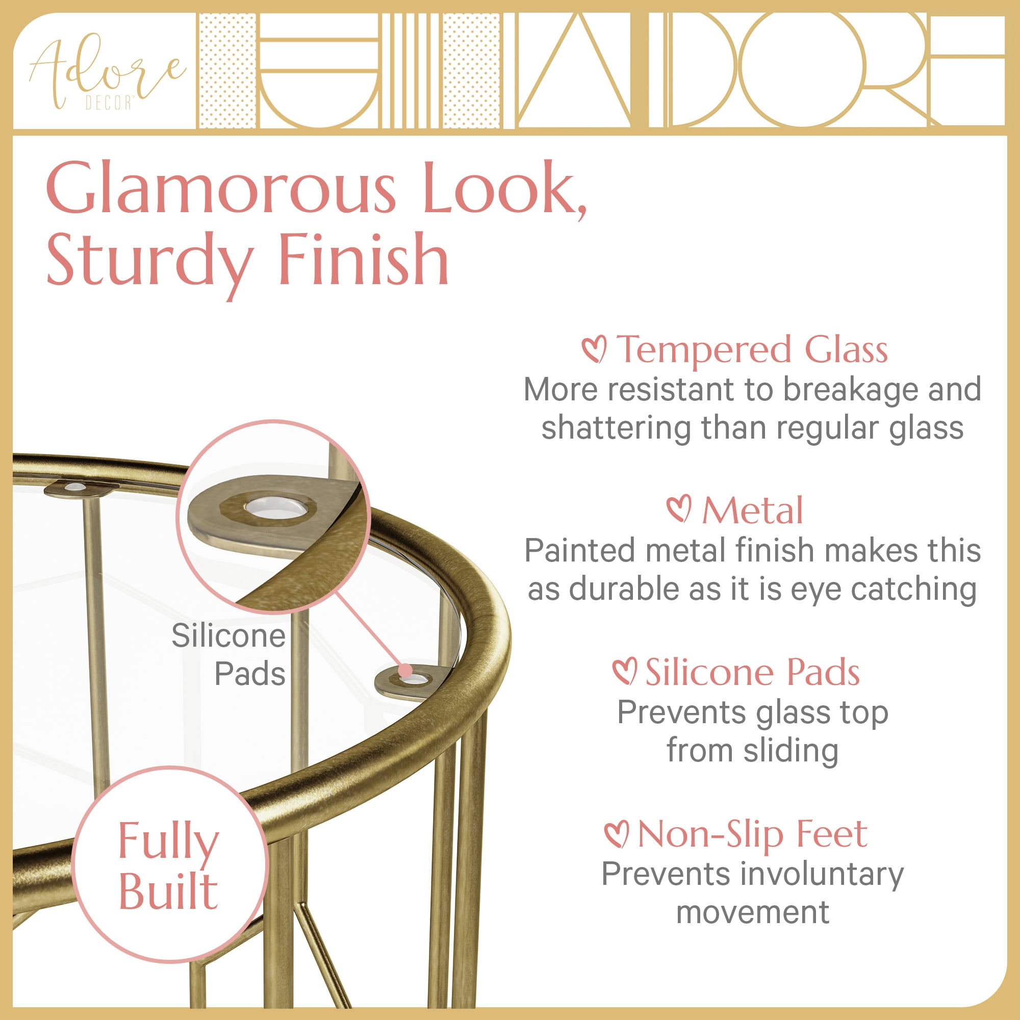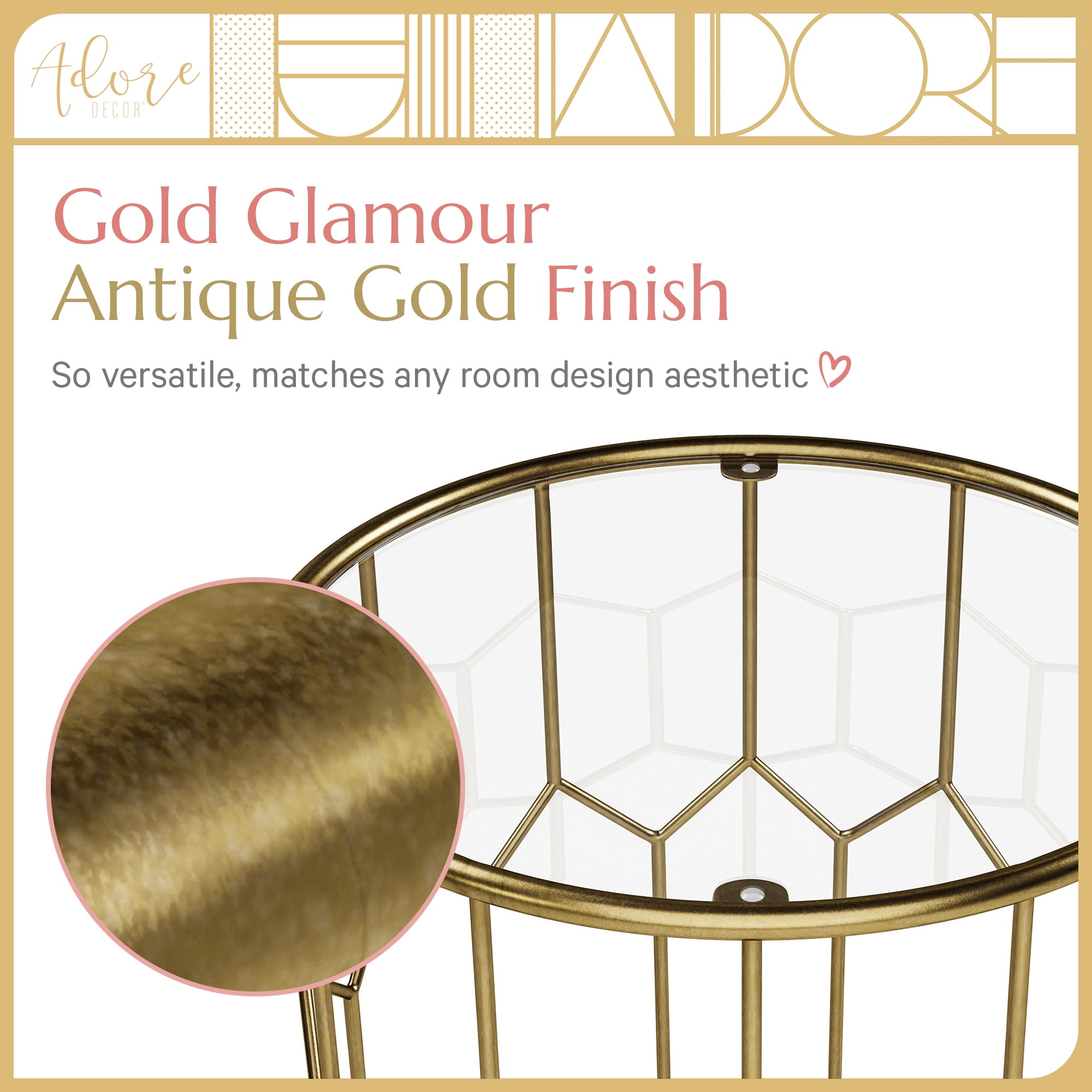 Welcome to Adore. The Adore brand is a blend of modern and fashionable design with function and a boho twist, suitable for a combination of indoors and outdoors. We believe in creating pieces that accentuate your unique style and love for all things modern. Our Adore Decor Harper Accent Side Table combines mid-century and modern design to add a chic and glam statement piece to any living space. Its eye-catching, hand-made, open and airy geometric wire frame finished in a brushed antique gold, will make it a feature in any living area. A round 16″ top made of tough tempered glass, which is stronger and safer than regular glass, contrasts the iron metal frame for a charming and unique look to not only enhance your home decor, but also add function to it. There’s plenty of space on the glass top for personal items such as phones and laptops, and household goods such as plants, books, remotes, or even a matching lamp. It’s well-built and durable, but not bulky or heavy, allowing it to be moved easily. Pair this glamorous end table with your living room sofa or a use it a nightstand in your bedroom. Wherever you decide to place this table, it will be a practical and dazzling addition to any room. Features: STYLISH & FASHIONABLE: A blend of mid-century and modern design gives this accent side table a sleek and chic appearance. The intricate geometric shape paired with gold glam will add a timeless and glamorous feature to any living area. MIXED MATERIALS: A clear glass top contrasts the metal frame and features a brushed antique gold finish for a contemporary and attractive look that will be the focal point of any room. FUNCTIONAL & VERSATILE: The Round 16″ glass top provides a large surface to pair with a lamp, or to hold laptops, iPads, books, or a drink tray for entertaining. The design and size of this table means it can be used as an end table or coffee table in the living room, or as a bedside table in the bedroom. SOLID & DURABLE: The glass top is tempered for safety and secured in place by silicone pads. The metal base is sturdy and can support up to 20 lbs. Rubber footings provide a stable, non-slip grip on hard surfaces. FULLY ASSEMBLED: Arrives ready to use out the box. Easy to clean with minimal maintenance. Specifications: Weight Capacity: 20 lbs