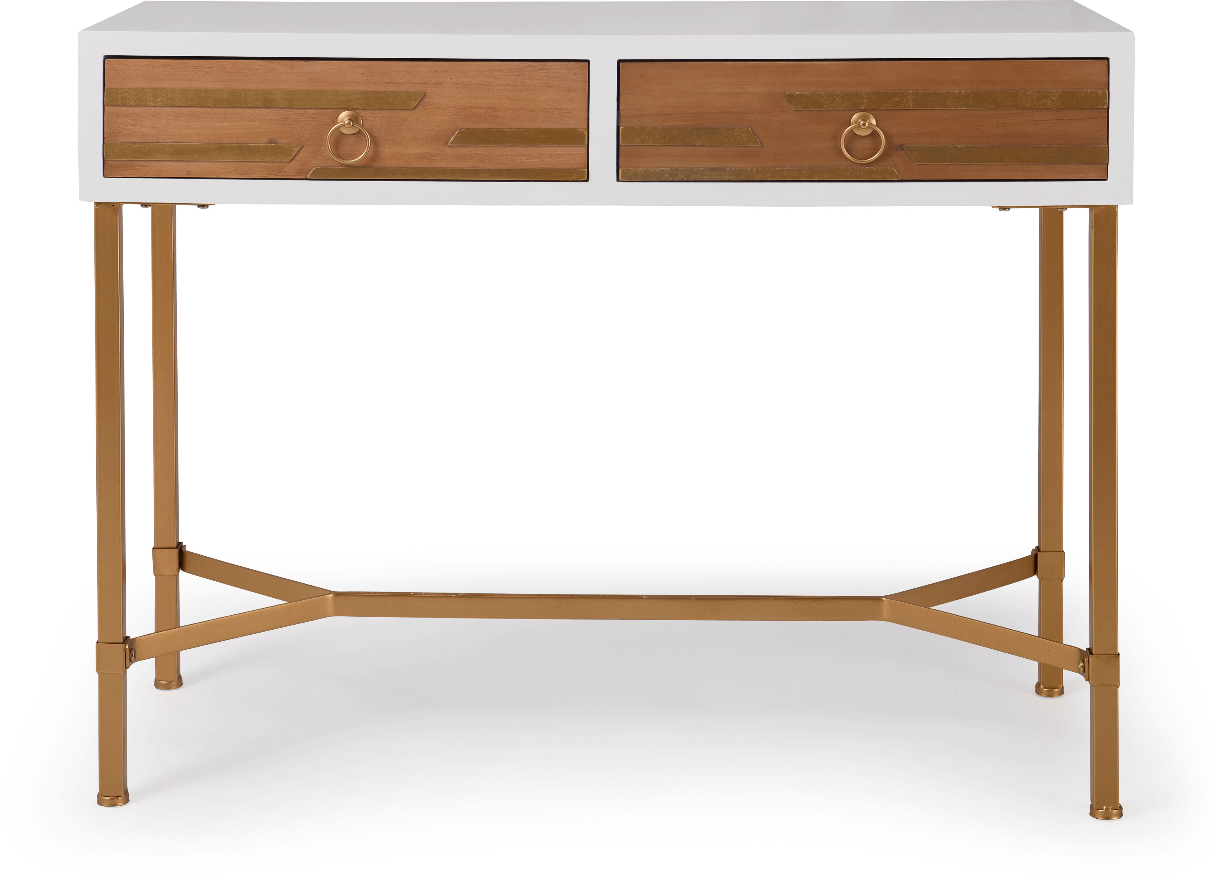 Console tables are a little higher and more narrow than most other tables, making them a great fit for hallways and other tight spaces. This versatile table features a clean white finish and pops of gold to create a fun focal point in your room. The gold metal legs and cross base of this piece finish off the look with a timeless sophistication. You’re sure to love the handy storage drawers and rectangular table top to maximize your space. Features: Handy for holding keys or a vase of flowers to greet your guests, this console table is a welcome addition to any home Styled with clean contemporary lines for a fresh and modern look Crisp white finish brightens up your space Gold metal legs continue the glam look Enjoy display and storage capacity for any space