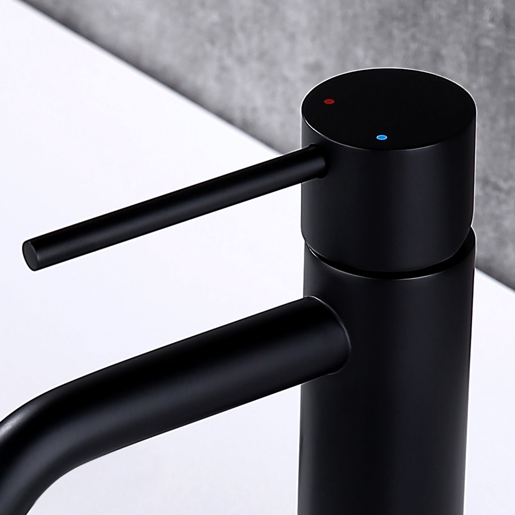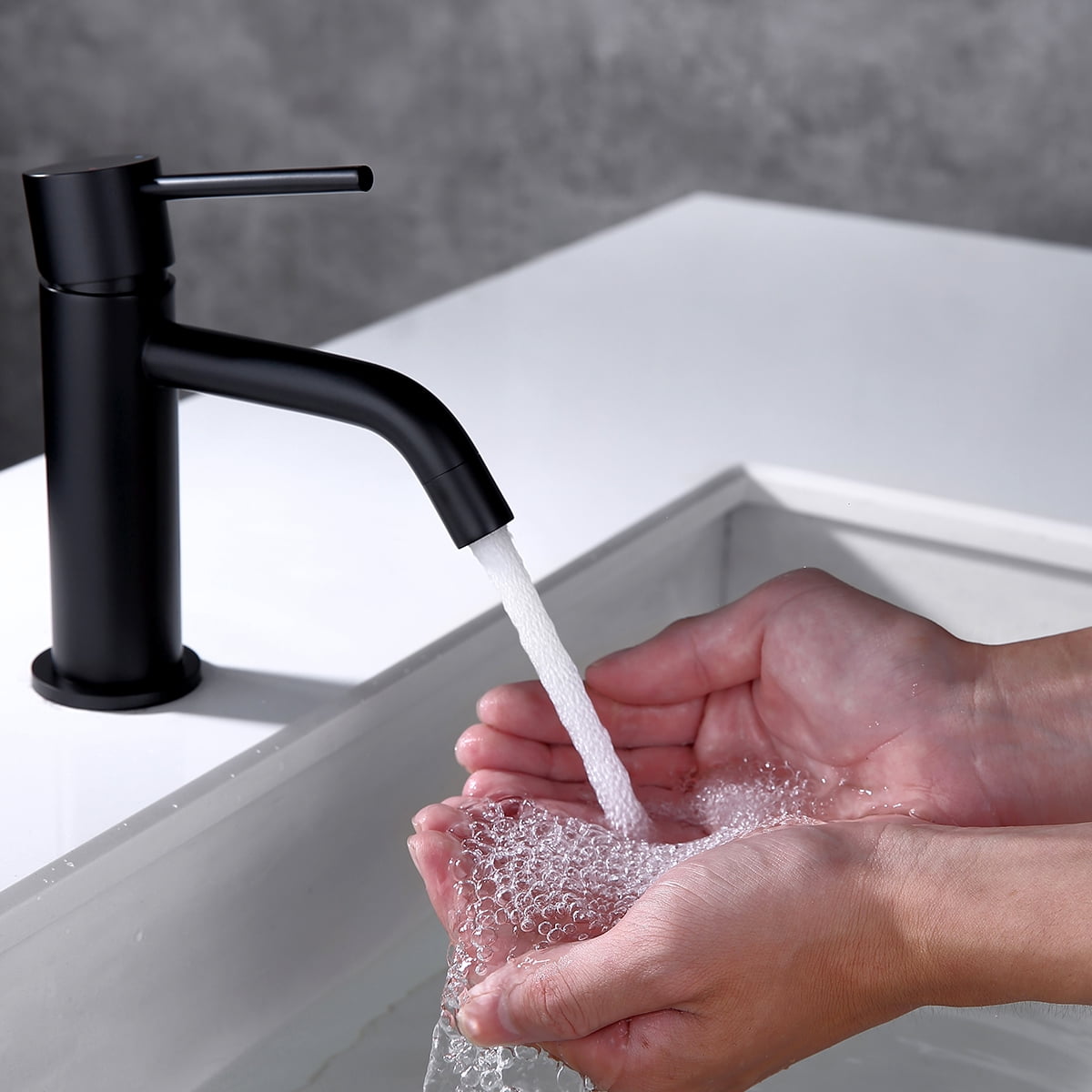 【EXCELLENT USER EXPERIENCE】-Single Hole Brass Matte Black Bathroom Faucet with Pop Up Drain Assembly. 【LEAK-FREE STRUCTURE】-Single handle basin faucet is made of brass construction for maximum durability and also with premium ceramic cartridge longevity guarantee. 【1 HOLE DESIGN】-NO Deck Plated, single hole vessel bathroom faucet is designed to fit 1 hole configurations, require hole size: 1.18-1.38 in / 30-35mm, max counter top thickness without deck plate: 1.38 in/ 35 mm 【HOSE INCLUDED】-Comes with Hot & Cold Water Hoses for stop valves connecting. (Length: 23.6 inch /600mm, Thread: 9/16-24 UNEF standard) 【DESIGN】-American style push pop-up drain assembly fit bathroom vanity sink with minimum drain hole diameter of 1-5/8” easy to install in standard sized plumbing 【EASY TO OPERATE】-Single handle design for precise & effortless control of cold & hot water. Flow rate: 1.2 GPM. CEC listed. Installation Step Slide single hole faucet through the sink mounting hole, please check the hole size for the installation. Min 1-3/16 inch. Place stainless steel washer and rubber washer onto mounting studs under the sink, and tighten the nuts securely as shown. Remember use the screwdriver to tighten the screws which in the nuts both side. Connect and tighten the HOT and COLD supply hose to the valve and check any leakage before use.