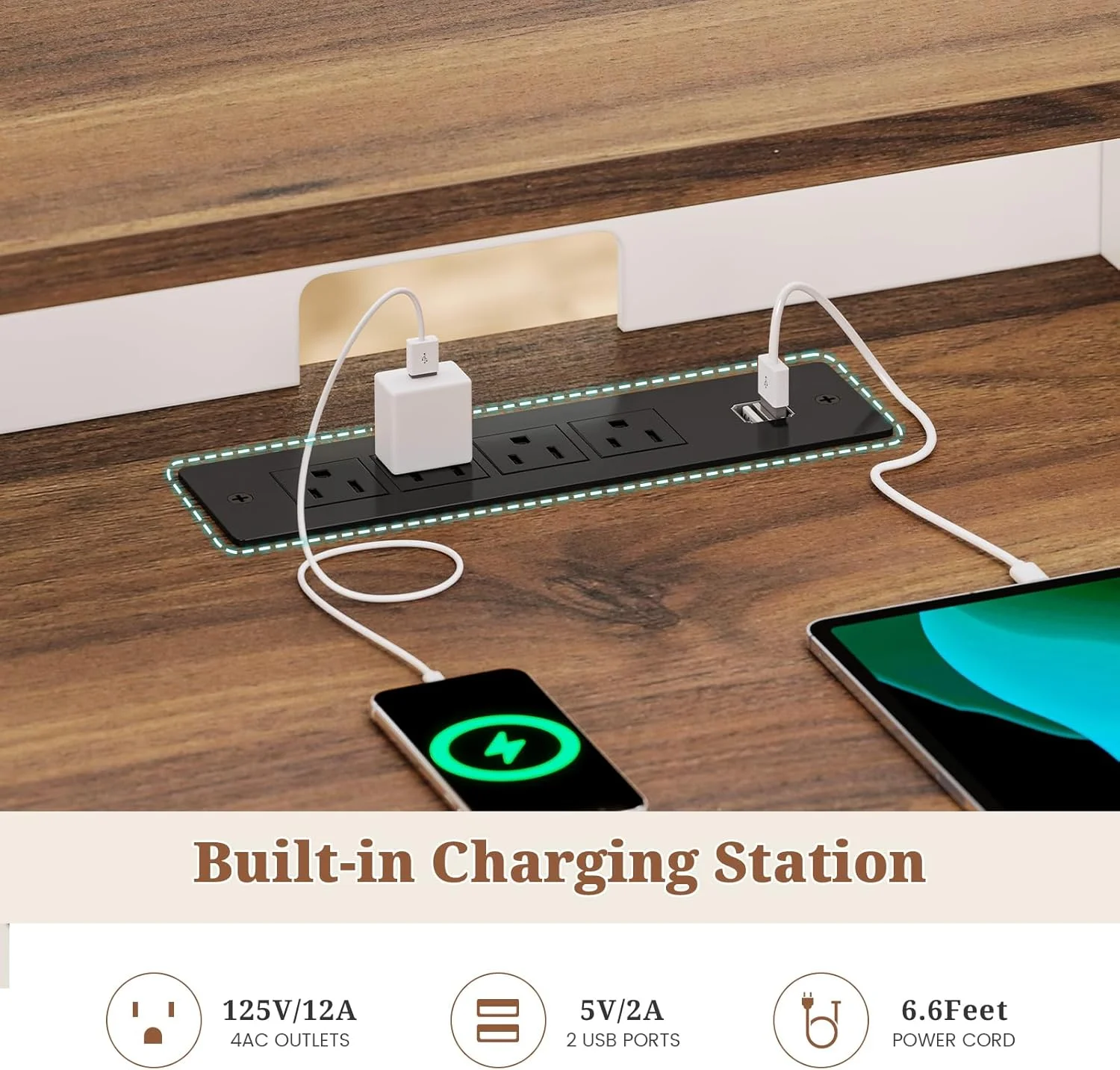 60” Farmhouse Executive Desk with Drawers, Computer Desk with Power Outlet and LED Lights for Home, Office, White