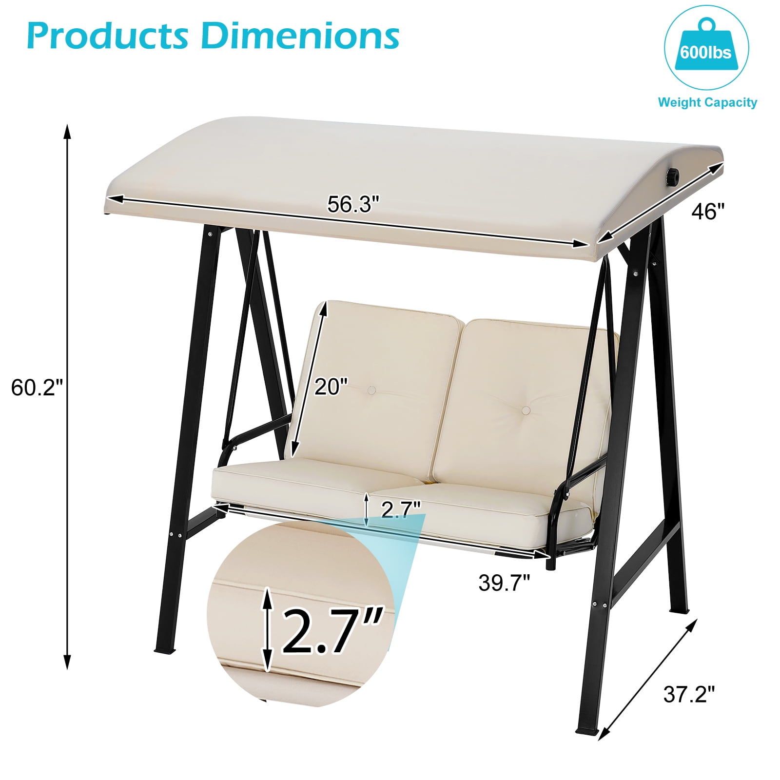More support can be offered by clicking on the below link to purchase a patio swing cover. patio swing cover Stable Structure & Strong Spring Hook: The porch swing has a triangular frame with a powder-coated finish and premium springs connect the swing to the frame in a safe position when swinging back and forth Dual Purpose Canopy: The canopy of this yard swing can be adjusted with an adjustable knob to adapt to strong sunlight in different directions, which can protect you from harmful UV rays. When night falls, the canopy can be used as an outdoor projector screen, giving you and your friends or family a visual feast Thickened Cushions & Dimension: The patio swing has a spacious space with soft and flexible thick backrests and cushions, which will bring you a more comfortable sitting experience Available in All Seasons: 180 g Polyester seat without cushions for extra breathability when sitting in spring and summer; the 2.7-inch thick cushion brings warmth and comfort in the autumn and winter Cozy Swing Chair: The 2-person seat of this canopy swing is designed to allow you and your family or friends to get closer to each other, talk more deeply and have a more intimate relationship Material: Steel & Polyester Fabric Weight Capacity: 600 lbs Cushion Thick: 2.7-inch Overall Dimension: 56.3″ (W) x 37.2″ (D) x 60.2″ (H)