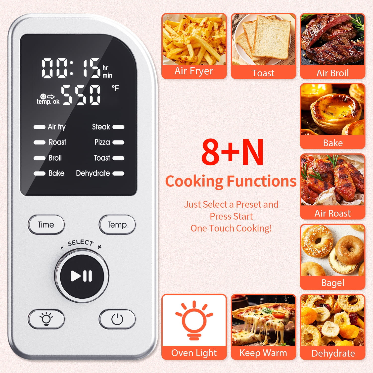 Enjoy 8-in-1 versatility with this powerful 1800-watt appliance that can air fry, air roast, air broil, bake, toast, bagel, dehydrate, and keep warm, all with the touch of a button. Experience maximum tenderness and flavor with the Flavor-Lock technology, which uses precise IQTemp control to cook at accurate temperatures up to 550°F, 40% faster and with 85% less oil than traditional ovens. The large 19QT capacity accommodates a 13″ pizza and up to 9 slices of bread, making it perfect for family-sized meals. Included with the air fryer toaster oven is a cookbook with 40+ original recipes and easy-to-follow instructions, helping you cook like a pro. Cleanup is a breeze with the dishwasher-safe parts, including the basket and crisper plate, so you can enjoy your delicious meals without the hassle of machine cleaning.