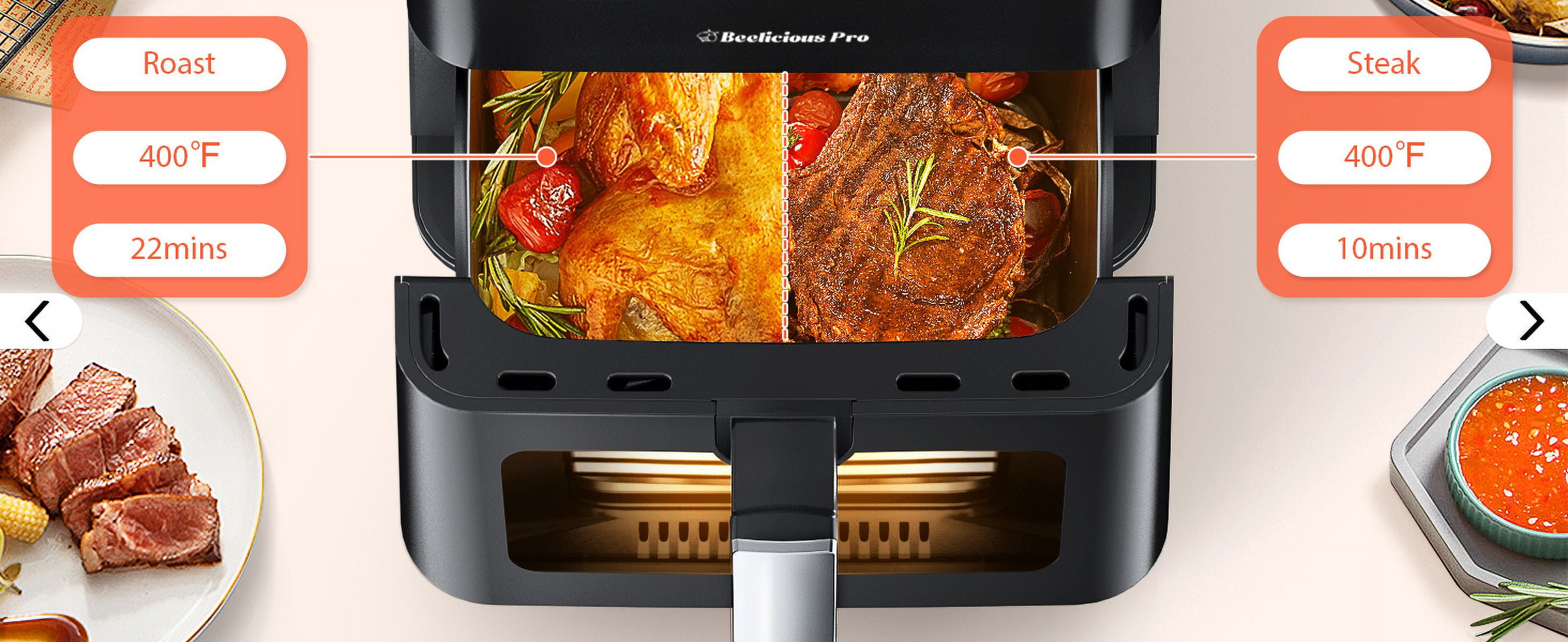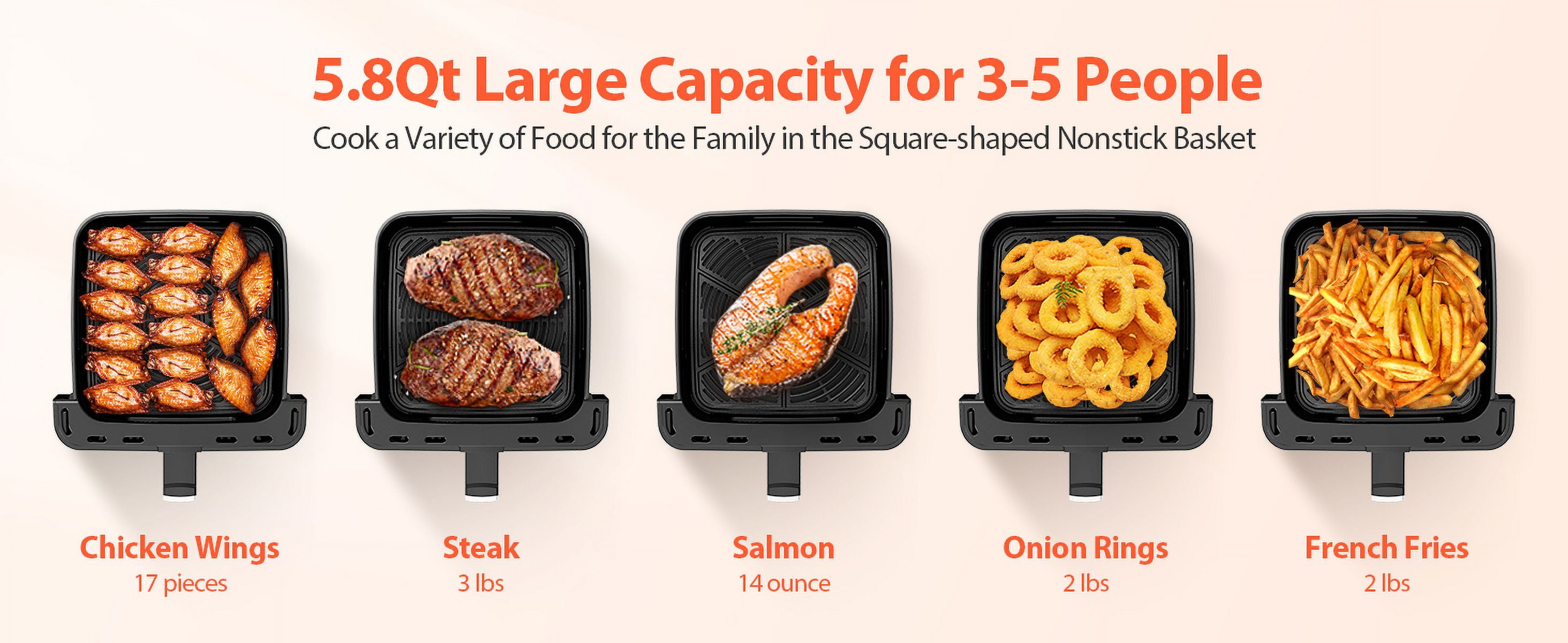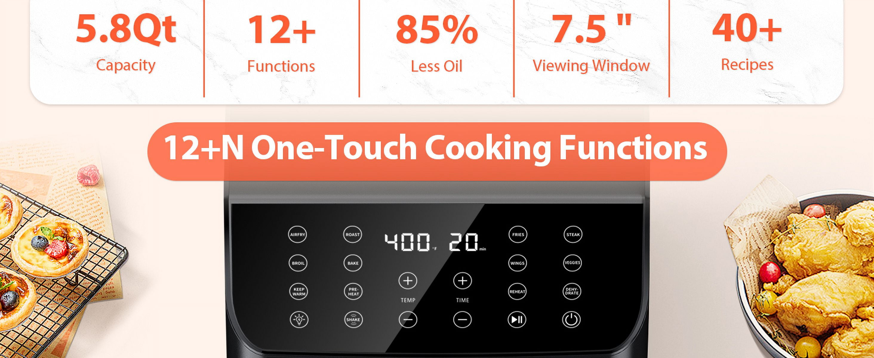 Enjoy a spacious 5.8QT capacity air fryer that can feed a family of 2-5 people. This versatile 12-in-1 digital air fryer offers a wide range of cooking functions, including air frying, roasting, baking, and more. The clear window allows you to monitor your food as it cooks, ensuring perfect results every time. Included are over 40 delicious recipes to try, providing you with endless meal options. Flavor-Lock technology and a shake reminder help deliver crispy, flavorful results with up to 85% less fat compared to traditional ovens. The compact and quiet design makes this air fryer a perfect addition to any kitchen. The dishwasher-safe and nonstick components make cleanup a breeze. This air fryer in a sleek black color is designed to fit seamlessly into your kitchen decor.