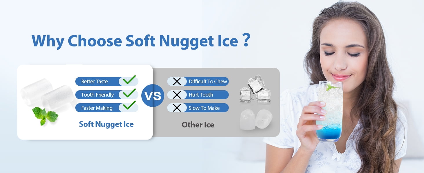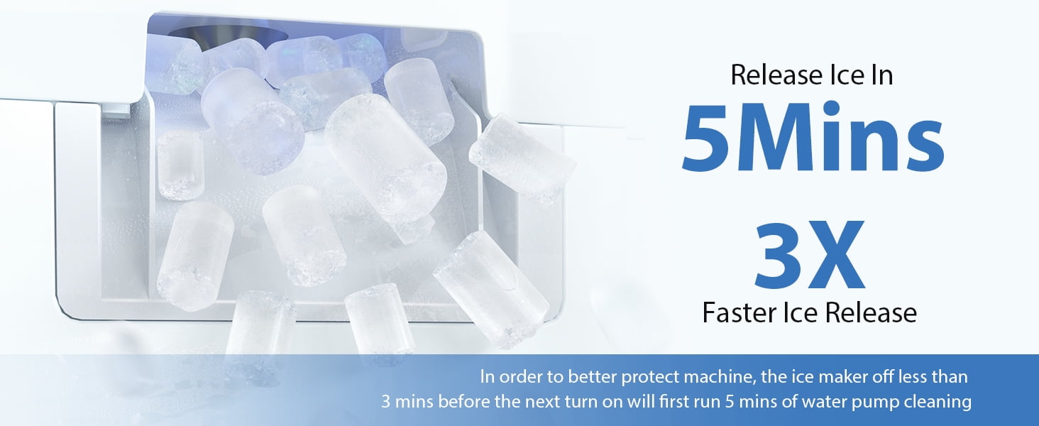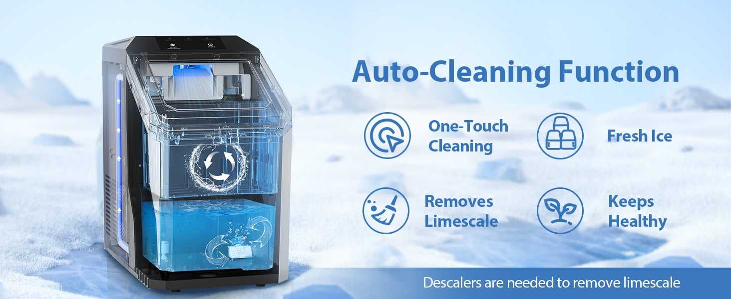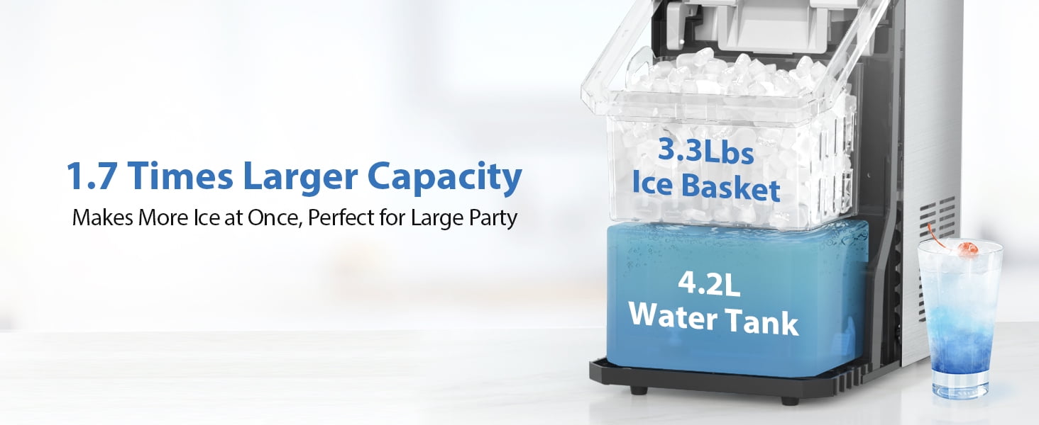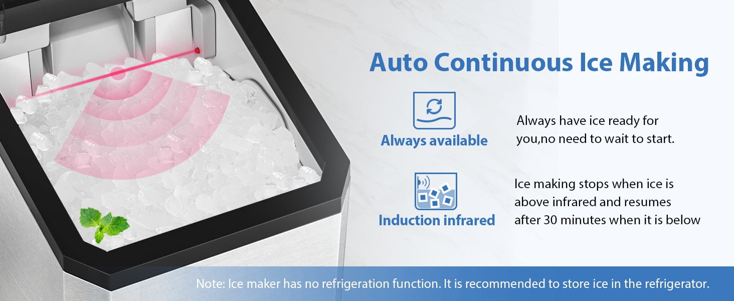 Produces up to 55lbs of chewable, crunchy nugget ice per day, ensuring you always have enough ice for your drinks, parties, and gatherings. Delivers ice in just 5 minutes with the rapid ice release feature, reducing wait times and allowing you to enjoy your drinks and events sooner. Features a large 3.6L water tank and 3.3lb removable ice basket, allowing you to make large quantities of ice with a single fill of water without frequent refilling. Equipped with an automatic ice-making cycle that stops when the ice level is above the infrared sensor and resumes when the level drops below, ensuring a consistent supply of ice. Eliminates tedious cleaning tasks with the self-cleaning function, which activates after pressing and holding the “CLEAN” button for 3 seconds. Enhances the style of your kitchen or home bar with the sleek stainless steel housing.