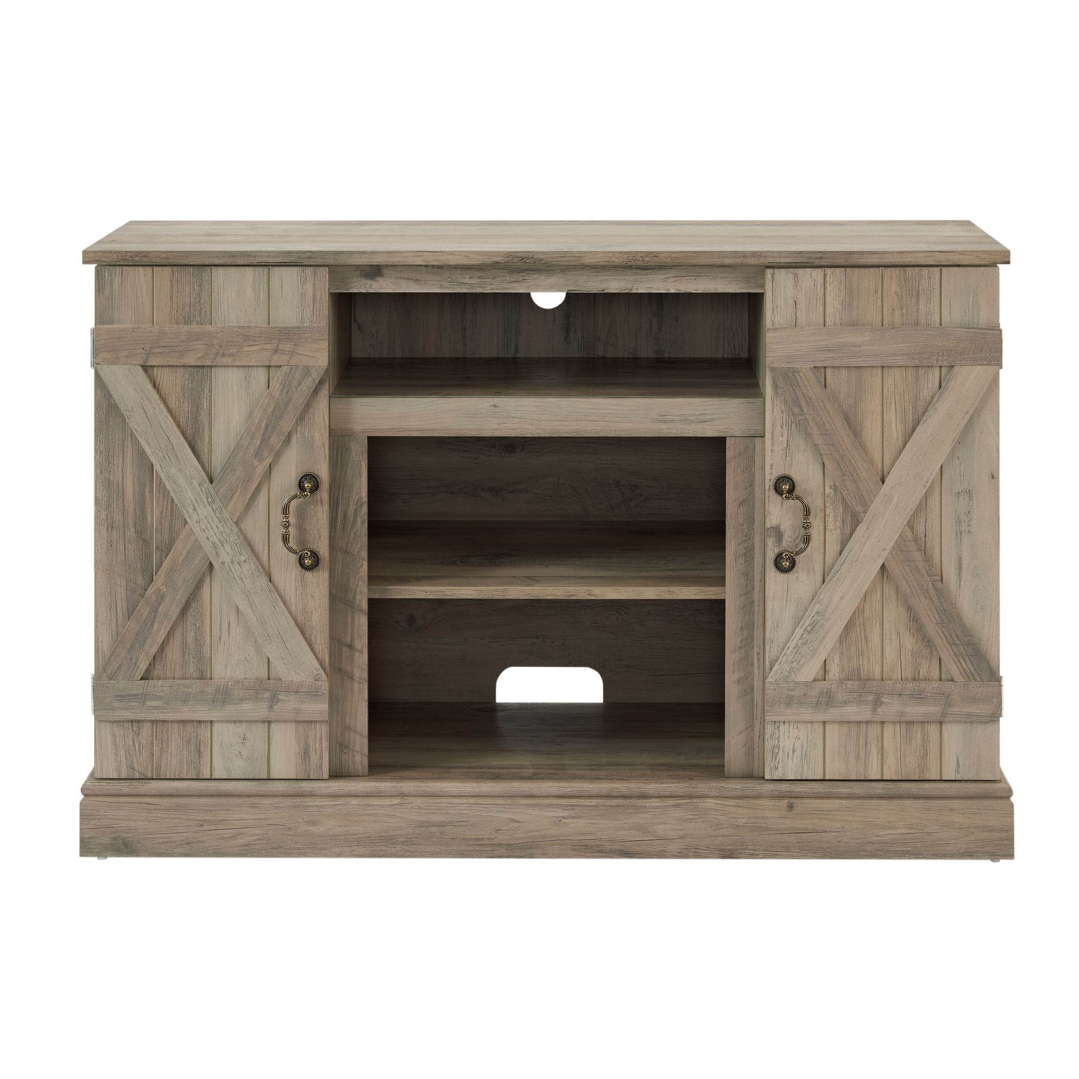 FEATURES: Perfect Fit for TVs Up to 50” – Designed to elevate your entertainment area, this TV stand comfortably holds TVs up to 50 inches, with spacious cabinets and open shelves to neatly organize consoles, DVD players, and other devices. Charming Farmhouse Aesthetic – Bring rustic charm to your home with this farmhouse-inspired TV stand, featuring textured finishes, vintage-style hardware, and classic barn doors that add warmth and character to any living room. Multi-Functional Design – This versatile piece doubles as a sideboard, console table, or buffet cabinet, adapting seamlessly to various spaces and needs, making it a practical addition beyond just a TV stand. Efficient Cable Management – Say goodbye to messy cords with the built-in cable management system, which includes convenient wire holes at the back to keep all your cables neatly hidden for a cleaner, more organized look. Simple Assembly – Set up your new TV stand in under an hour with the included clear, step-by-step instructions. Quick assembly means you can start enjoying your enhanced living room setup without delay. Product Dimension: Overall Size: 47” L X 15.5” W X 30.75” H Overall Product Weight: 84.22 LBS Specifications: Product Type: TV Stands Main Color: Rustic Pine/Antique Oak Frame Material: Wood Frame Detail: MDF; Particle Board Cabinets Included: Yes Number of Cabinets: 2 Shelves Included: Yes Number of Shelves: 3 Adjustable Shelves: Yes Open Compartments: 3 Legs Included: No Number of Cable Holes: 2 Supplier Intended Use: Residential Use Maintenance: Wipe with soft dry cloth Weight Capacity: 150 LBS Assembly: Assembly Required: Yes Level of Assembly: Full Assembly Needed Suggested Number of People for Assembly: 2 Time of Assembly: 1 hour Warranty: Commercial Warranty: Yes Product Warranty: Yes Warranty Length: One Year Full or Limited Warranty: Full