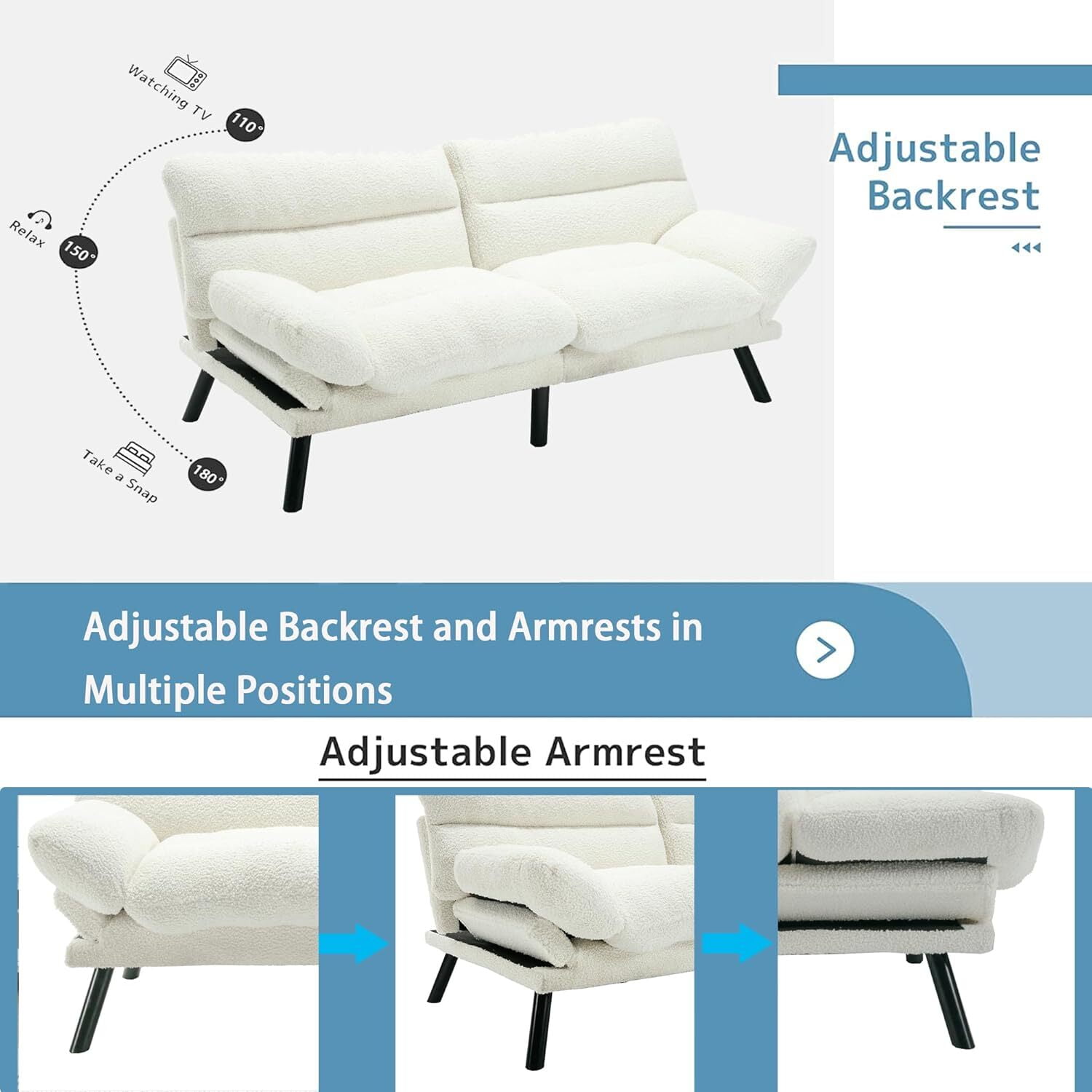 AENKYO Futon Loveseat Sofa Bed 2-Seater, Adjustable Backrest Convertible Sleeper – White