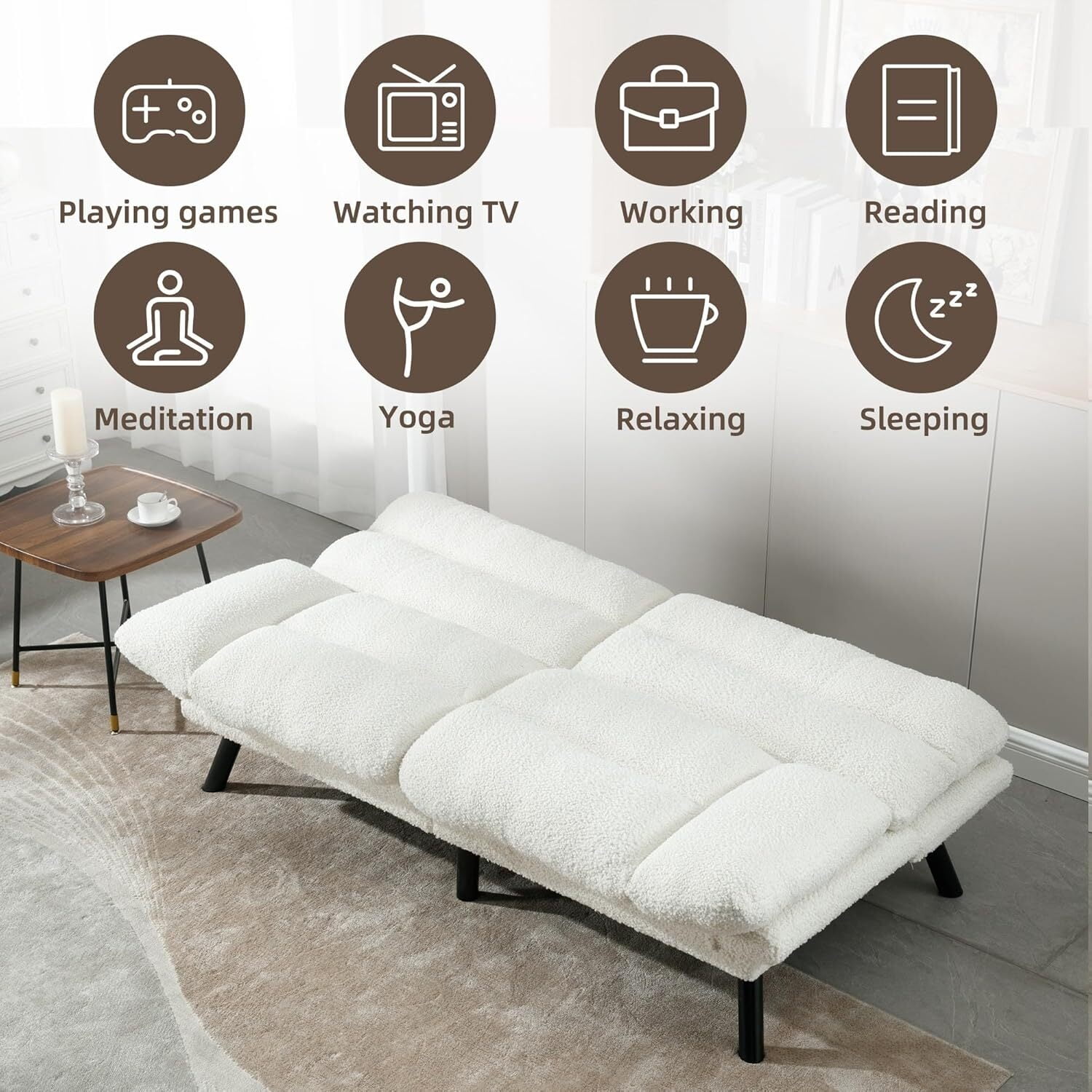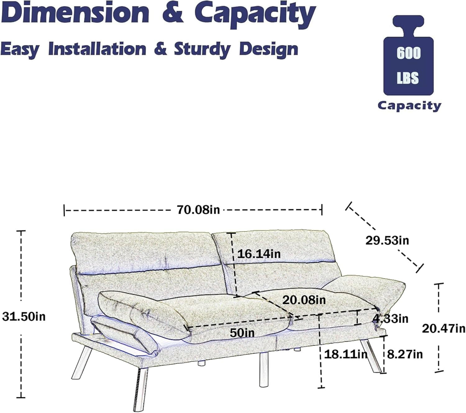 Convertible Futon Loveseat – AENKYO’s space-saving 2-in-1 sofa bed combines modern design with multifunctional use, featuring clean lines and compact proportions ideal for apartments/dorms. The adjustable backrest allows seamless transition between seating and sleeping configurations, while rounded legs add contemporary flair to living rooms or home offices. 3-Position Adjustable Bed – Easily convert from upright sofa (120°) to reclining lounger (160°) or flat double bed (180°) in seconds. This foldable futon loveseat accommodates overnight guests with its 72 sleeping surface, supported by reinforced steel for stability. Perfect as temporary guest bed or space-efficient daily sofa. High-Resilience Support System – Premium high-density foam cushions with breathable fabric cover maintain shape through extended use. The dual-layer comfort system combines 2.5 cooling foam with 4 support base, while rust-resistant metal legs and solid eucalyptus wood frame ensure 600lb weight capacity. Non-slip feet protect floors. Tool-Free Assembly & Maintenance – Quick 15-minute setup requires only attaching metal legs. Removable, machine-washable covers simplify cleaning, while compression-packed cushions regain full shape within 48 hours. Durable double-stitched seams prevent sagging, backed by 2-year structural warranty. Space-Optimized Design – Measuring 72L x 35W x 32, this compact loveseat sofa bed maximizes small spaces without sacrificing comfort. Ideal for studio apartments, college dorms, or office lounges. Includes 6 protective floor glides and illustrated assembly manual. AENKYO’s ergonomic design promotes proper spinal alignment in all positions.