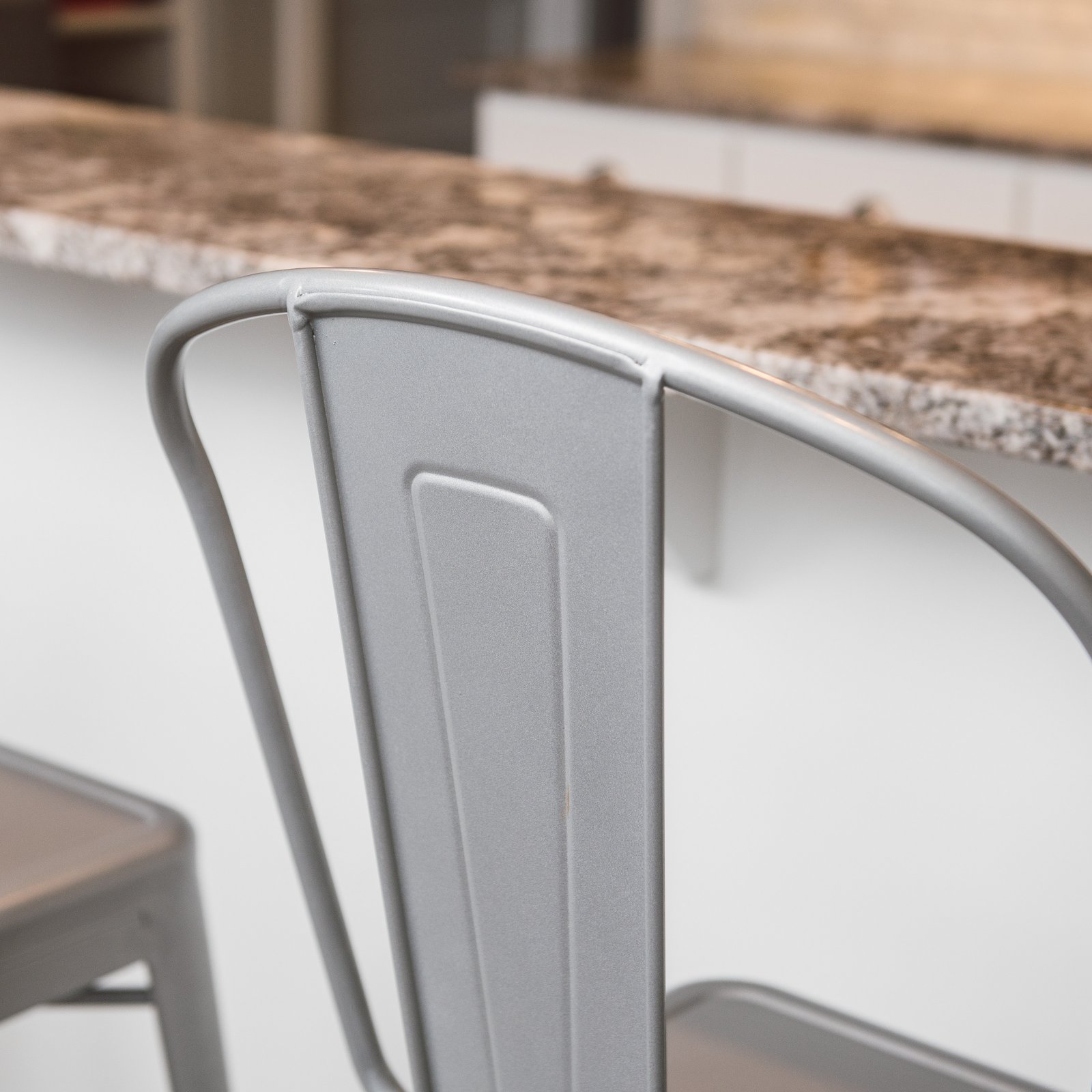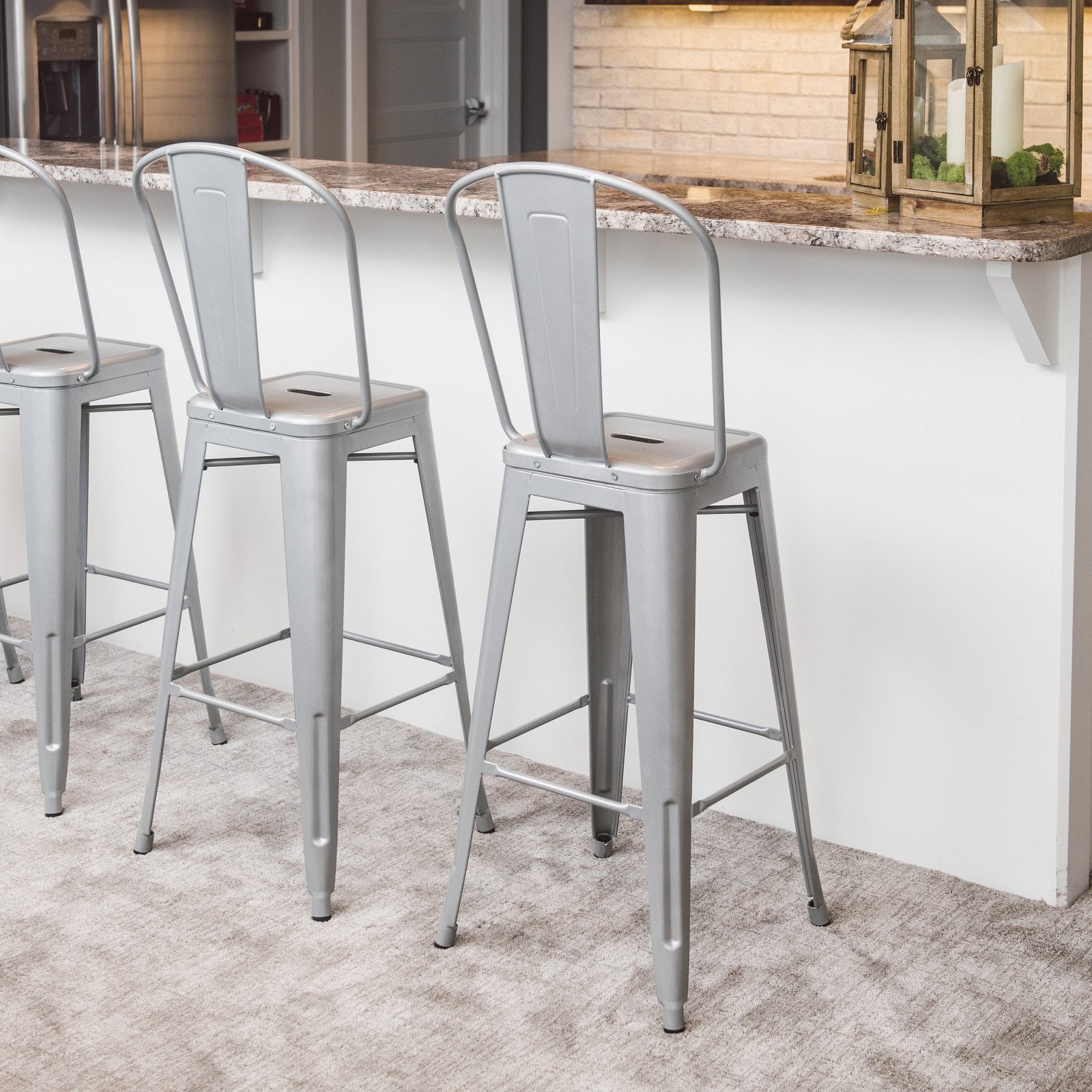 Curved back and non-marking feet Galvanized steel construction Industrial style Silver finish Seat height: 30 inches Dimensions: 17W x 19.5D x 46.5H inches
