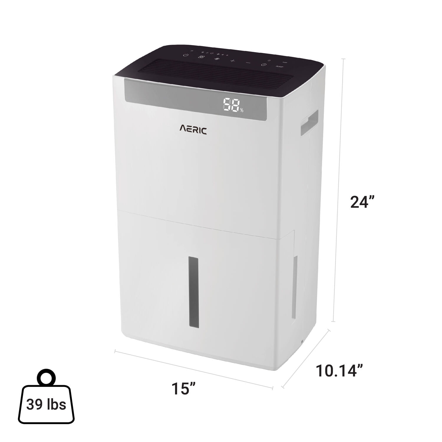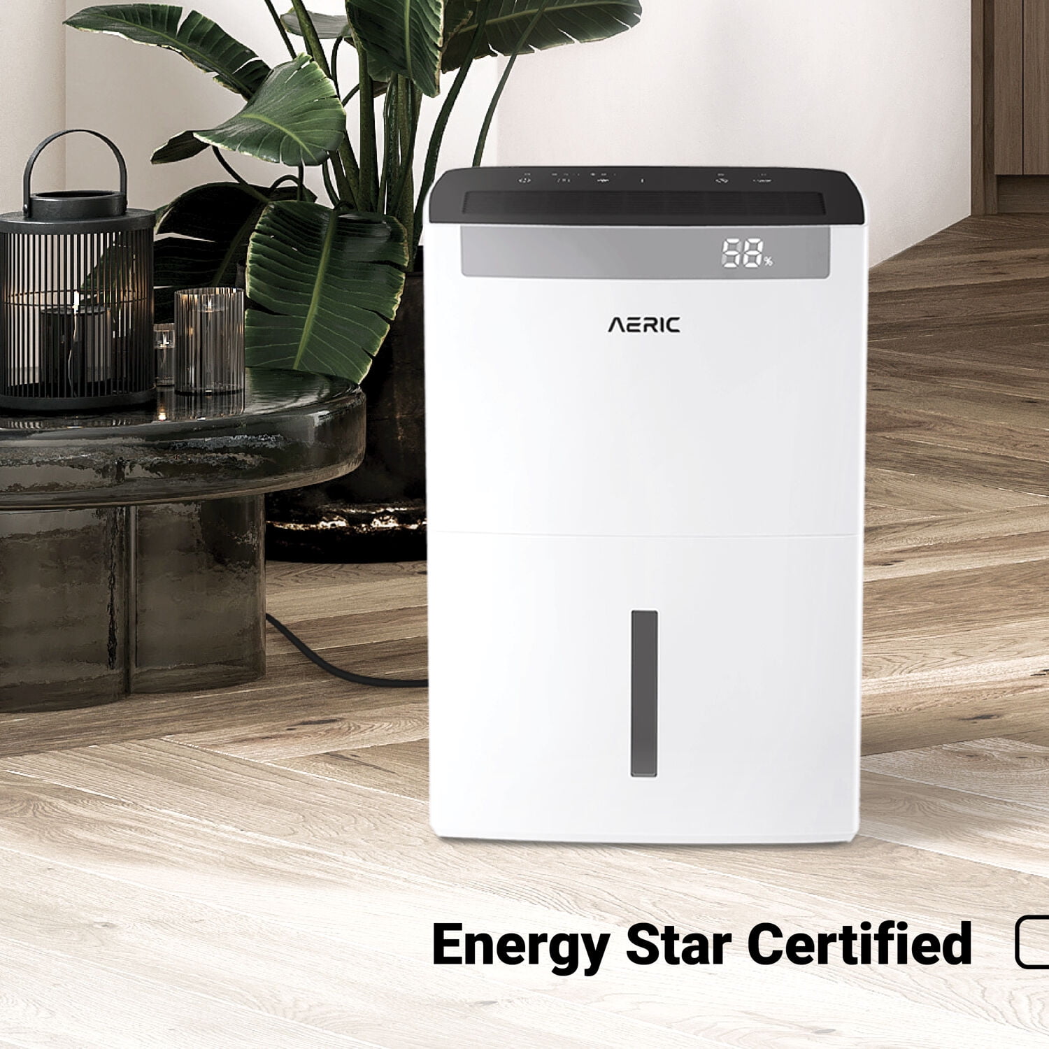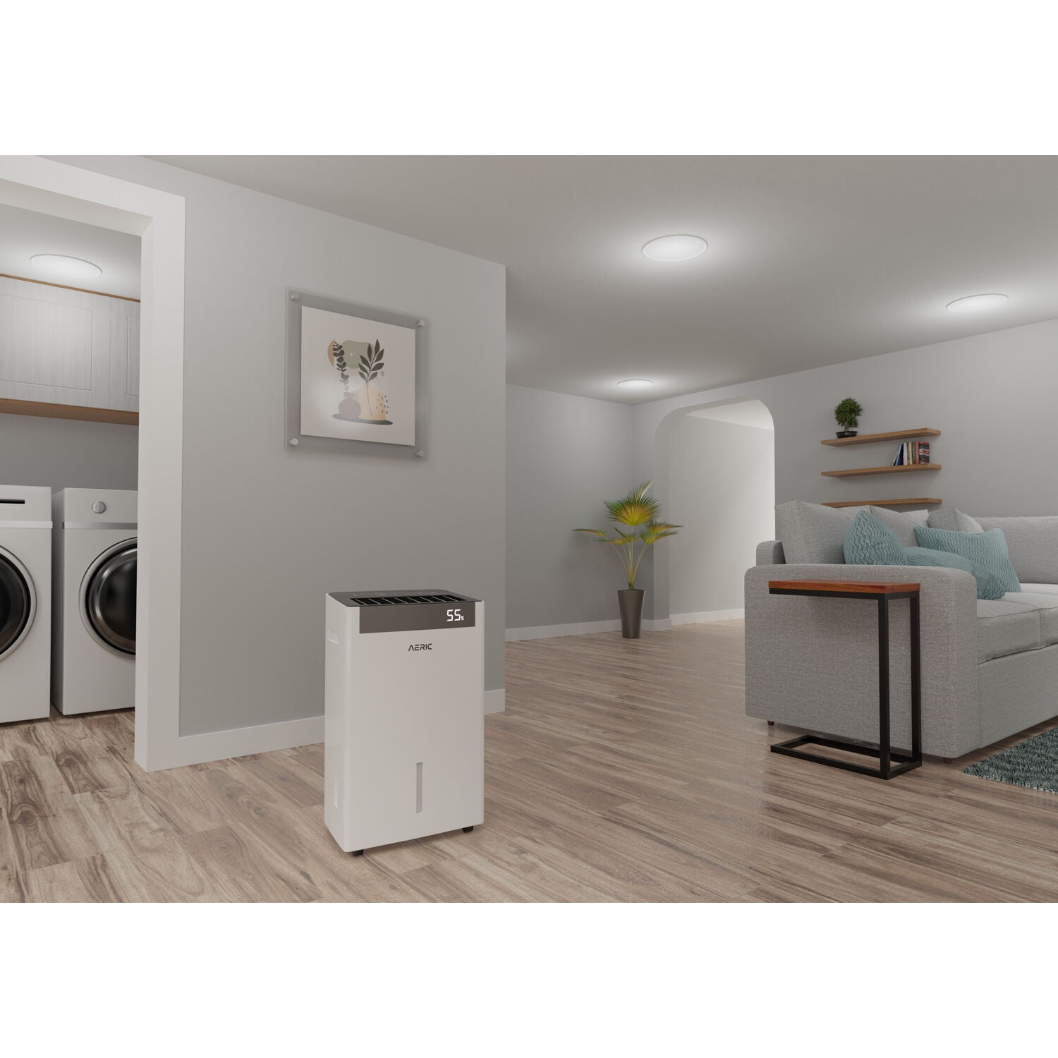 The Energy Star top-rated Aeric 50-pint dehumidifier removes 50 pints of moisture from the air each day, humidistat controls up to 90% humidity, removing dampness and protecting your home from excess moisture. With the touch of a button, the LED digital display allows you to adjust humidity levels for maximum comfort. With a bucket size of 16.7 pints, you will be able to eliminate excess moisture while also not straining to lift and empty heavy buckets. With a compact size and a modern design, the Aeric unit is a subtle and sleek addition to any space. Perfect for garages, basements, bedrooms, and more, the unit makes a significant impact wherever you need it. Enjoy a washable and reusable filter to always guarantee a clean running unit and fresh airflow. Designed with 2 fan speeds and a 24 hour on/off programmable timer, the Aeric dehumidifier works around when you need it most. Aeric 4500 sq. ft. 50 Pint Dehumidifier,1 Piece, White, AERD501P